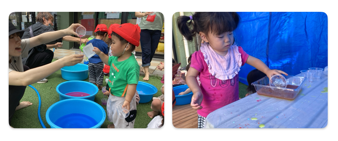 初めて見た色水を不思議そうに見つめ、指差しをしたりして興味深々!