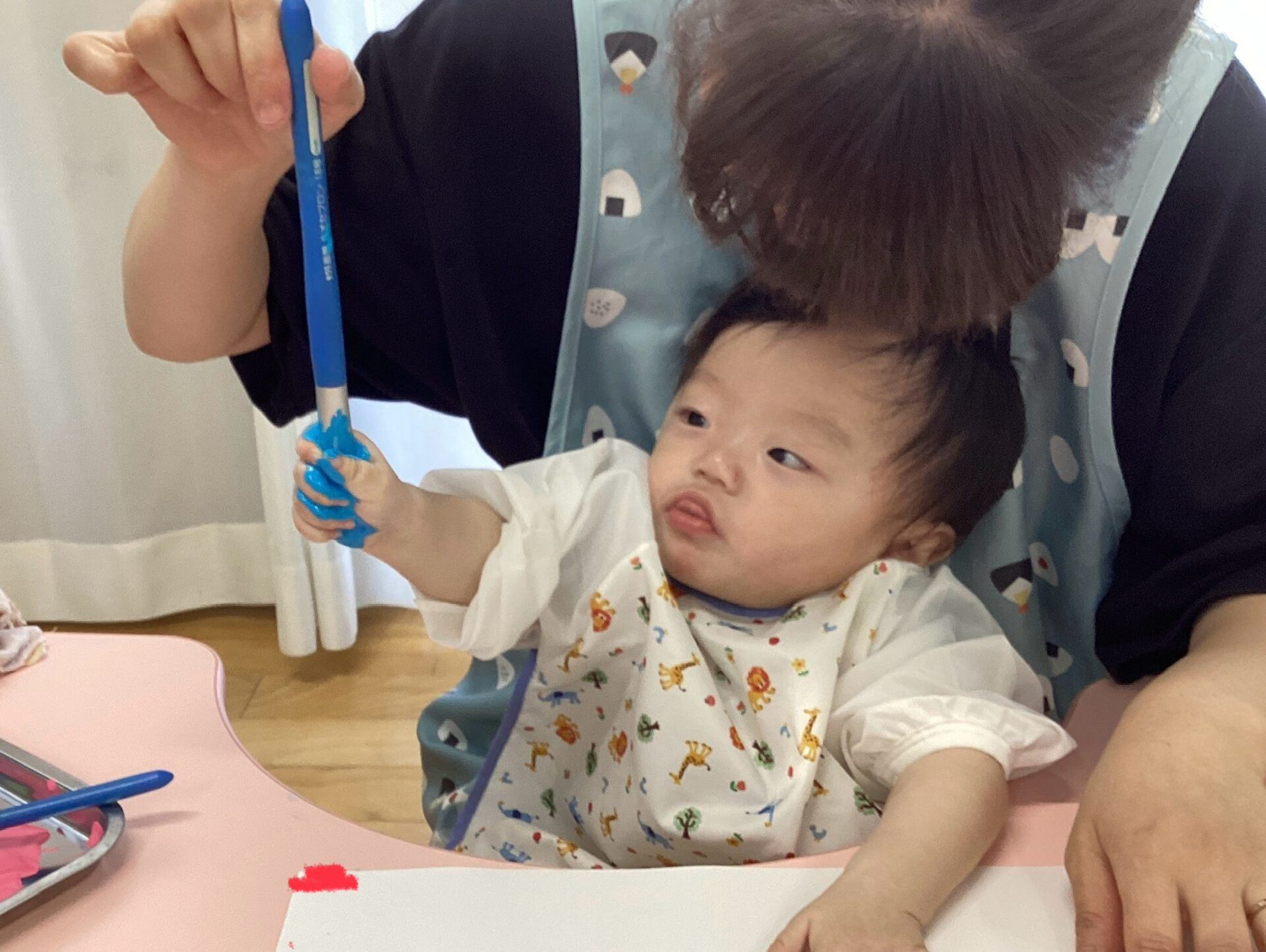 また、別のお友だちは筆の感覚がくすぐったくて思わずギュッ‼️