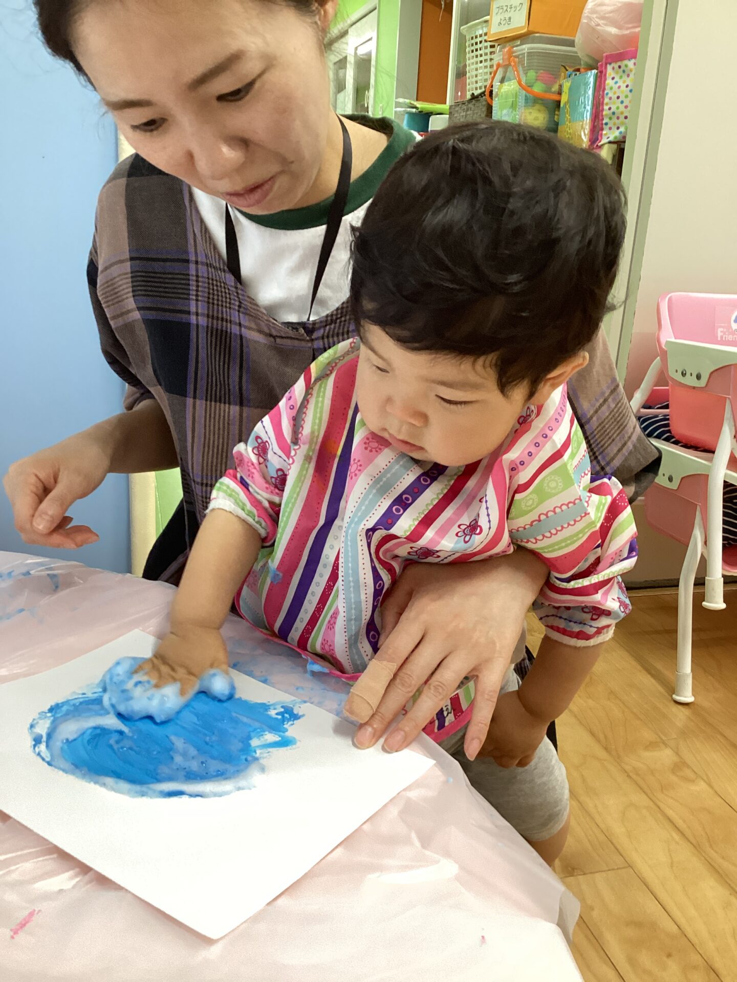 絵の具を手のひらに塗ると絵の具の感触を確かめているのか、不思議な感覚なのか手をじーと見つめるお友だち。手をパー🖐️にしてほしいなーと思ったのですが、力が入ってしまいどうしてもグー✊の手に🤨
