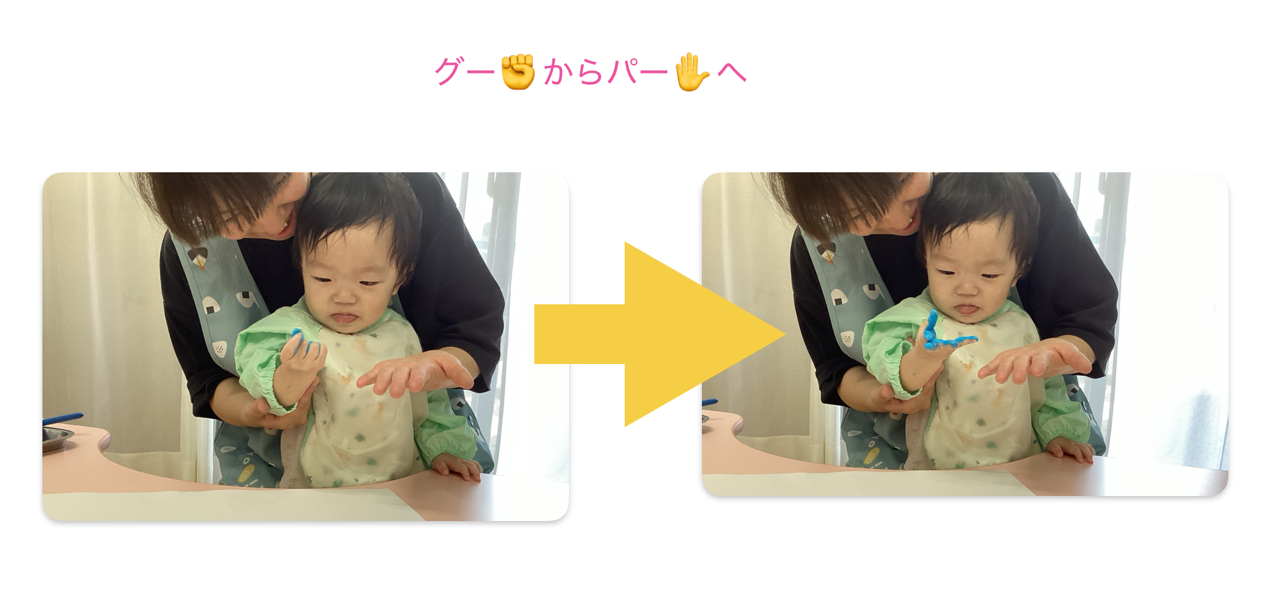 「おててパー✋だよー✨」と声をかけたり、見本を見せながら伝えると、少しずつ手を開きパーに🖐️