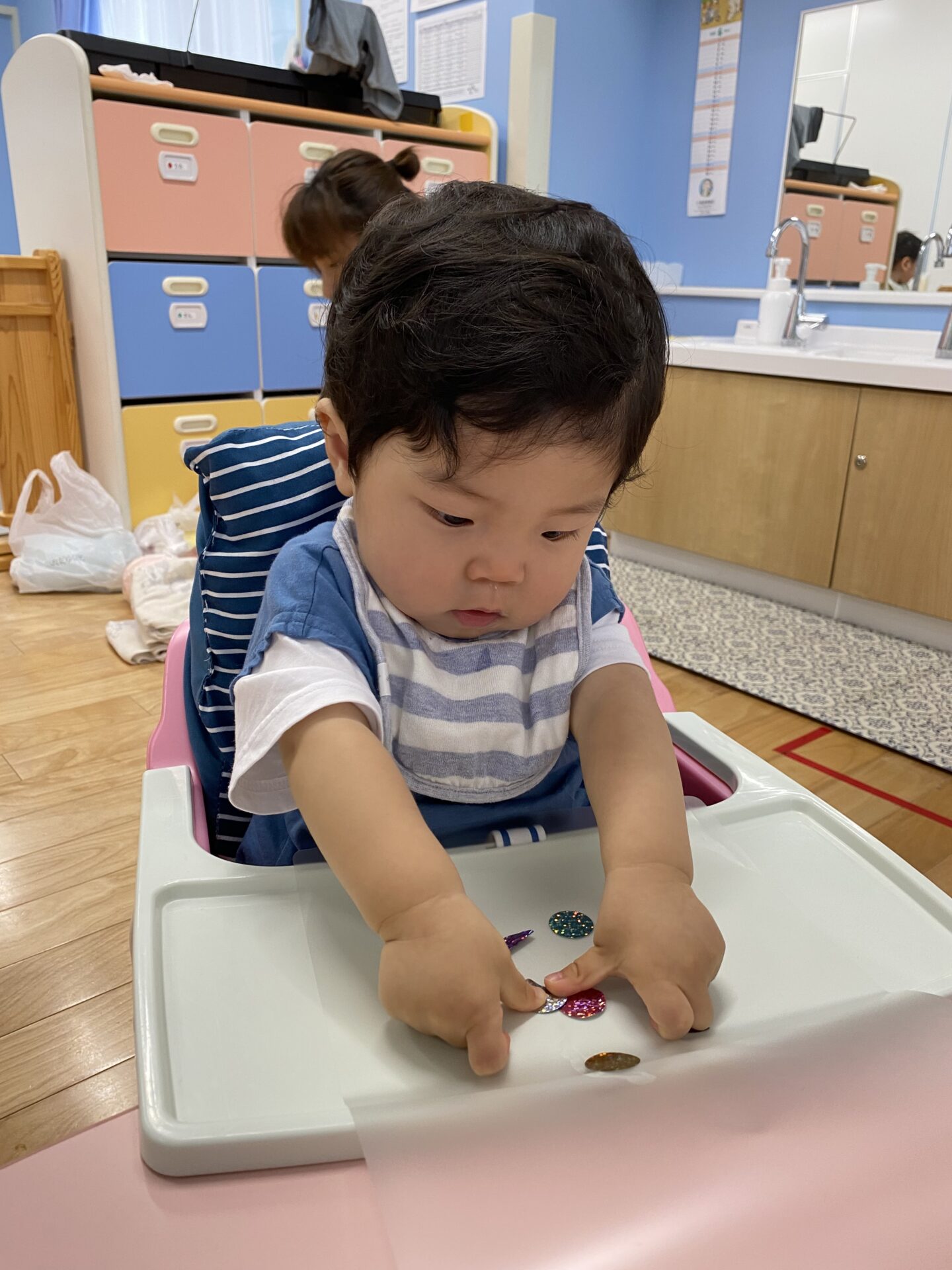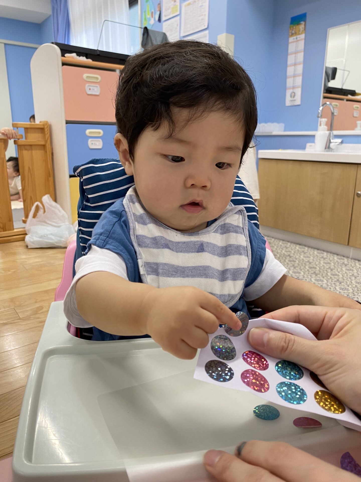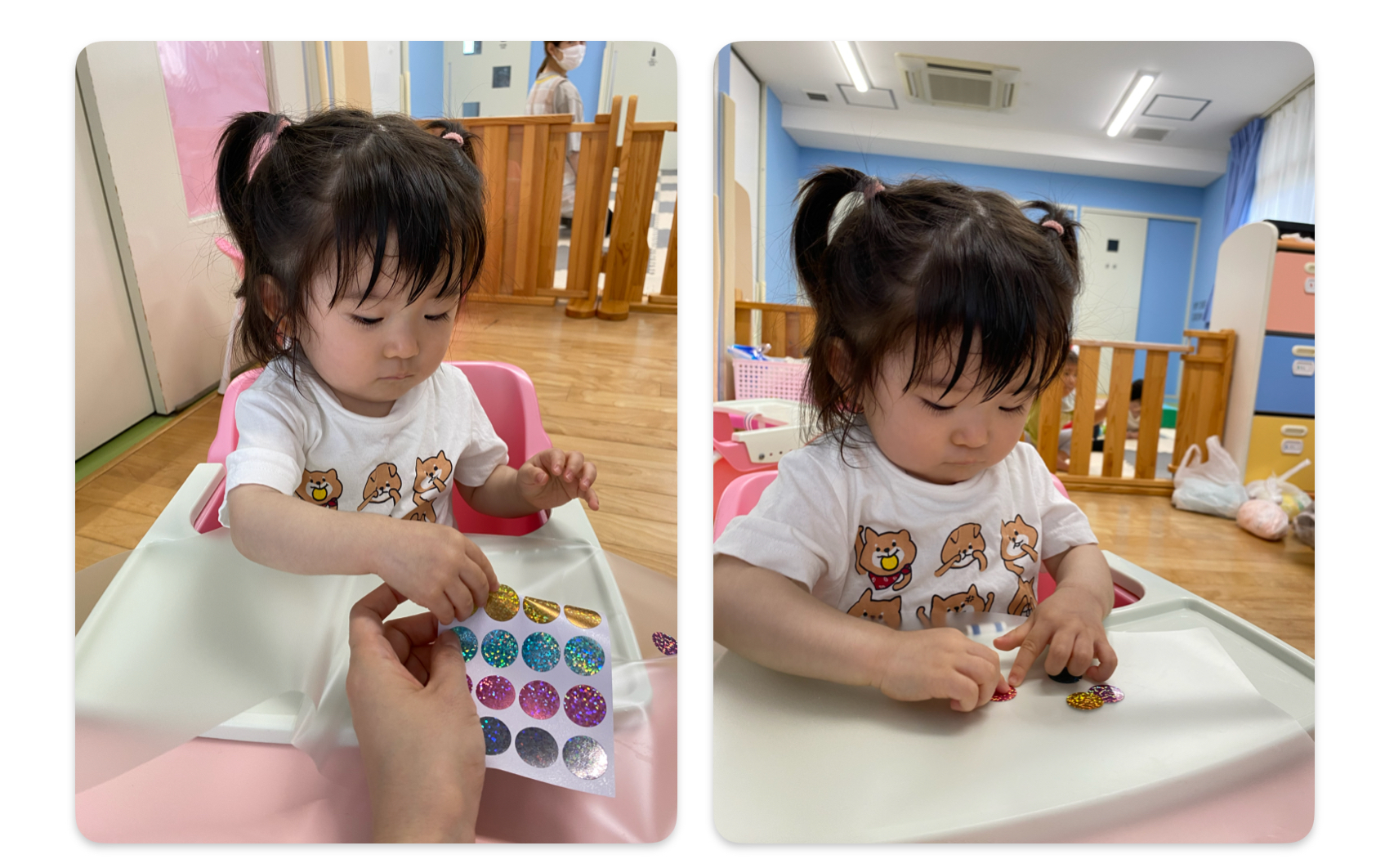 シール貼りでは好きな所に貼ったり、保育者と一緒に貼ることに挑戦しました。中には、シールのペタペタした感触がちょっぴり苦手な子もいましたが、何度か経験するうちに1人で貼れるようになりましたよ🎵