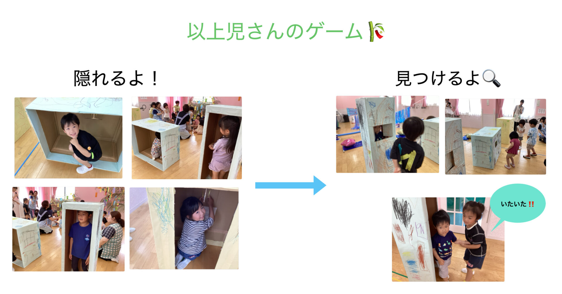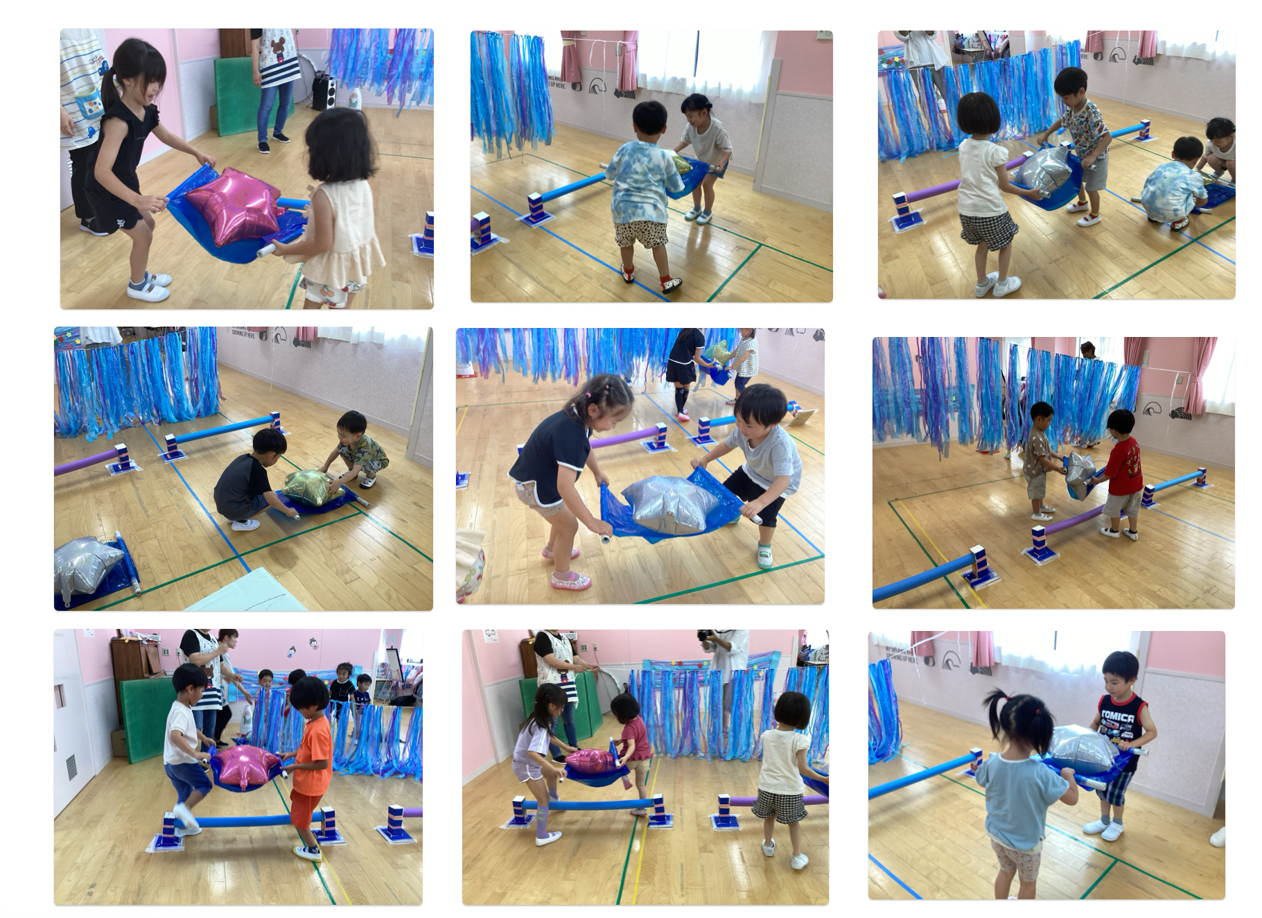 ふれあいデーで大人気だったあのかくれんぼダンボールにひとりが隠れ、ペアのお友だちを探す所から始まります♡出逢った2人は星の風船を小さな天の川に乗せて、ハードルやひらひらカーテンの障害物を乗り越え、神様の所まで運びます💫