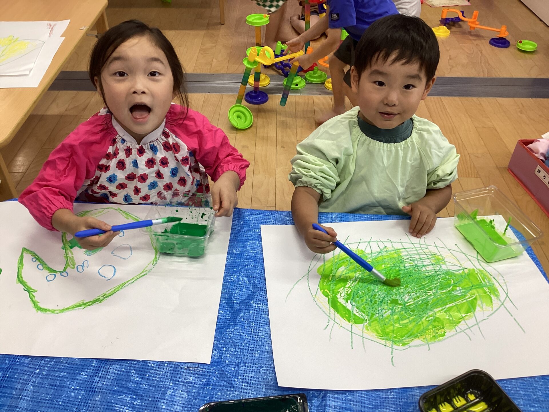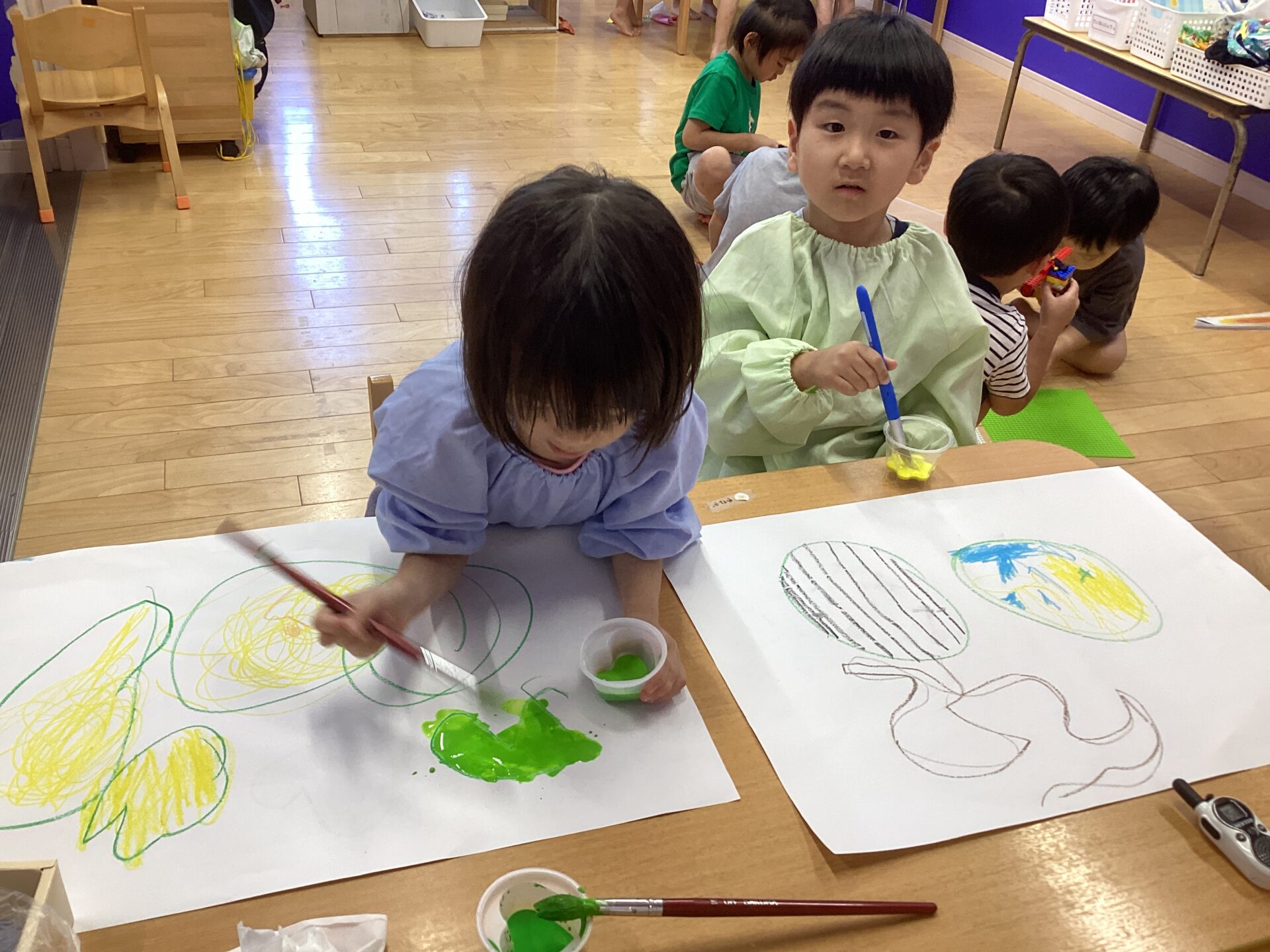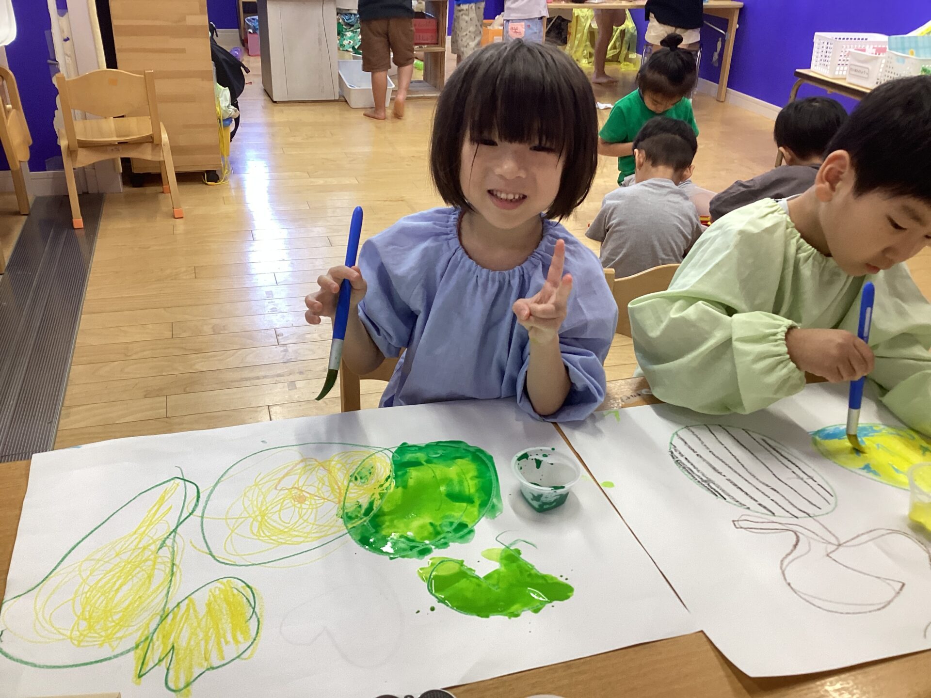 次は、絵の具で色を塗りました。何色かの緑や黄色を用意して自分の思った色を選びました🖌️