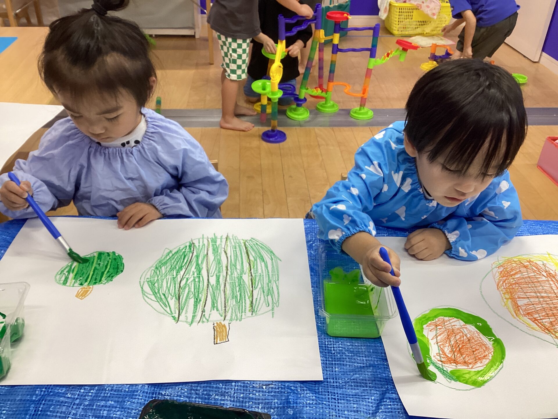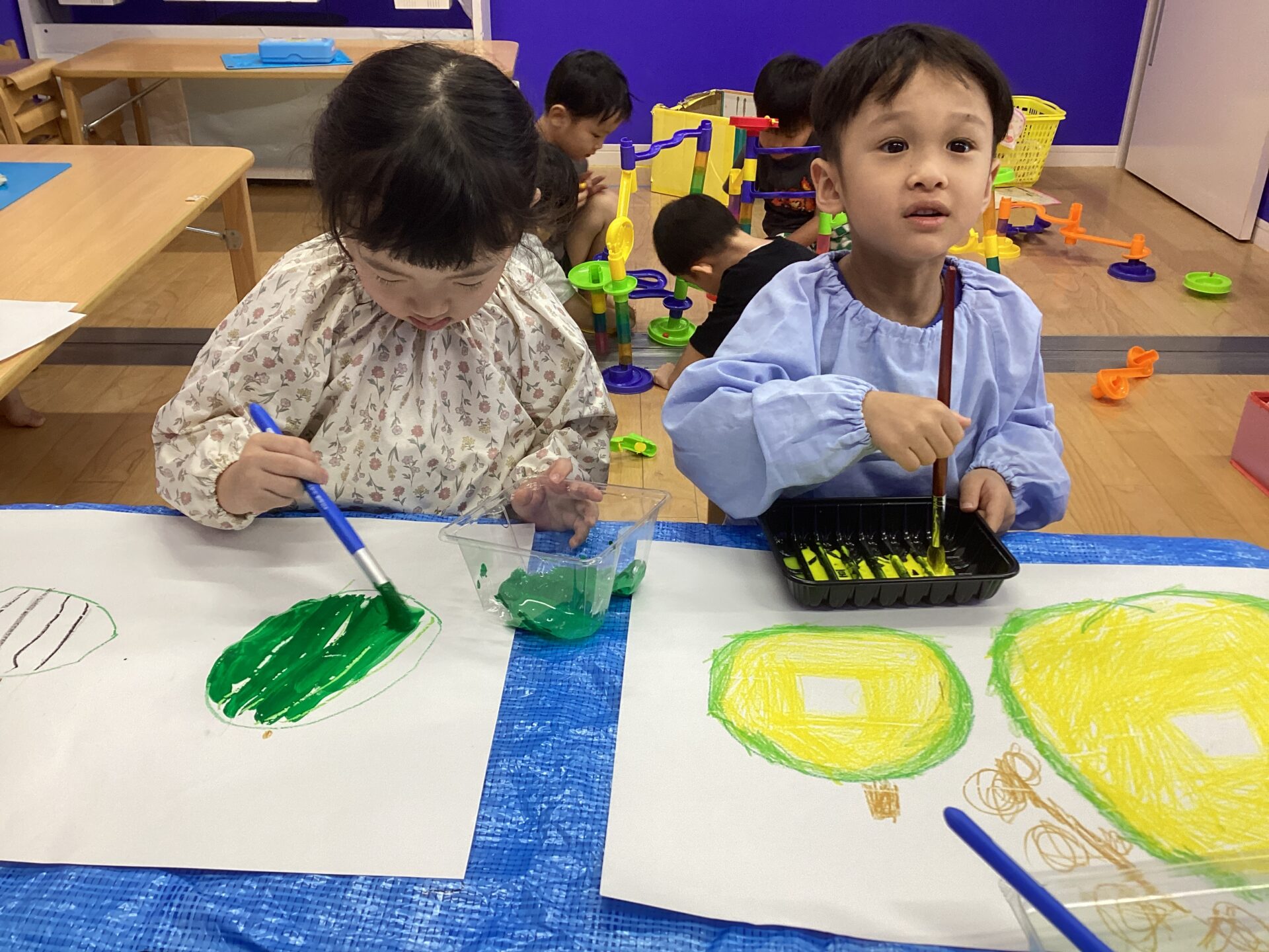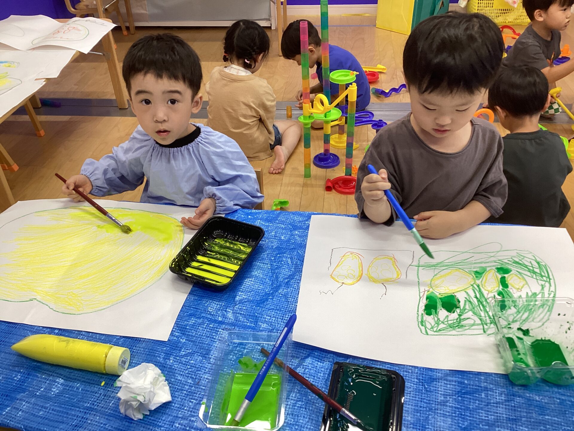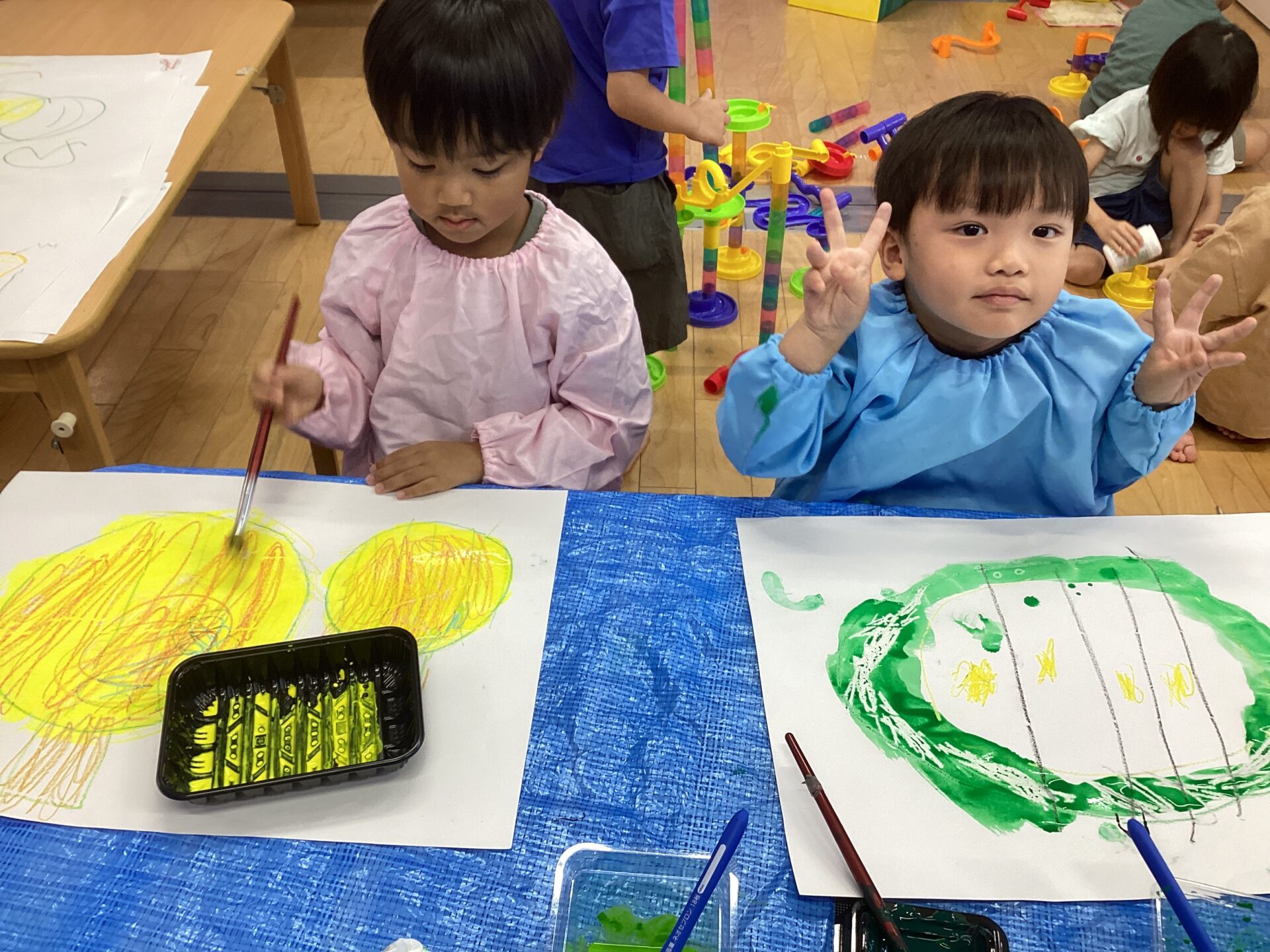 次は、絵の具で色を塗りました。何色かの緑や黄色を用意して自分の思った色を選びました🖌️