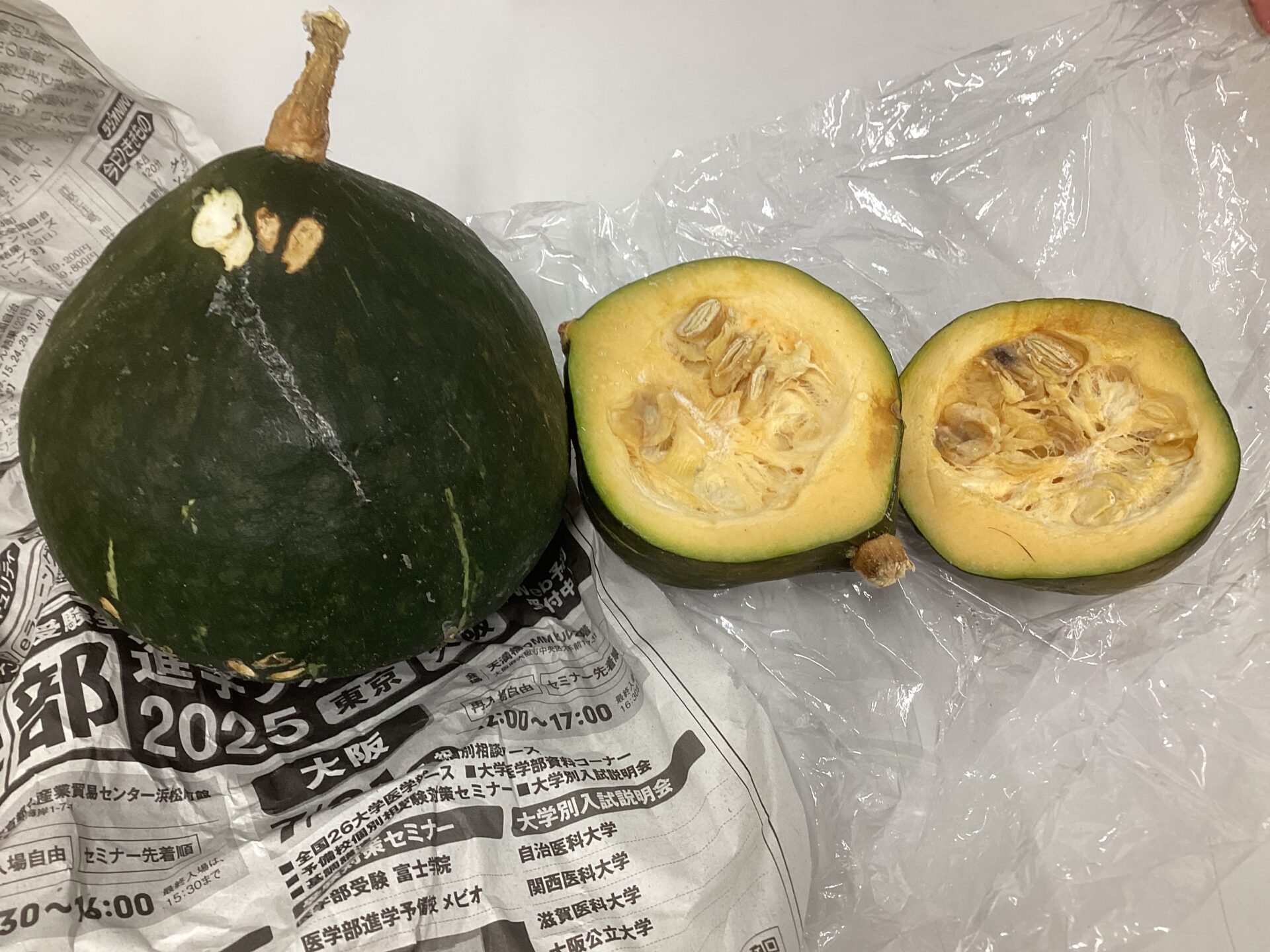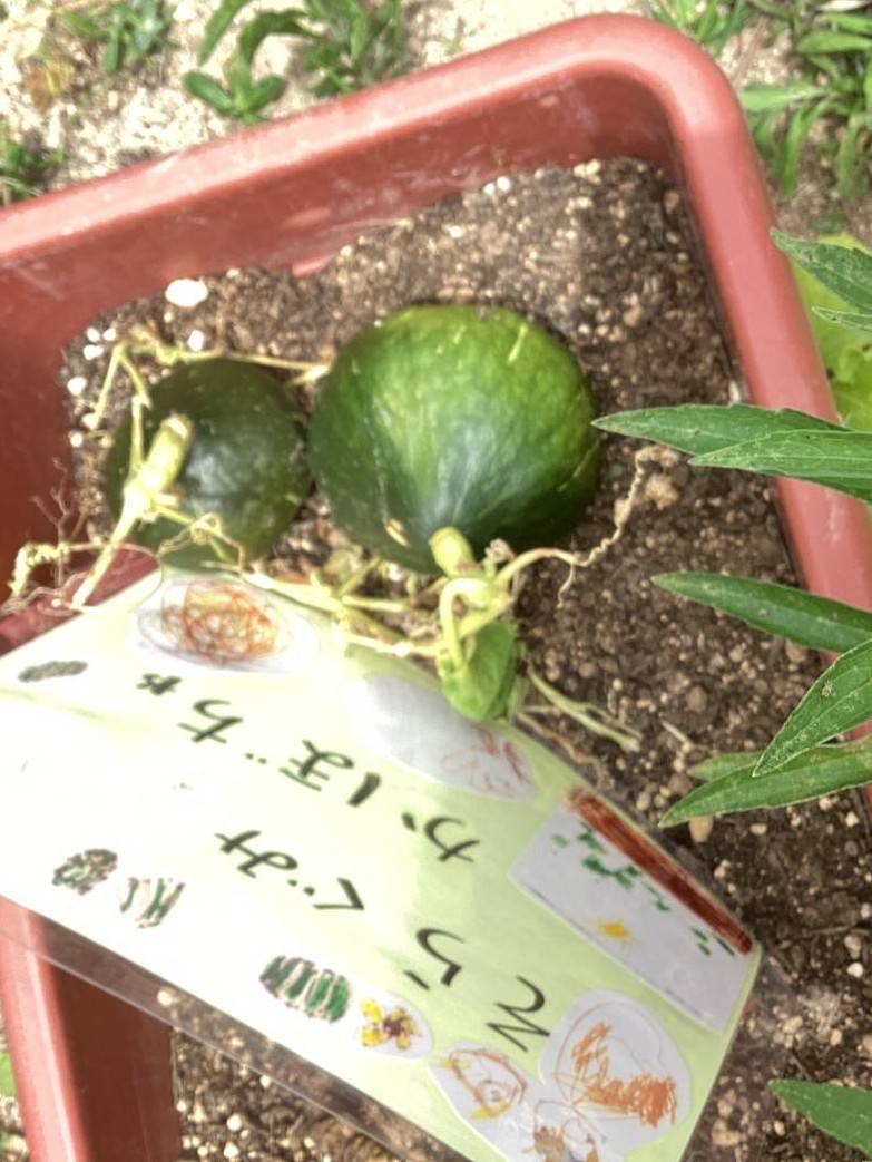 クラス便りでかぼちゃが出来た事をお知らせしました。その後の成長が楽しみだったのですが、この暑さと害虫の被害にあってしまい、この度小さな小さなかぼちゃが2つの収穫で畑終いとなりました…。