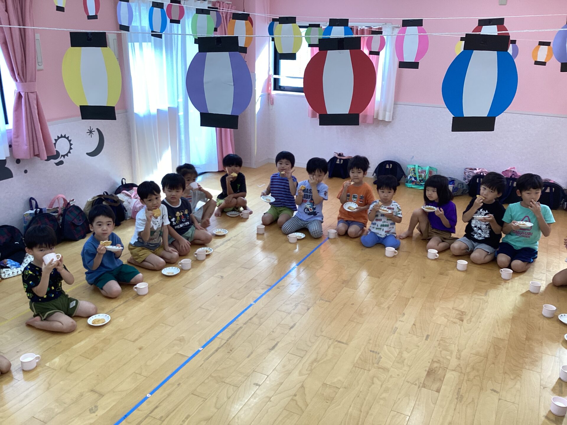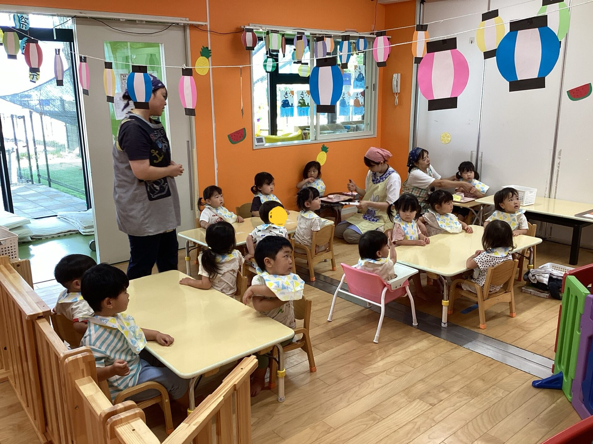 お祭りの準備が行われている中、子どもたちは午睡から目覚め、