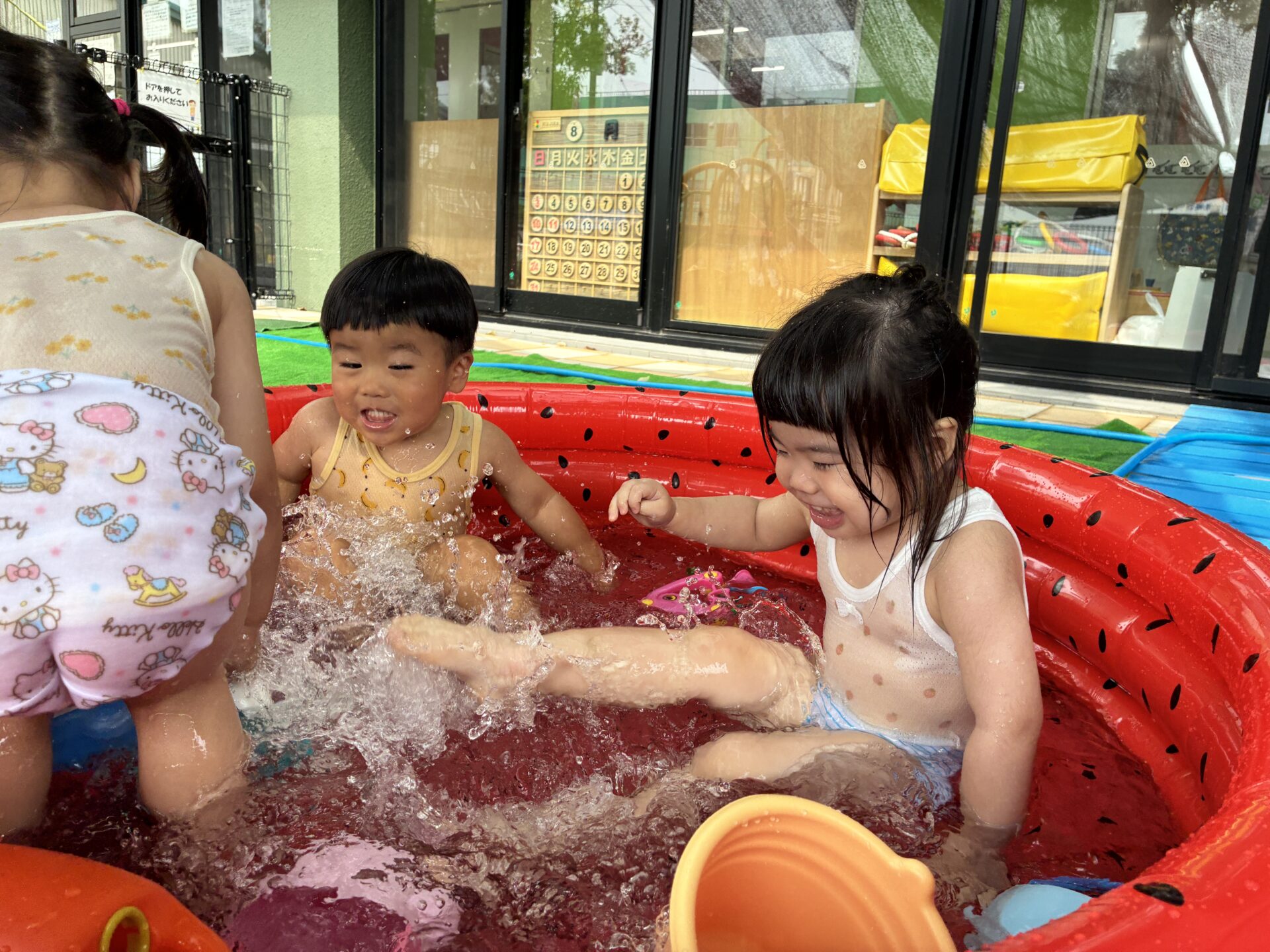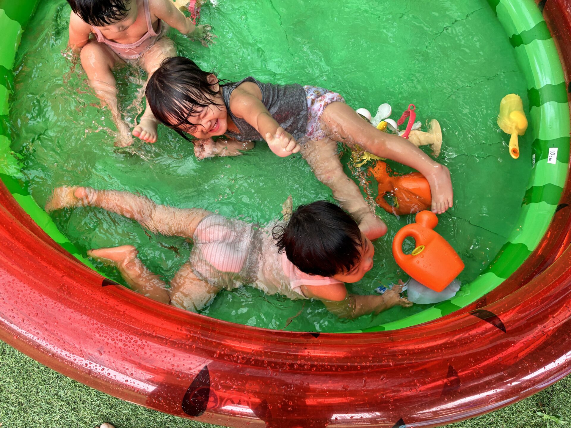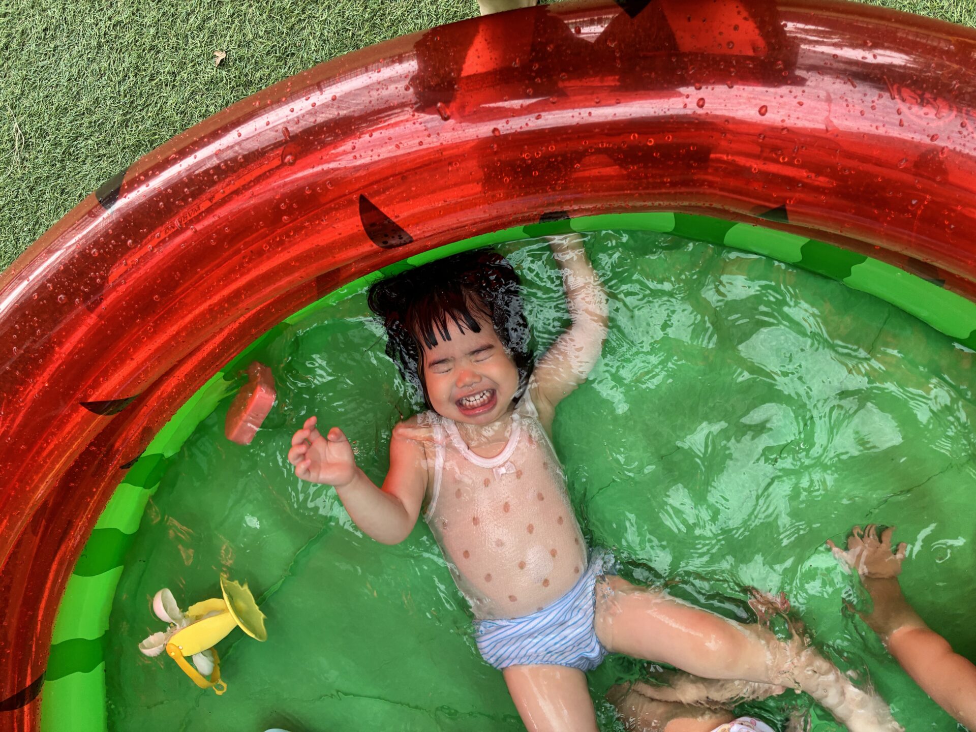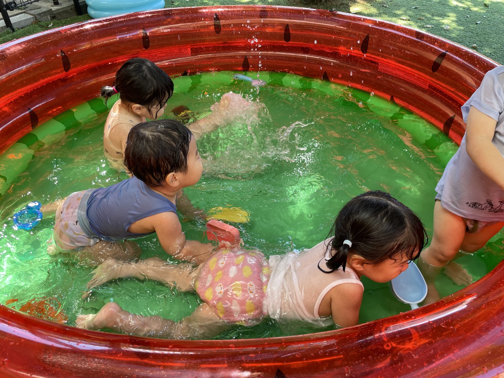 少し前から準備されていたすいかの模様が描いてあるビニールプールをみては