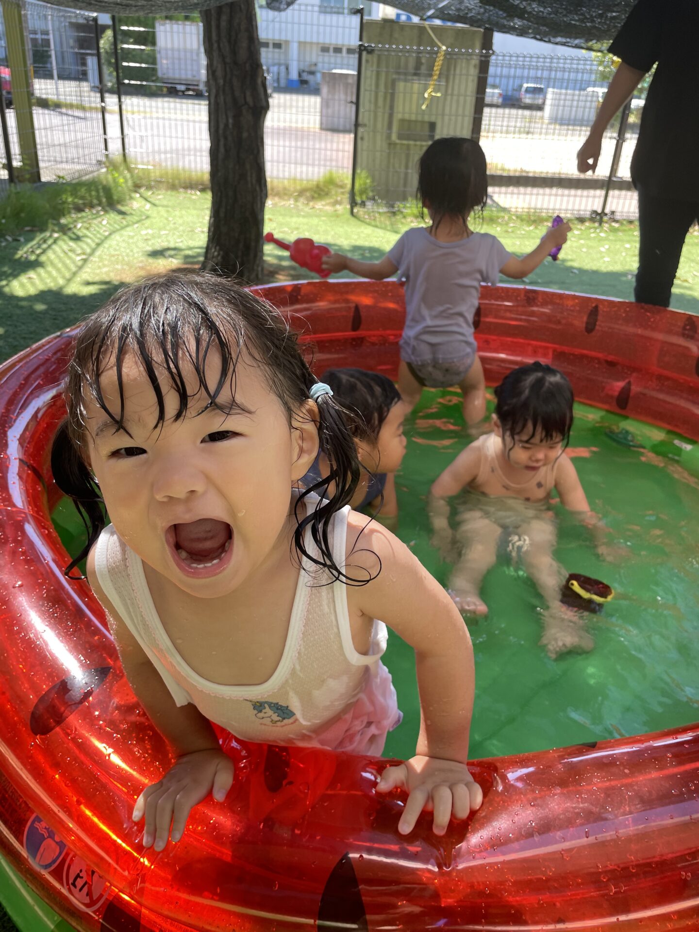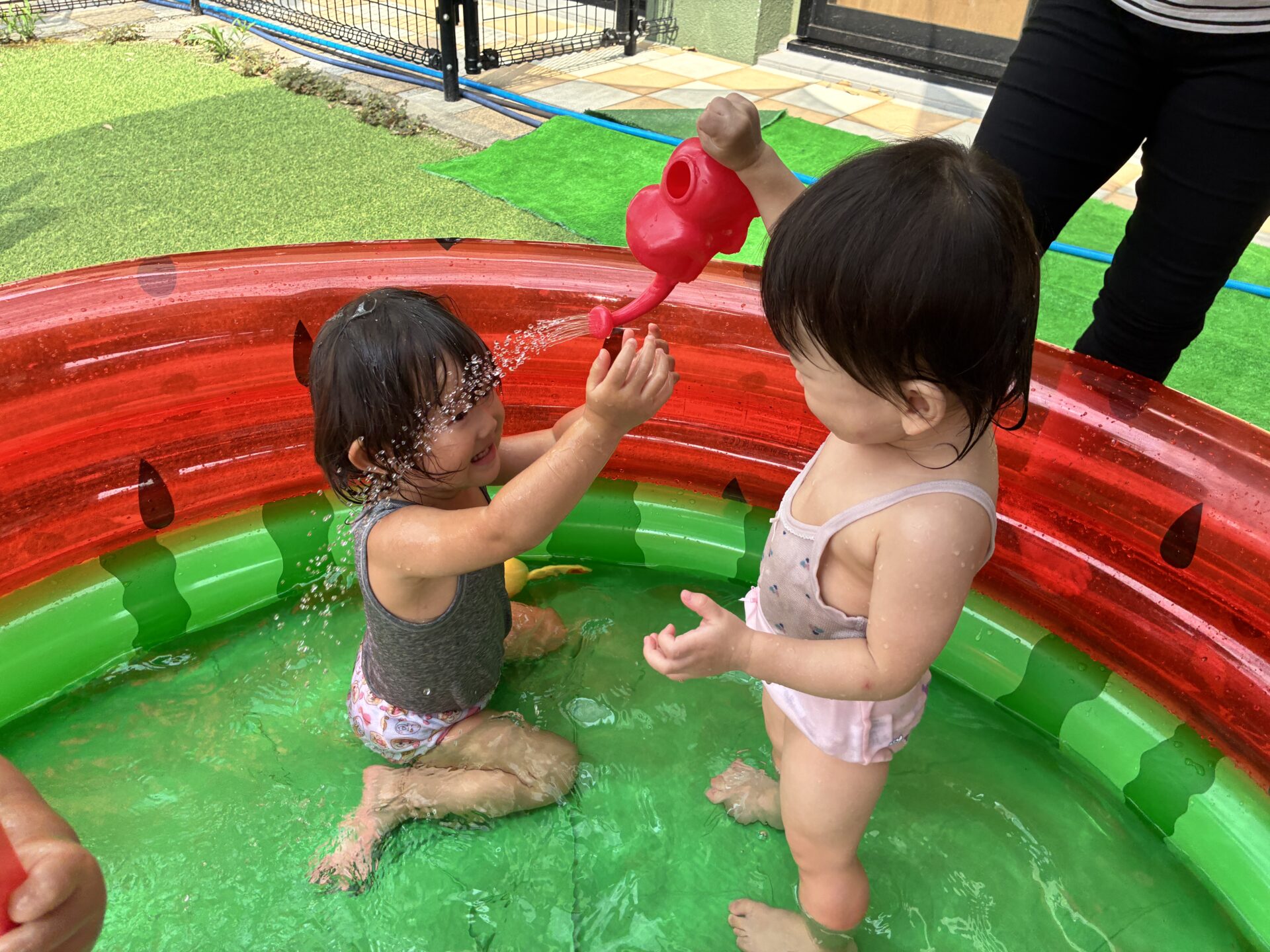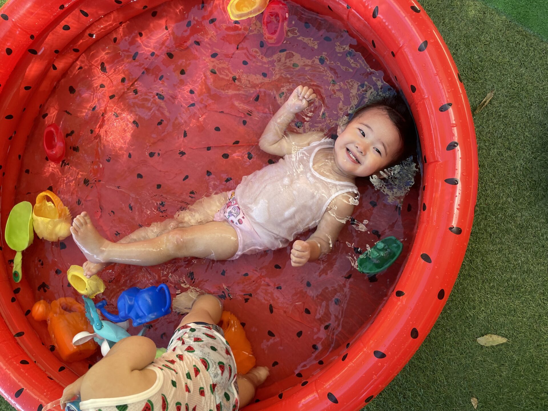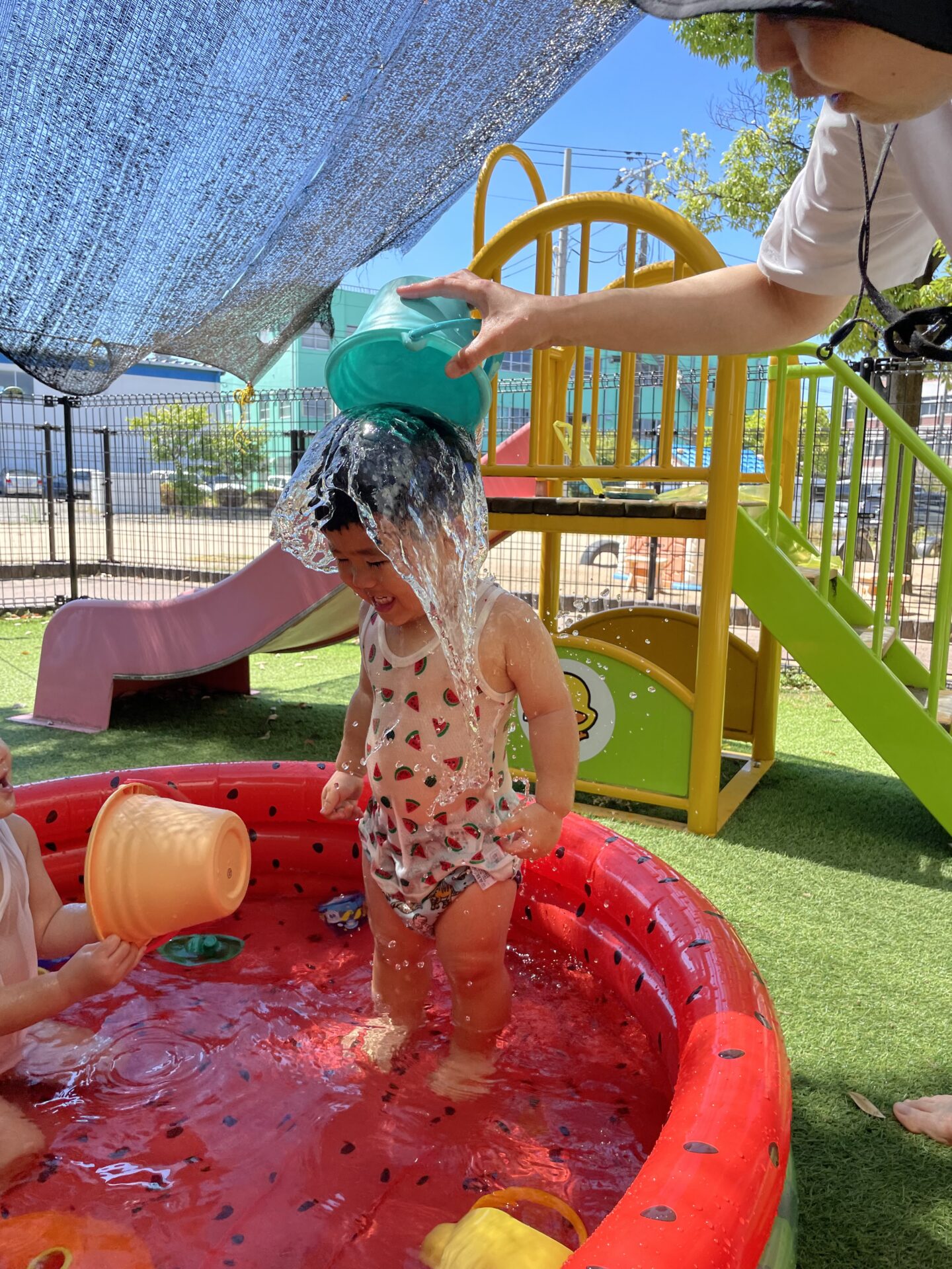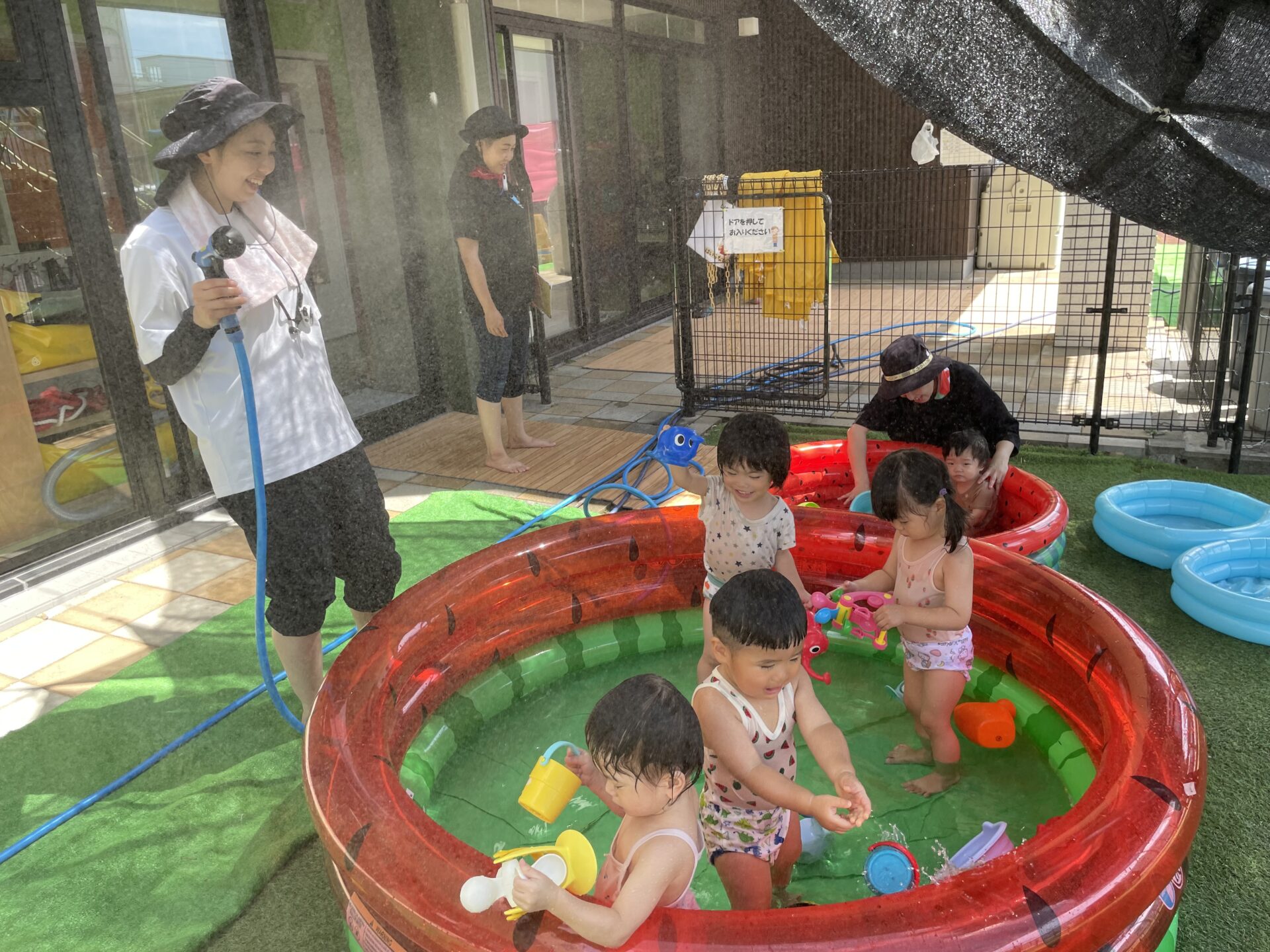 少し前から準備されていたすいかの模様が描いてあるビニールプールをみては
