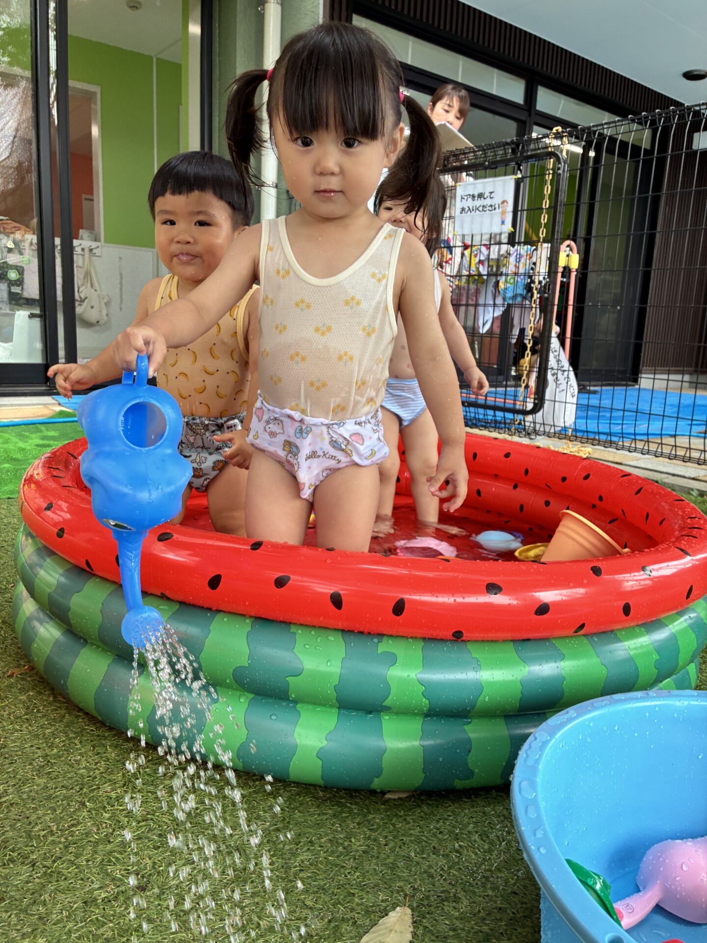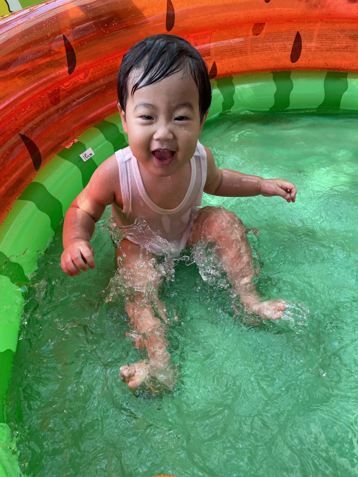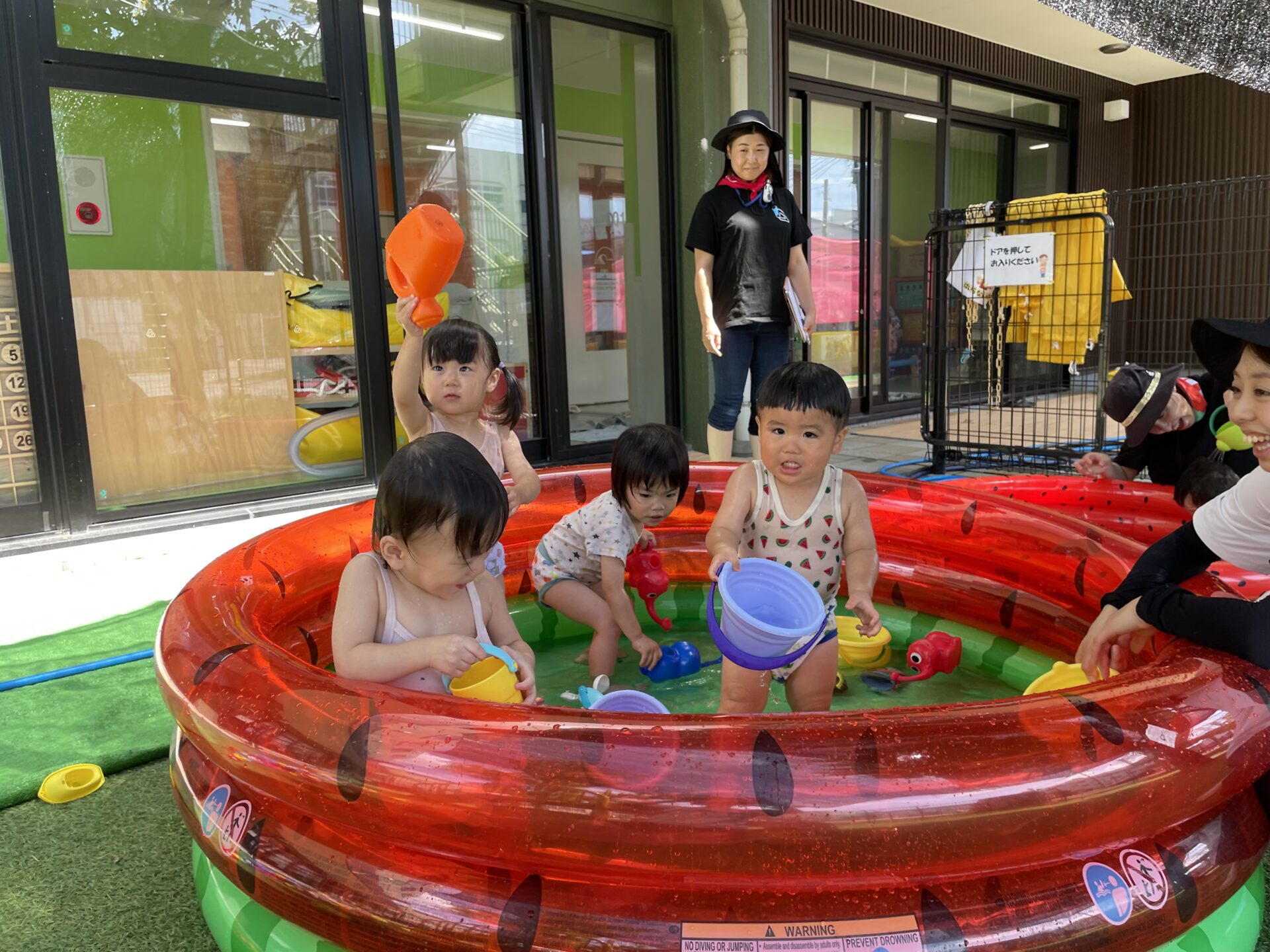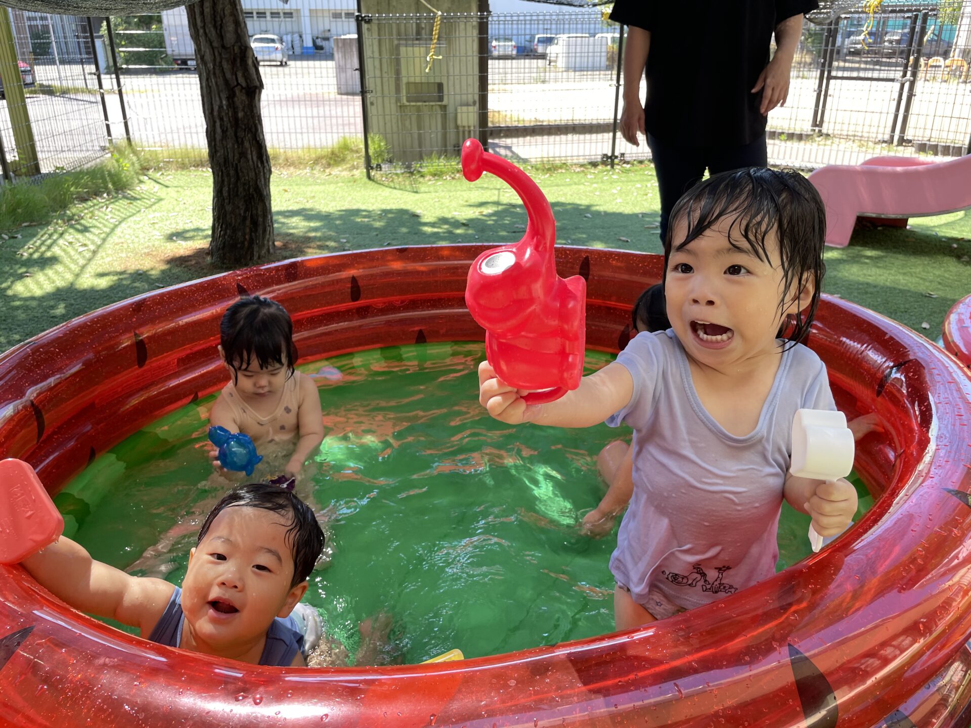 少し前から準備されていたすいかの模様が描いてあるビニールプールをみては