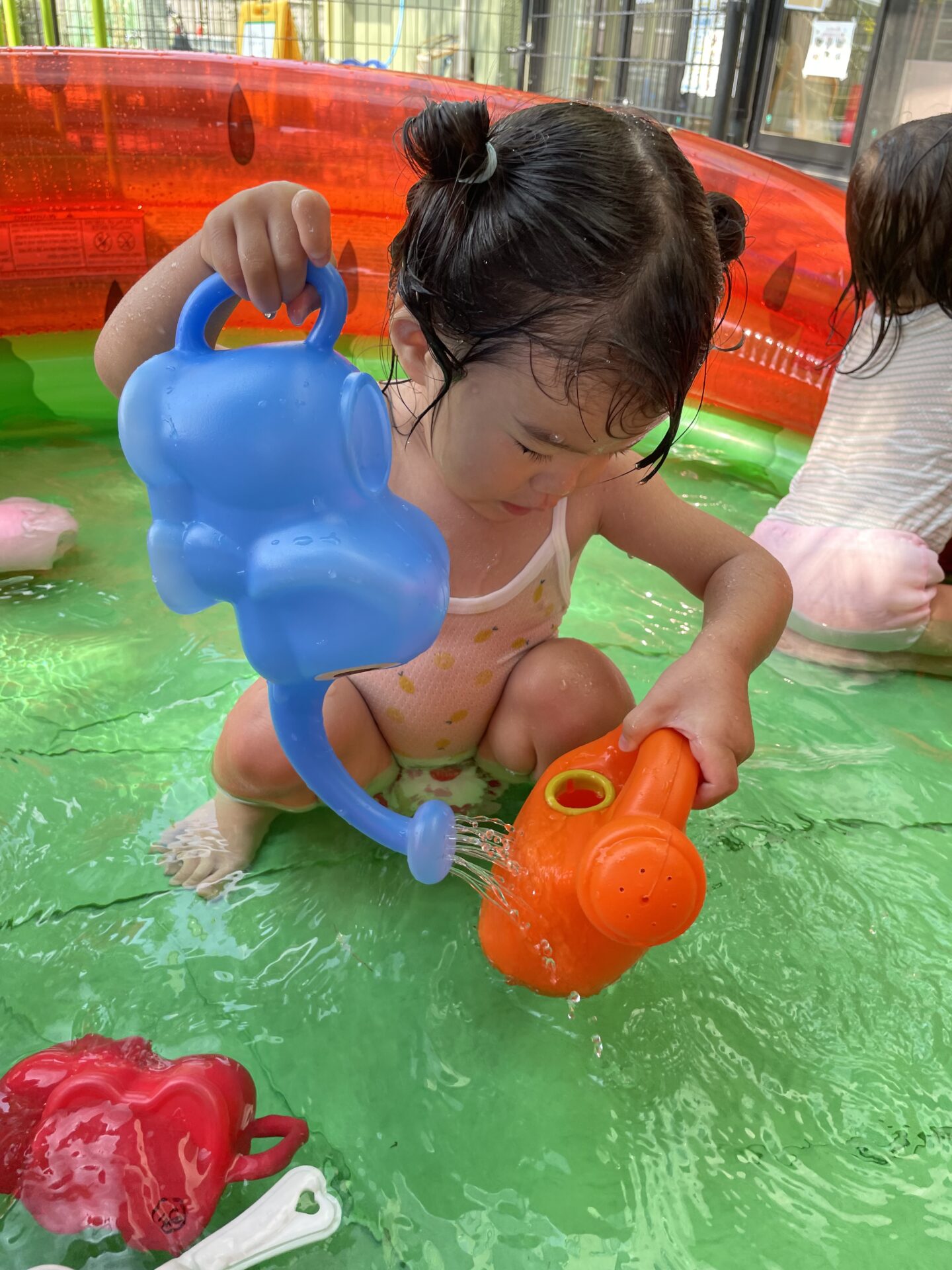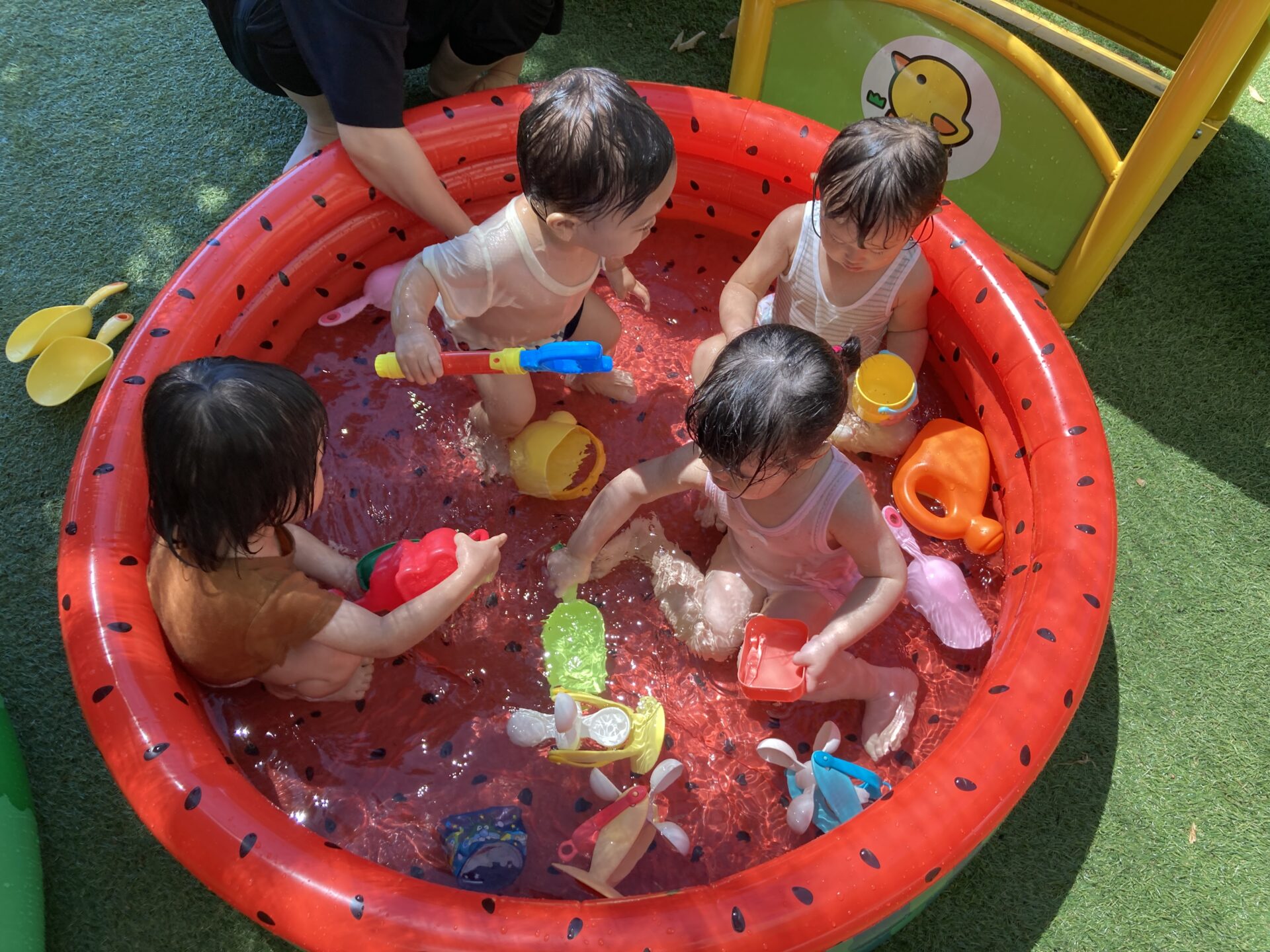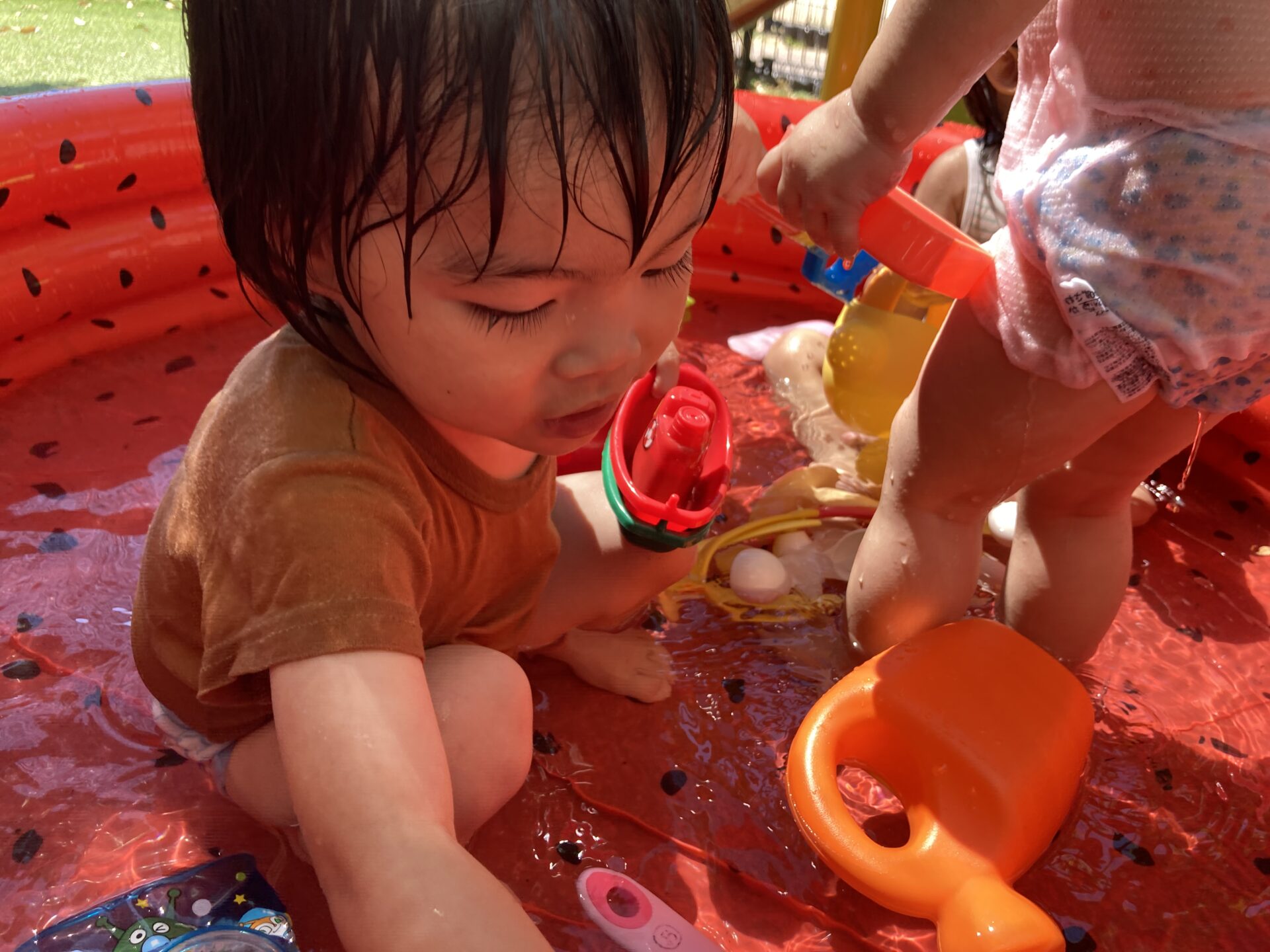水遊び用の玩具に夢中になったり、