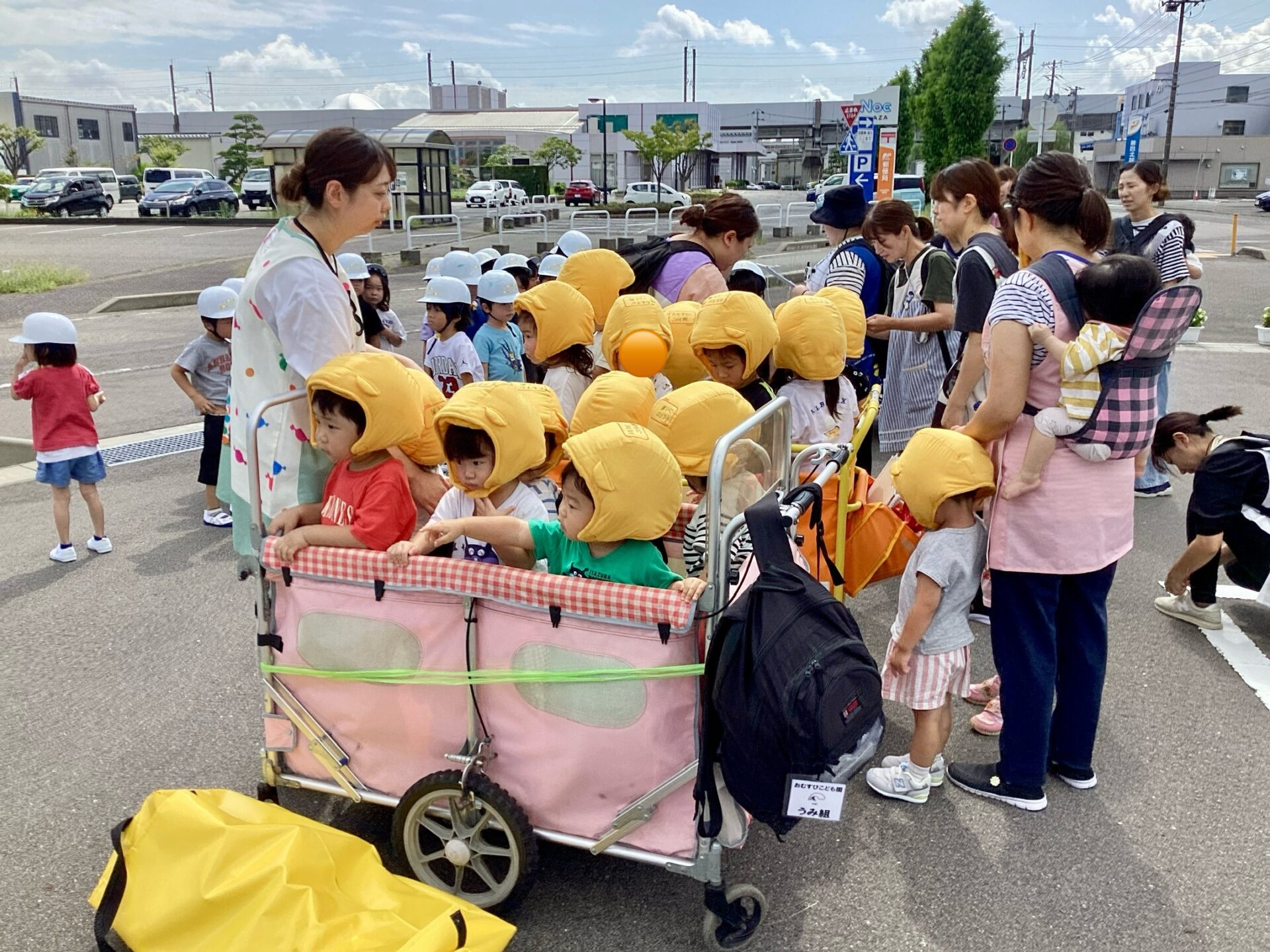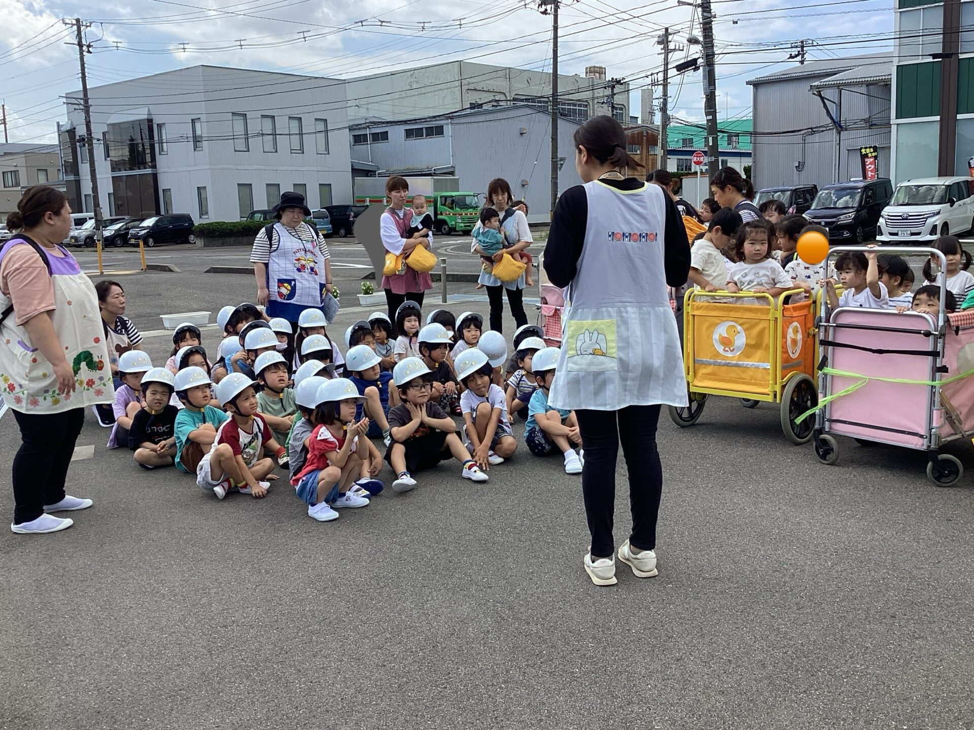 次の指示を聞き、子どもたちは職員と共に園の駐車場へ出る準備をします。