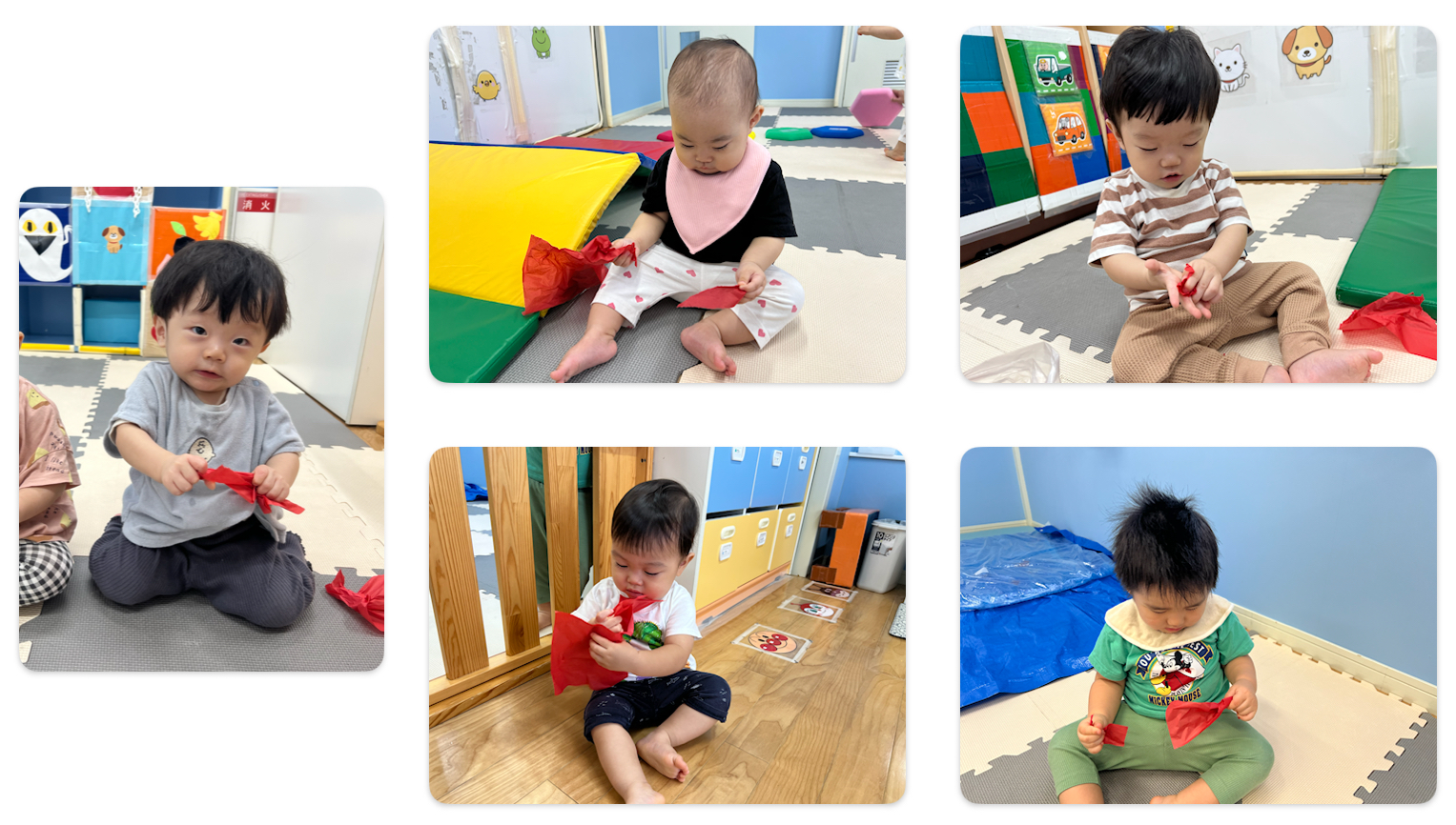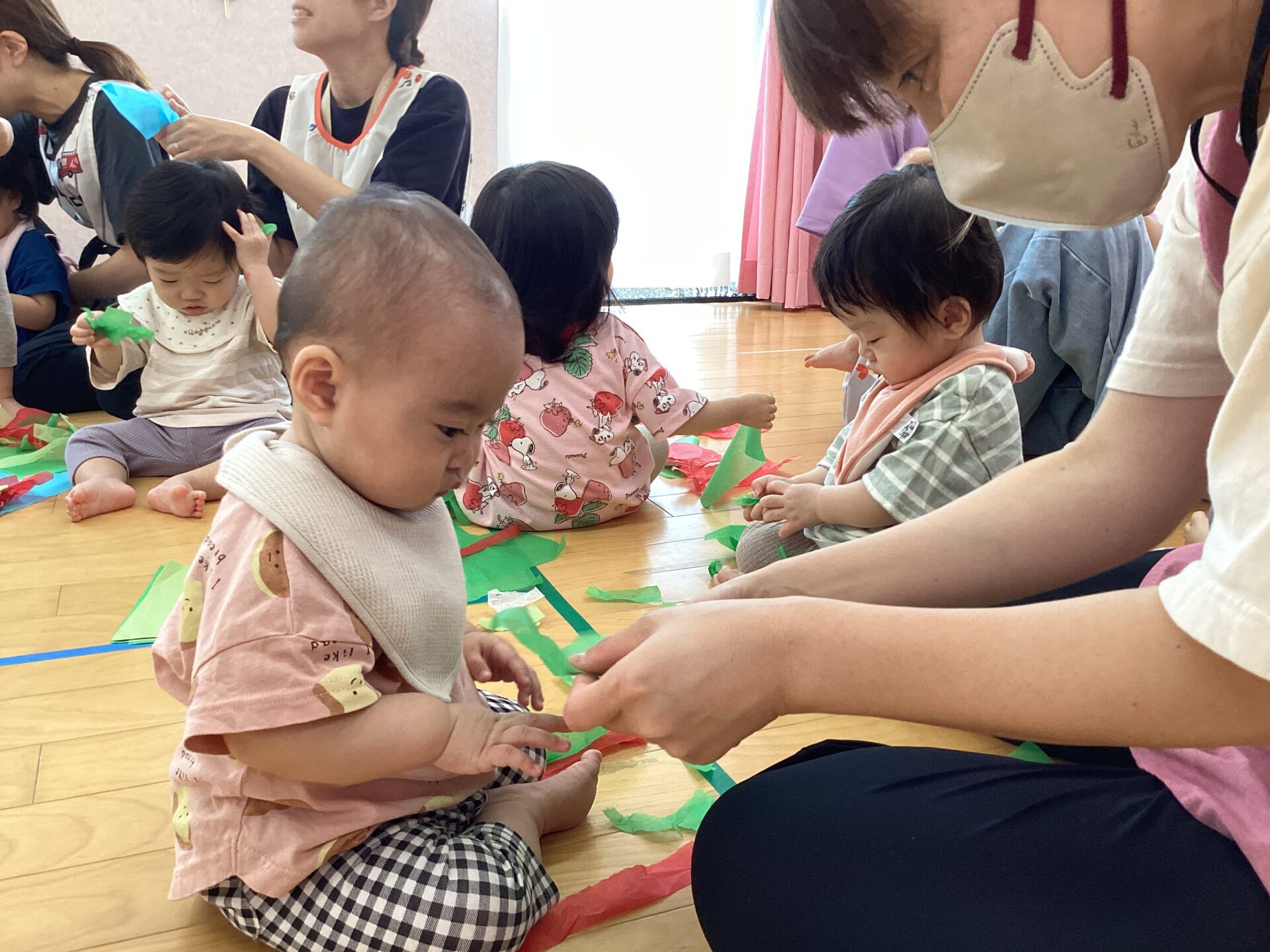 さかのぼること一カ月半前、全クラスが集まり、お花紙(フラワーペーパー)で遊ぶお楽しみ会がありました♪