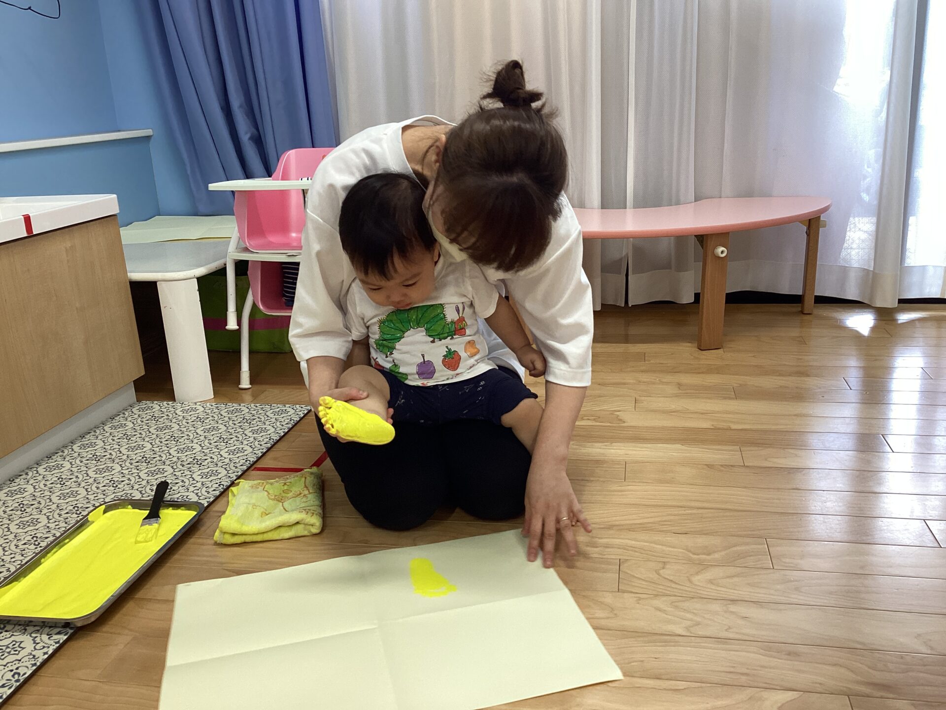 久しぶりの絵の具とハケの感触にちょっぴり涙してしまう子もいましたが、みんな上手に足型がとれました😊