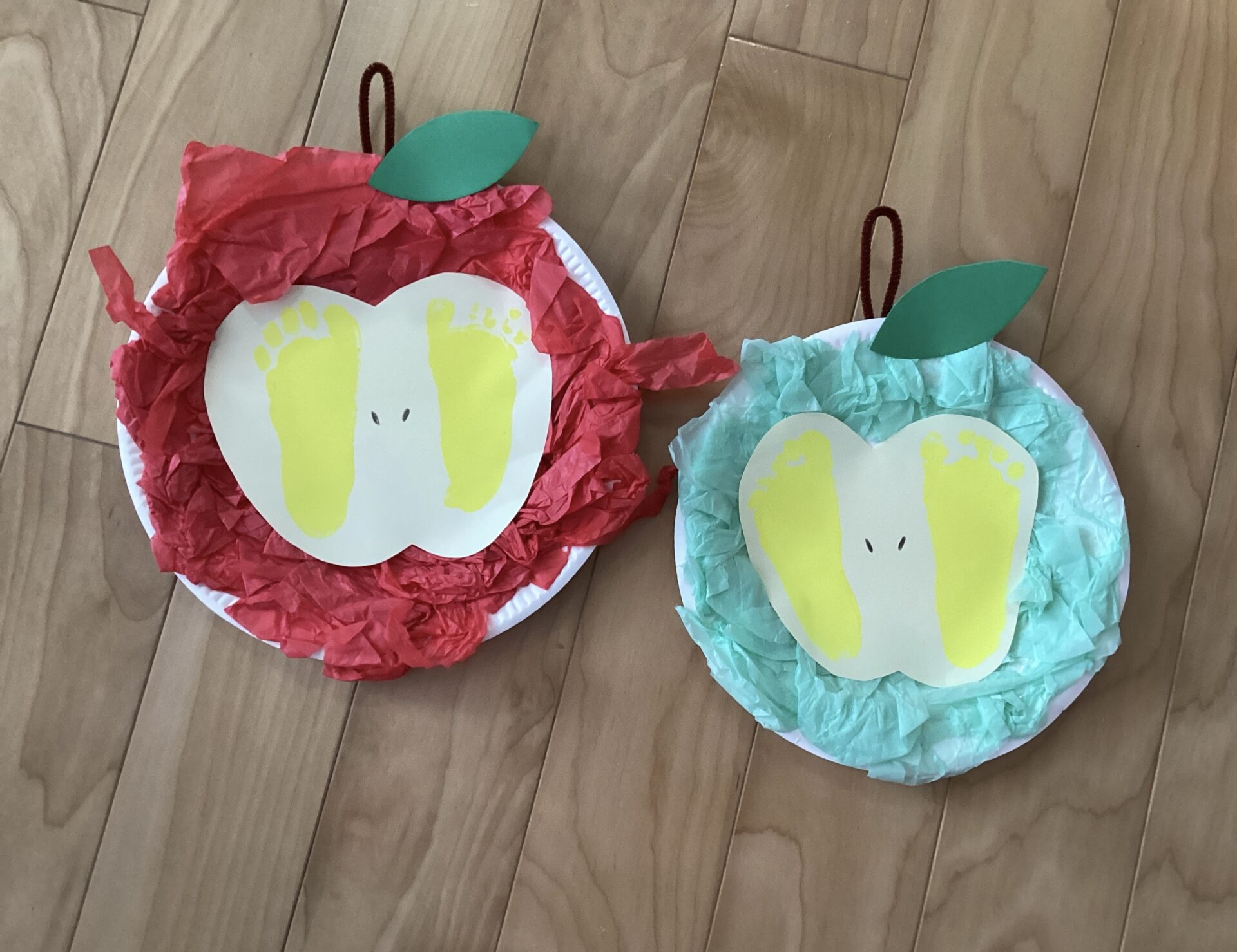 紙皿と足型の画用紙を貼り合わせると、美味しそうなりんご🍎が出来上がりました👏