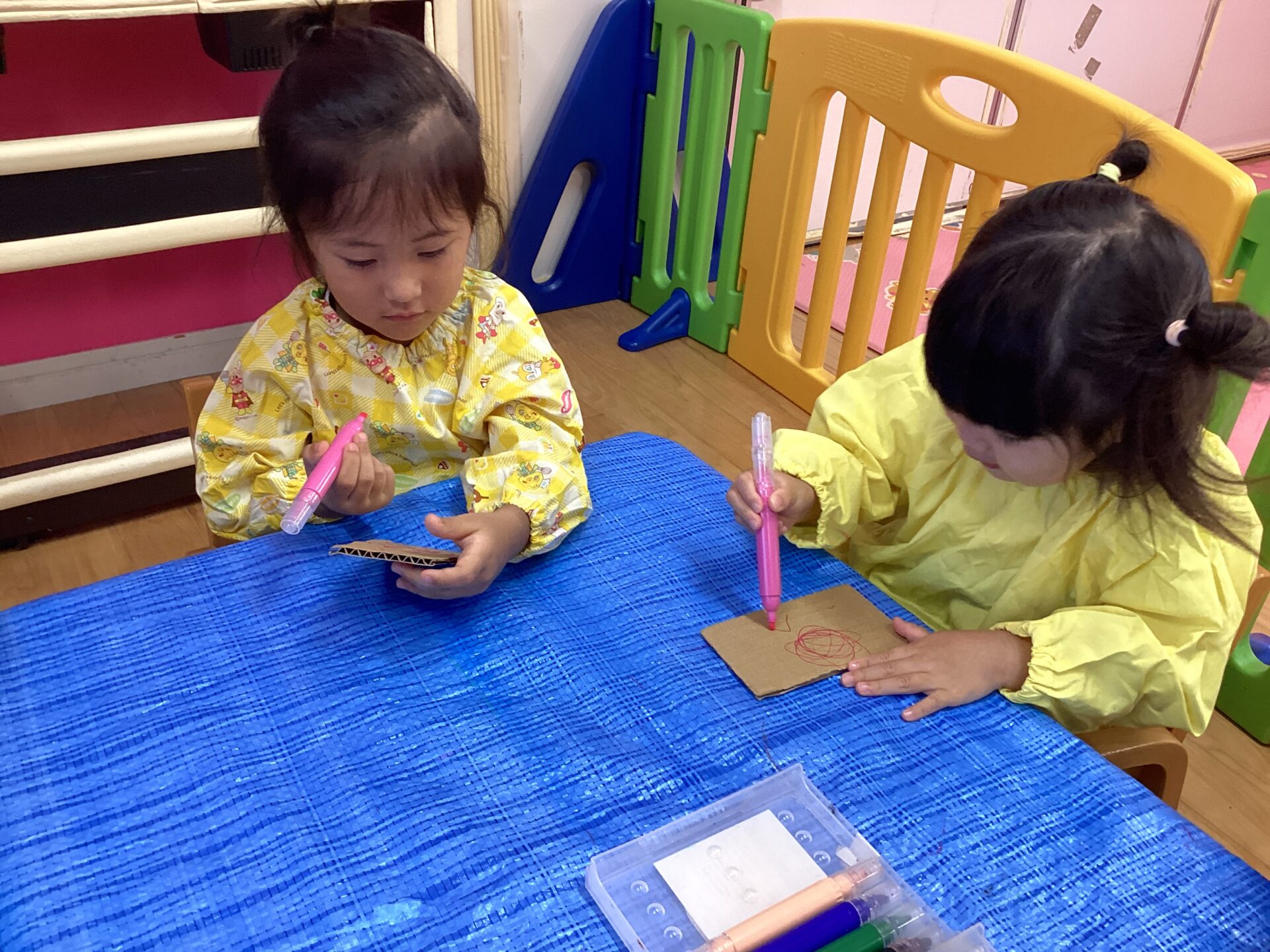 好きな色のマーカーペンを選び、真剣に集中して描いていく子どもたち。キャップが迷子にならないようにくっつけること、服や手に描かないことなどの約束を守って楽しく制作をしましたよ⭐️両面に描く子や一面だけ描き込む子と様々でした!最後に丸シールを貼って、MY電話の完成です〜🥰