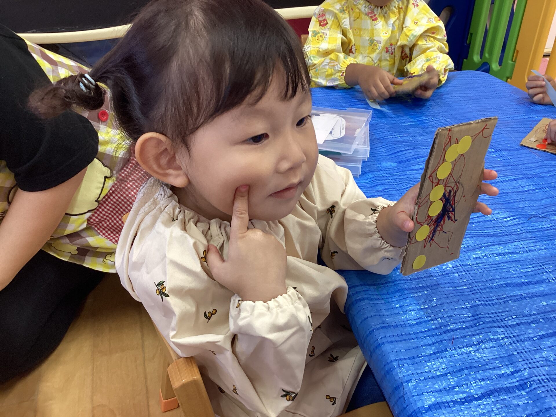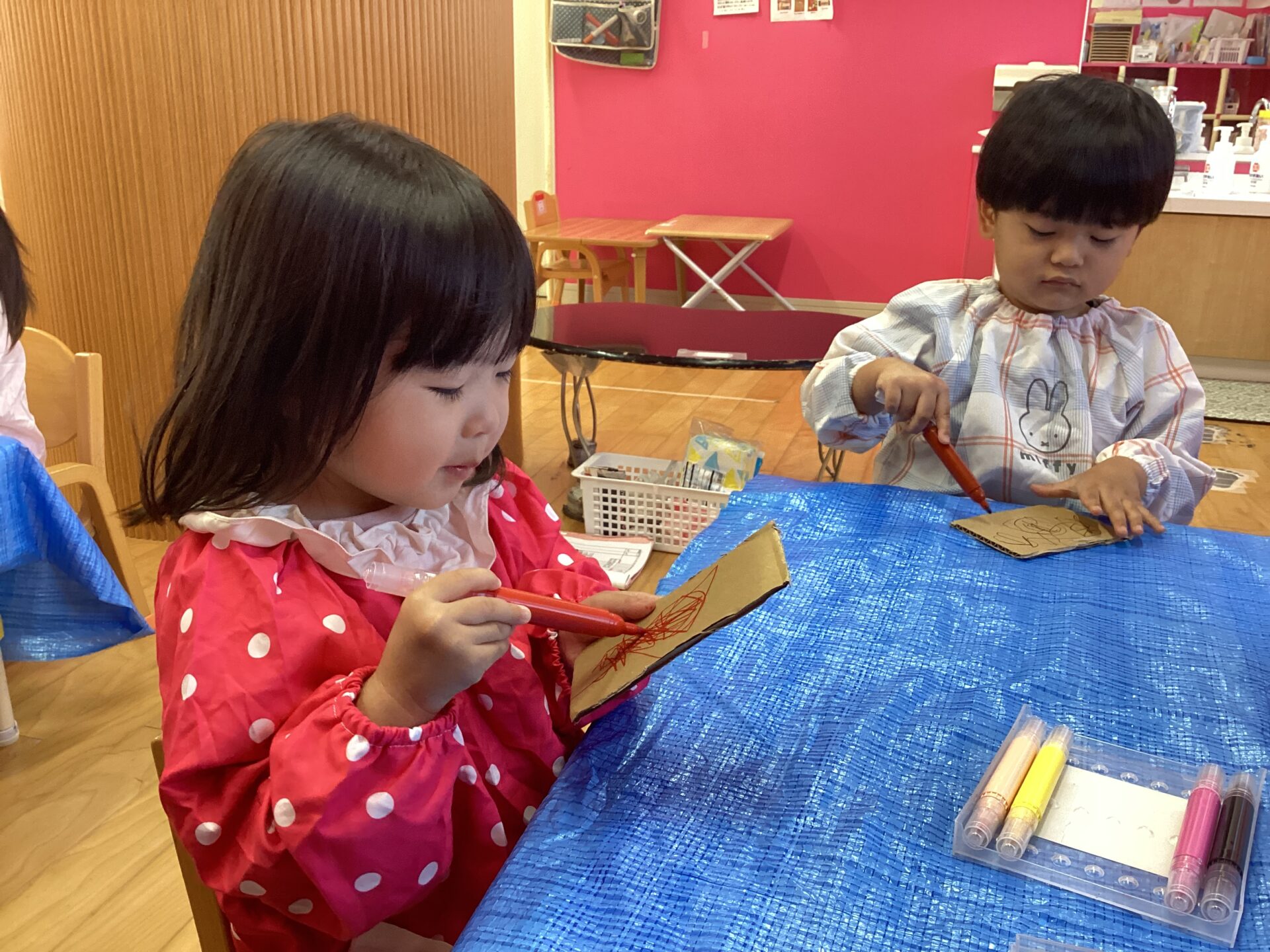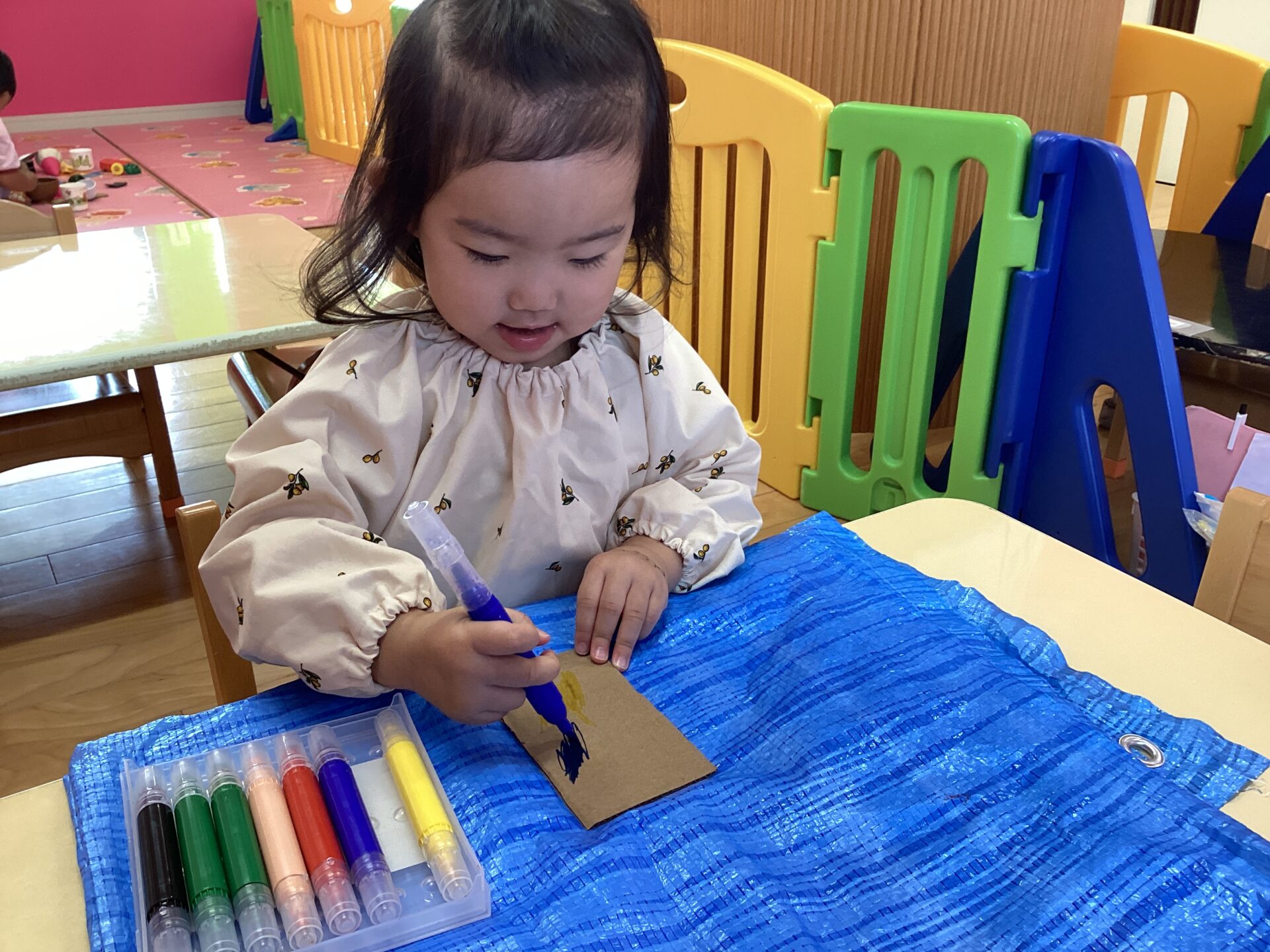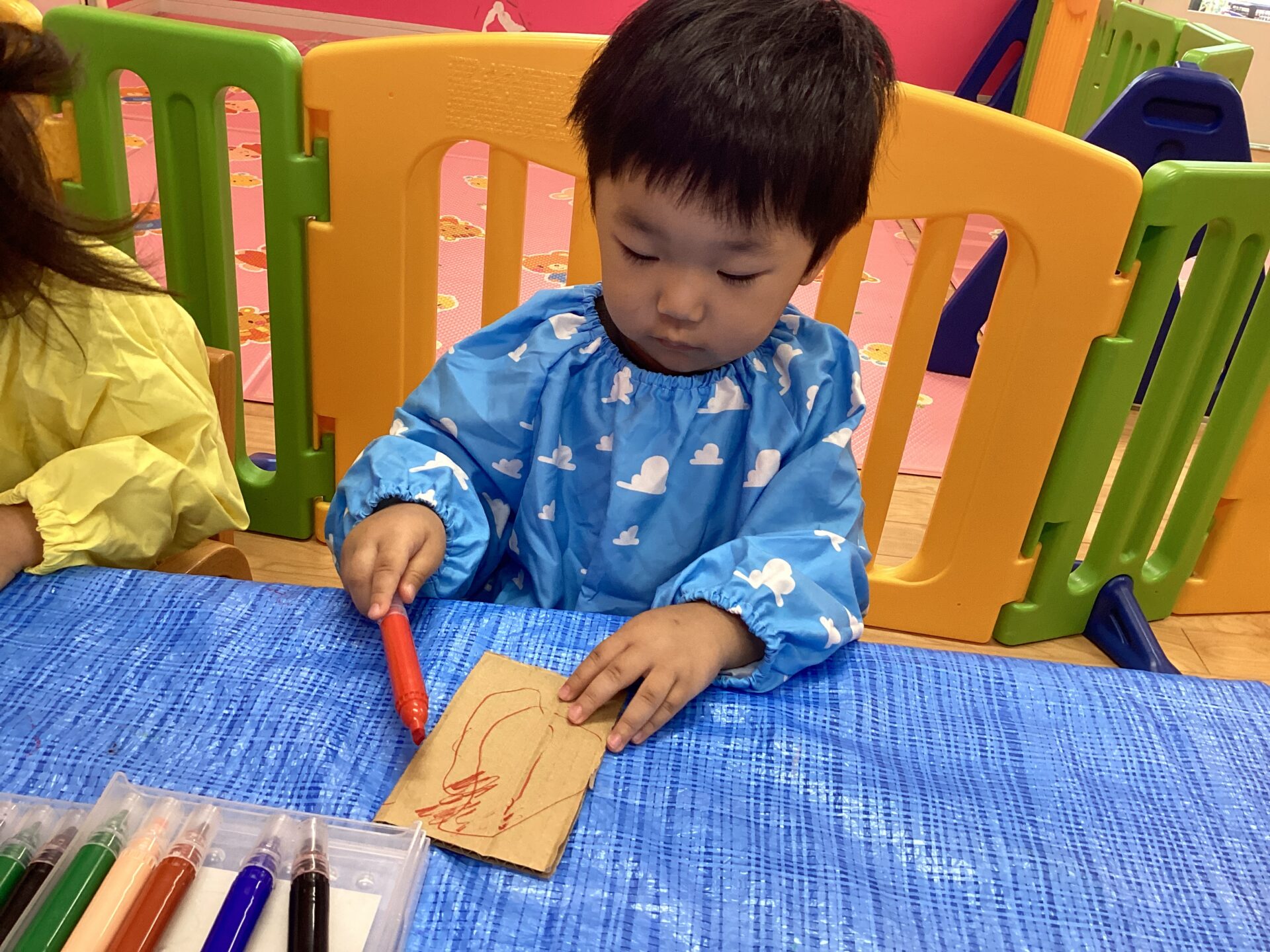 好きな色のマーカーペンを選び、真剣に集中して描いていく子どもたち。キャップが迷子にならないようにくっつけること、服や手に描かないことなどの約束を守って楽しく制作をしましたよ⭐️両面に描く子や一面だけ描き込む子と様々でした!最後に丸シールを貼って、MY電話の完成です〜🥰
