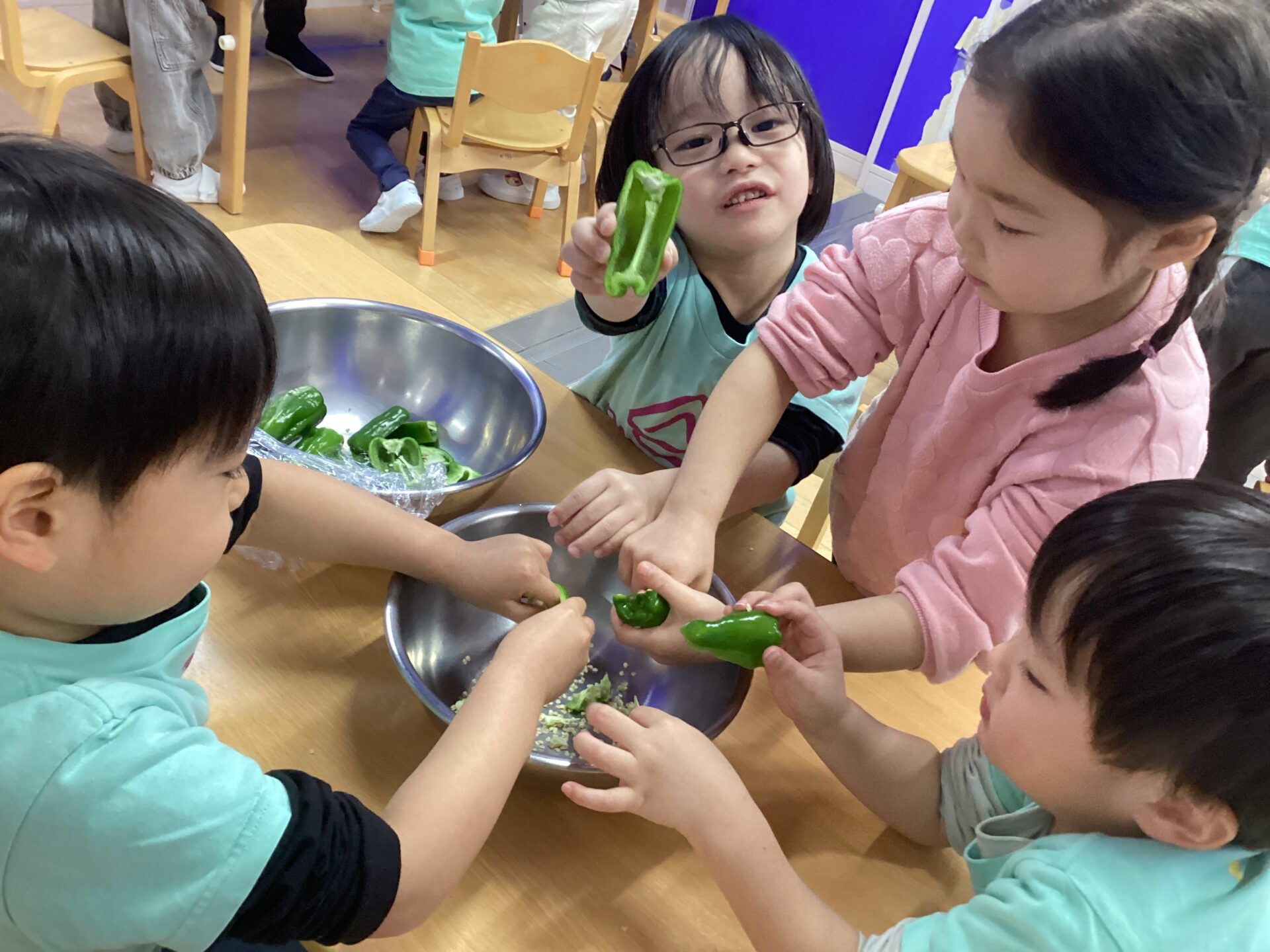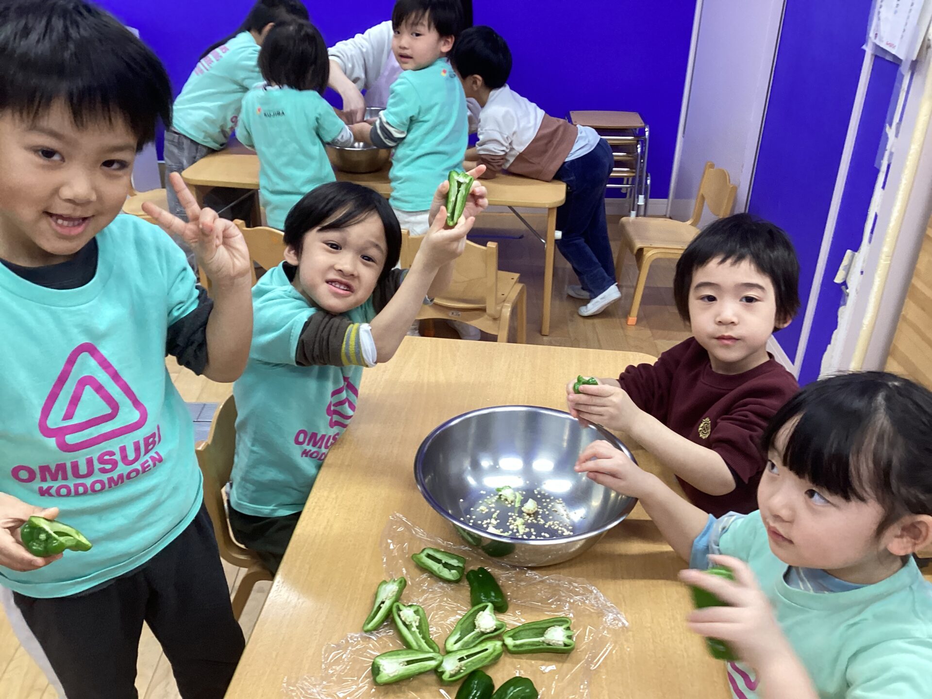 「今日はピーマン🫑の種取りをするよ。」と伝えると「ピーマンって種あるのかな❓」と子どもたちから声が出ました。切っていないピーマン🫑を見せていたので種はまだ見えません。