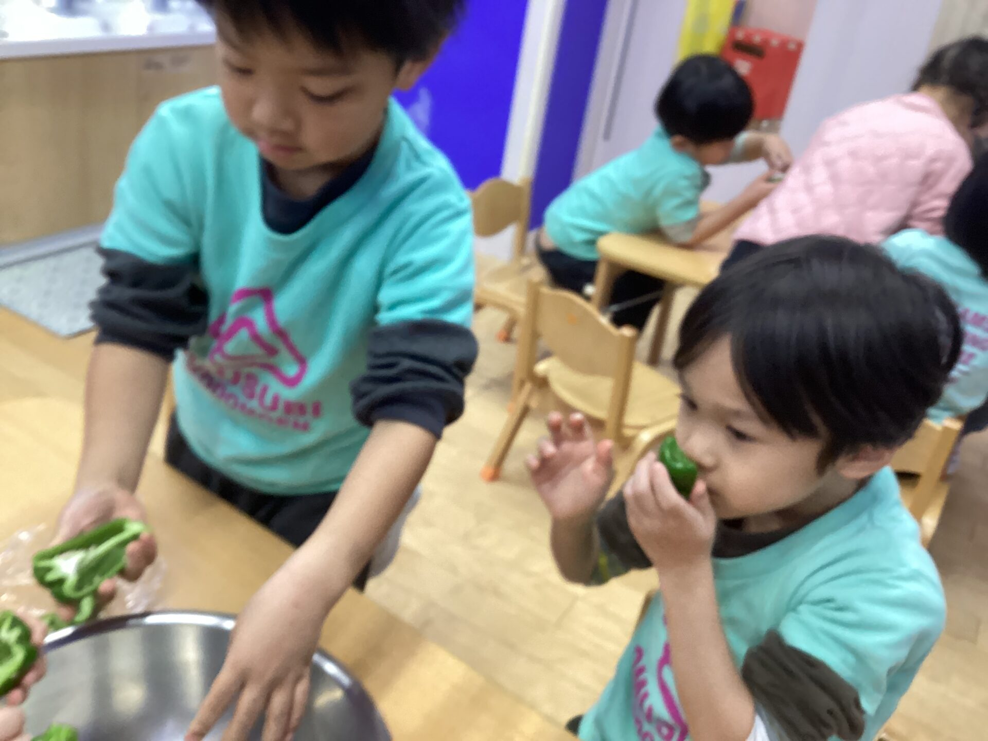 その時に「待って‼️このピーマン🫑さっきのと違う匂いがするー😆」と大発見をしたお友達がいました。確かに切れているピーマン🫑は、匂いが強くて最初に触れたピーマン🫑とは違う匂いでした‼️