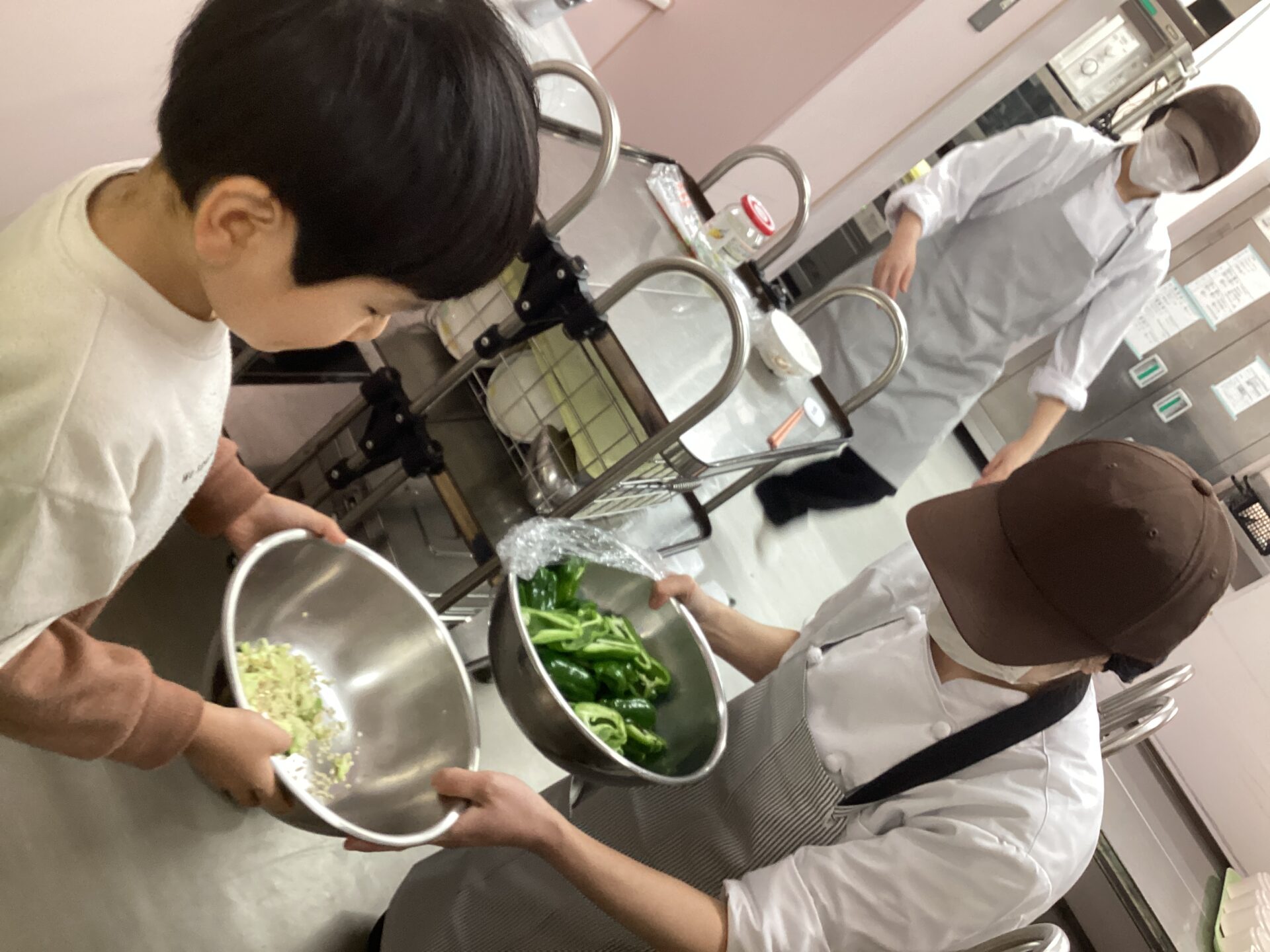 子どもたちに切っていないピーマンを観察してもらうと「軽いね」「ピーマン🫑の匂いがする〜😂」とみんなからたくさんの発見がありました✨