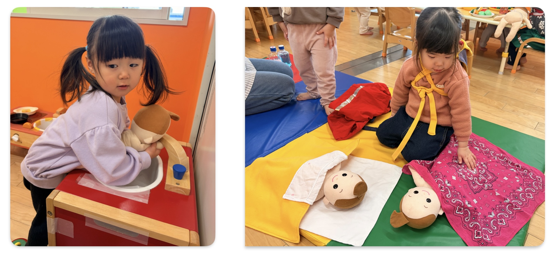 お人形のお世話が大好きなお友だちは手を洗ってあげたり、寝かしつけをしたりとお世話に忙しそうです。