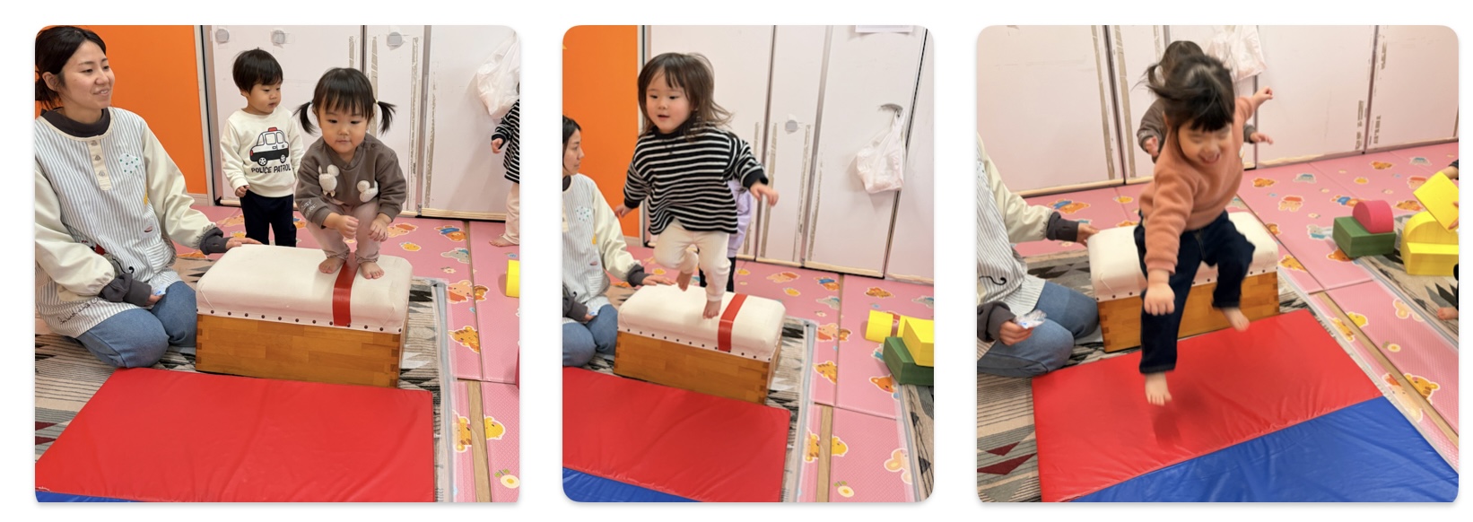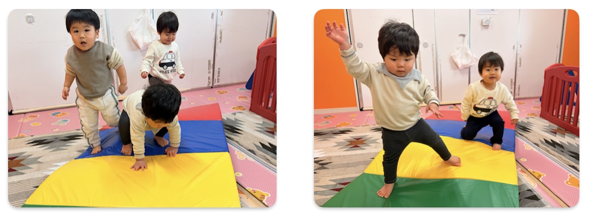 体を動かすことも大好きなうみ組(1歳児)のお友だち。跳び箱のジャンプ台を用意すると、大喜びで挑戦していました✨自分の番が来るまで、順番を待つことも遊びを通して経験しています😊