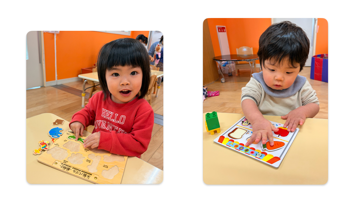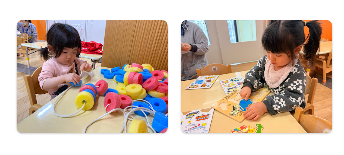 ひも通しや型はめパズルなど手先を使う遊びも大好きな子ども達。