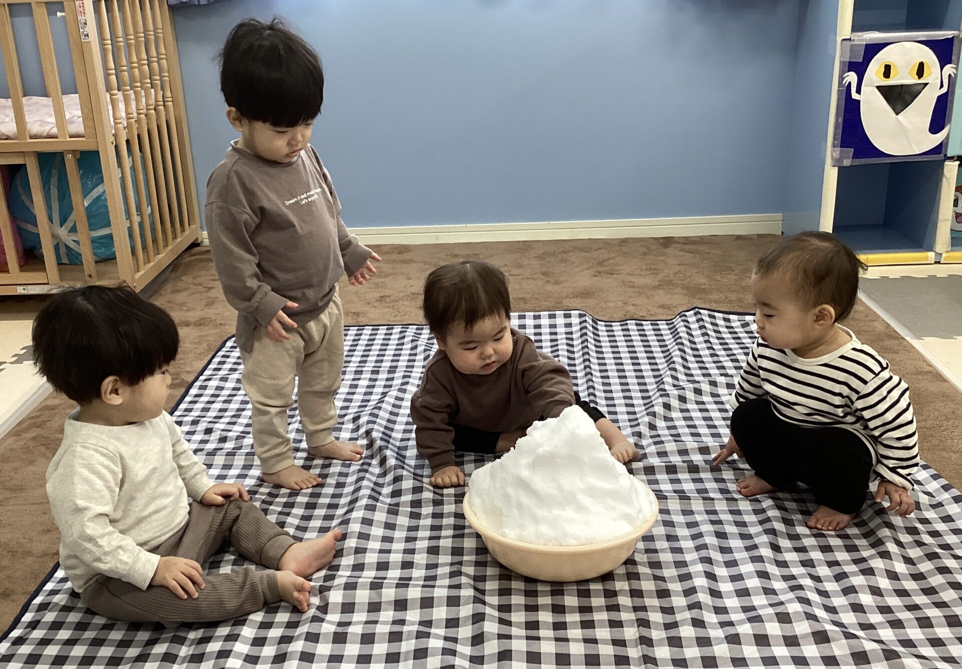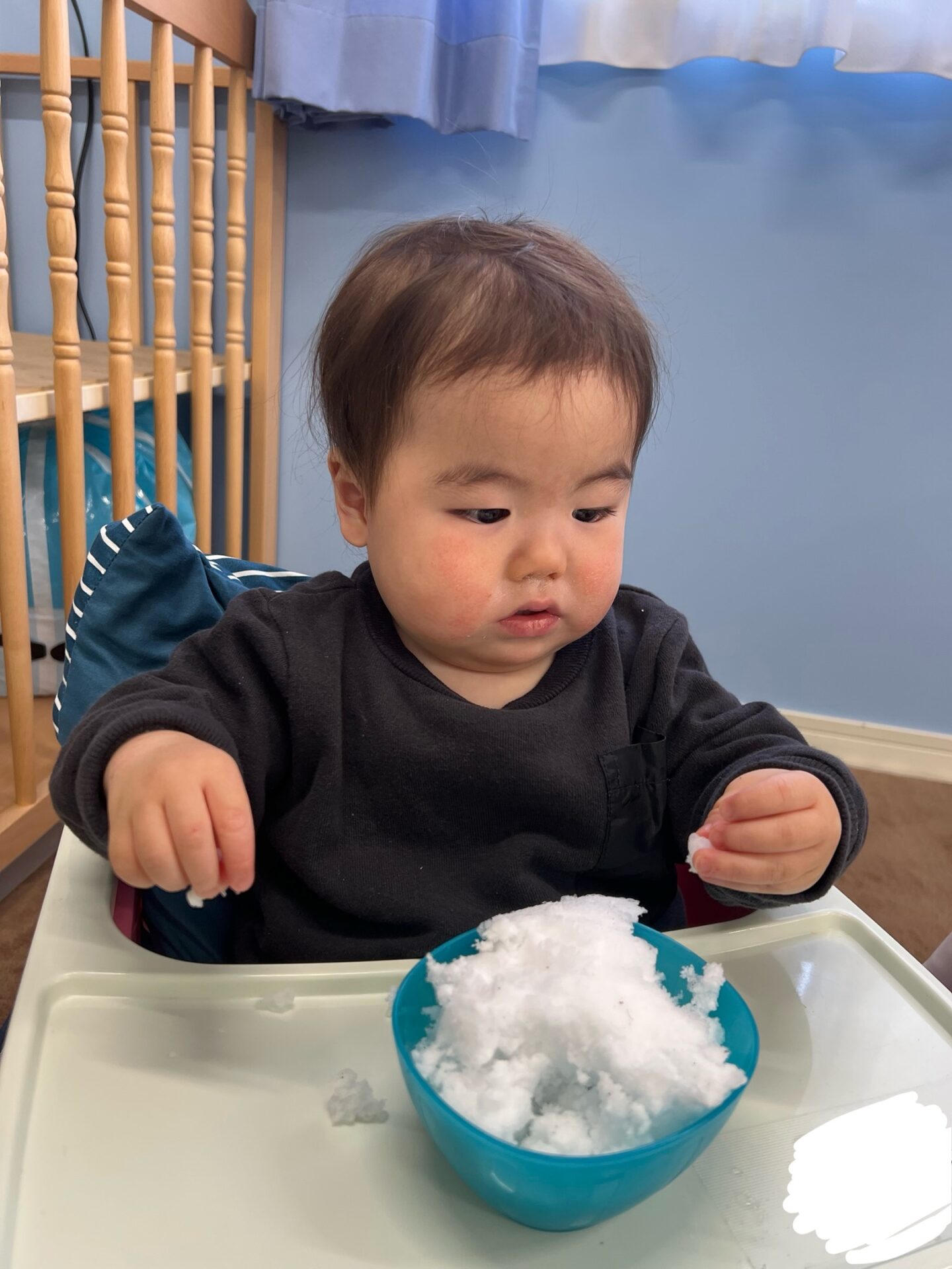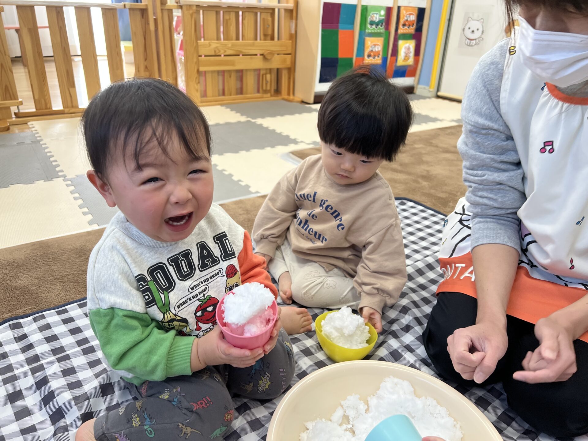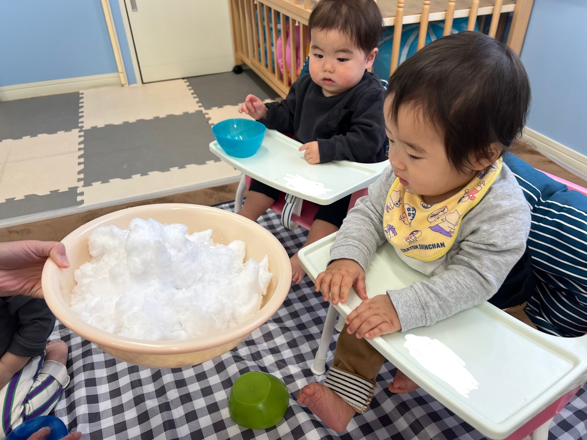 お部屋に雪を運ぶとこども達は目を丸くして驚いたり、ドキドキしたようで遠くから眺める子、積極的に近づき「わーい🙌」と喜ぶ姿が見られました🎵