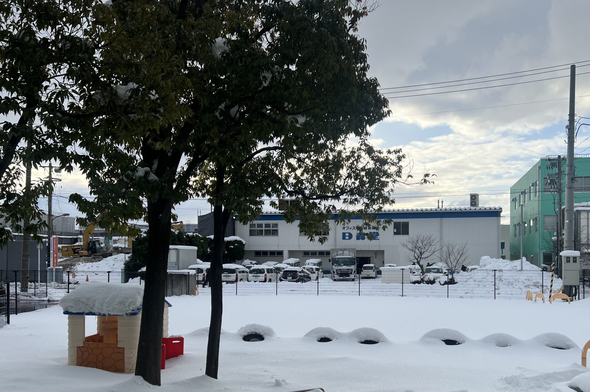 芝生の園庭にある滑り台にも雪がたくさん積もっていましたよ‼️