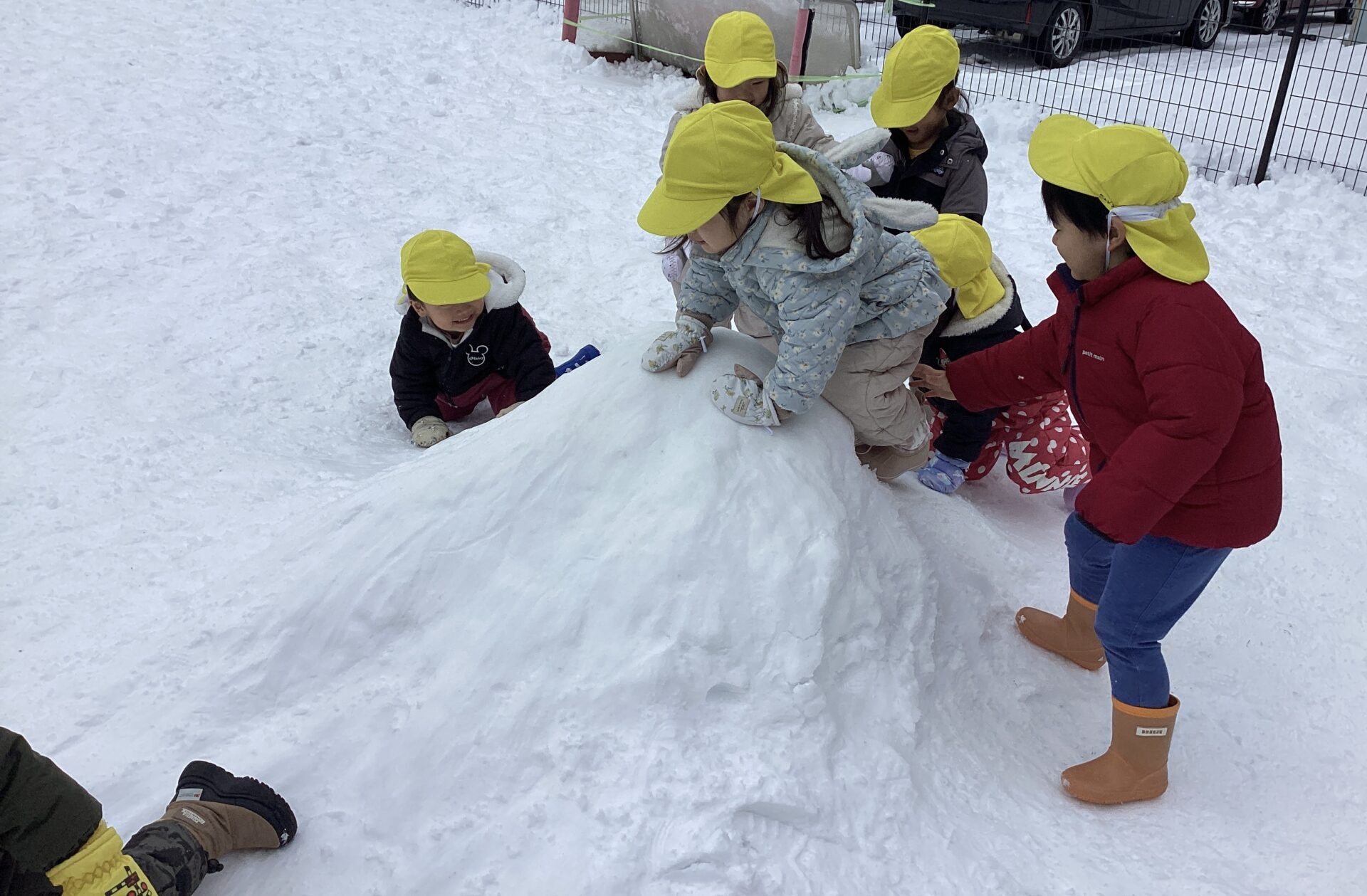 お兄さんお姉さんがたくさん滑った後だからか、ツルツルしてうまく登れず苦戦していましたが、後ろからお友だちが「がんばれー」と応援したり、滑りそうになる子を支えてあげようとしたり協力しながら楽しんでいましたよ🩷