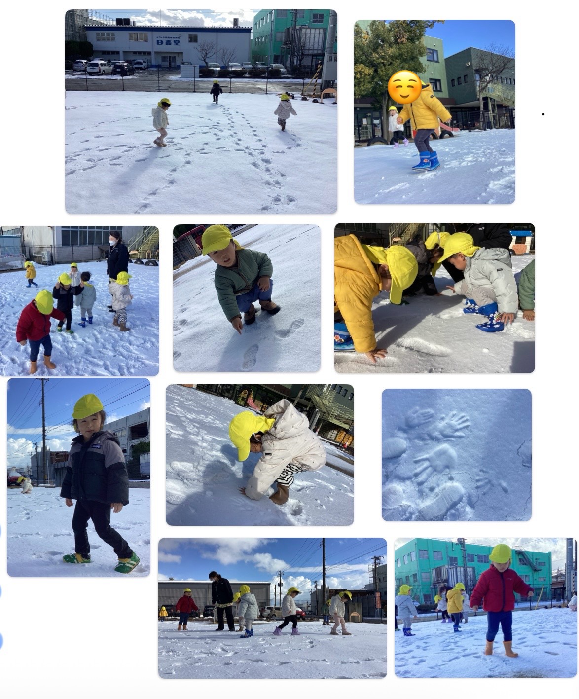 真っ白な雪の上に子どもたちの小さい足跡👣その横に保育者の大きい足跡が👣「先生のおっきい〜」と子どもたちは大爆笑😆少しの雪でもその日は大満足でした💕
