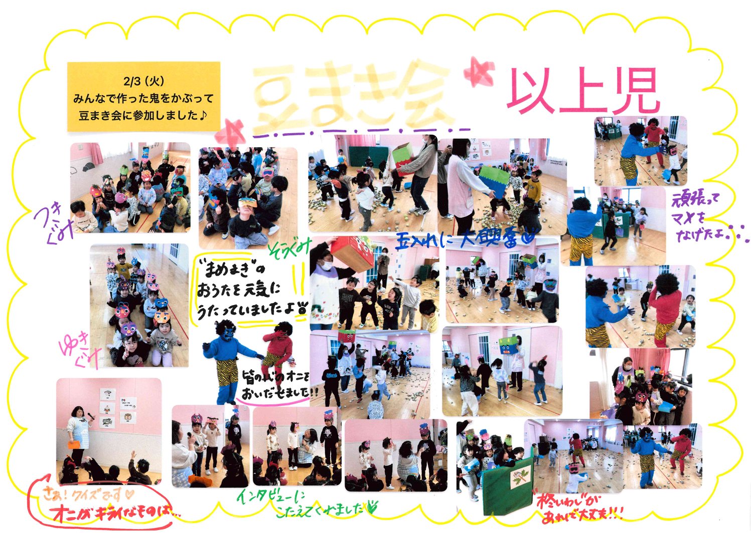 朝から「鬼こわいな~」「本当にくるのかな~」とドキドキしながら登園していたお友だちも節分の由来のお話や、クイズに興味津々で答えたり、クラスごとの玉入れゲームでは大盛り上がりでした。