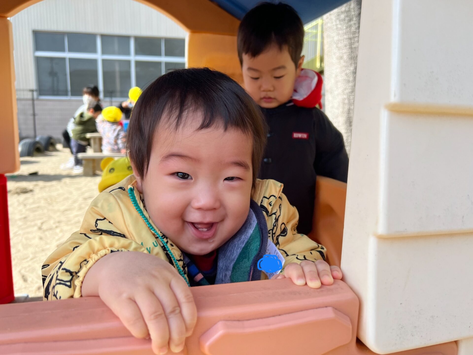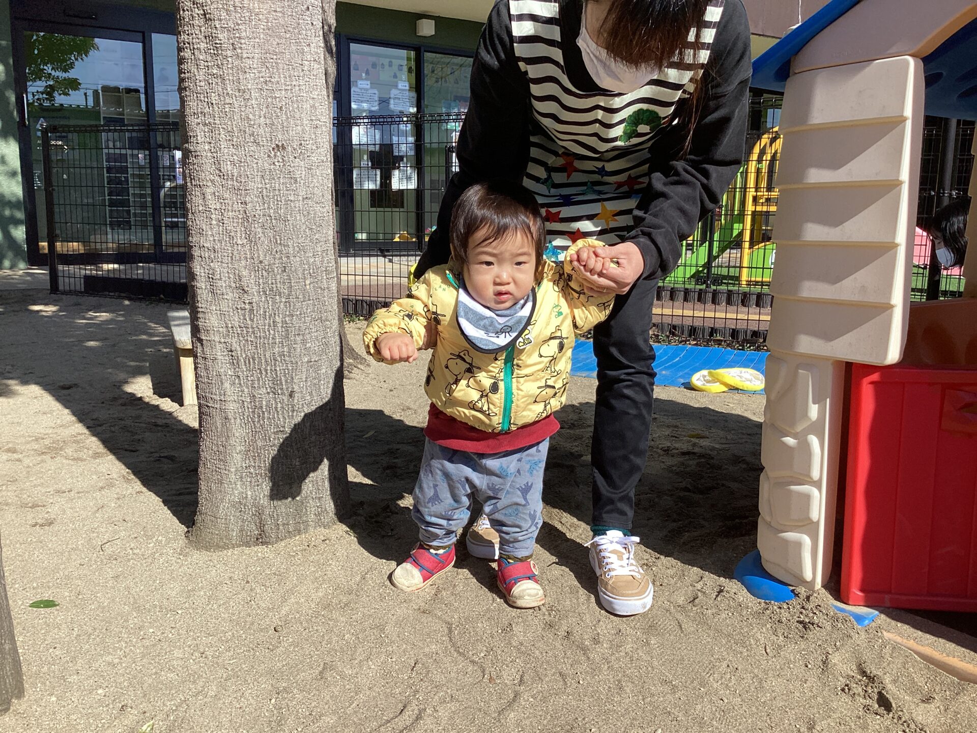 そんなポカポカ陽気に誘われて、おむすびぐみ(0歳児)のこども達は先日園庭遊びを楽しみました✨