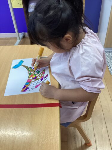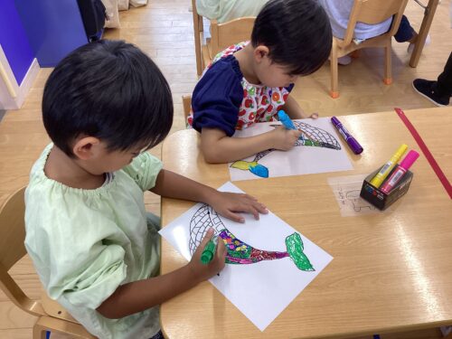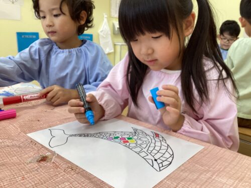 何色も使って色を塗る子、1色を選び淡々と塗る子、ペンをくるくると回しながら描く子など様々な様子が見られました🎵
