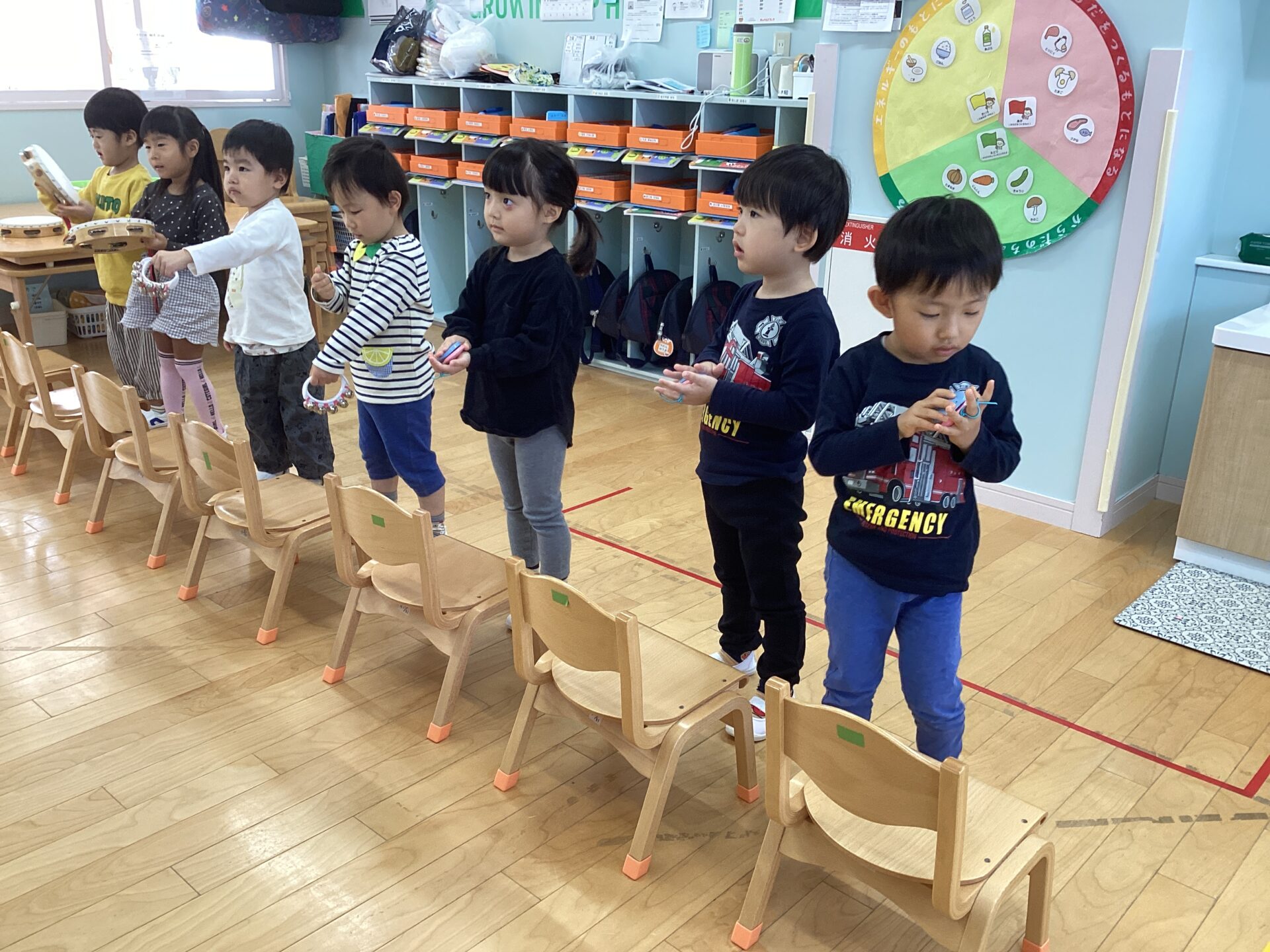 一列になってみんなで演奏をすると、ちょっぴりドキドキ緊張する様子も見られますが、楽器を片付ける時間になると、「またやりたい❗️」と声を揃える子どもたちです✨