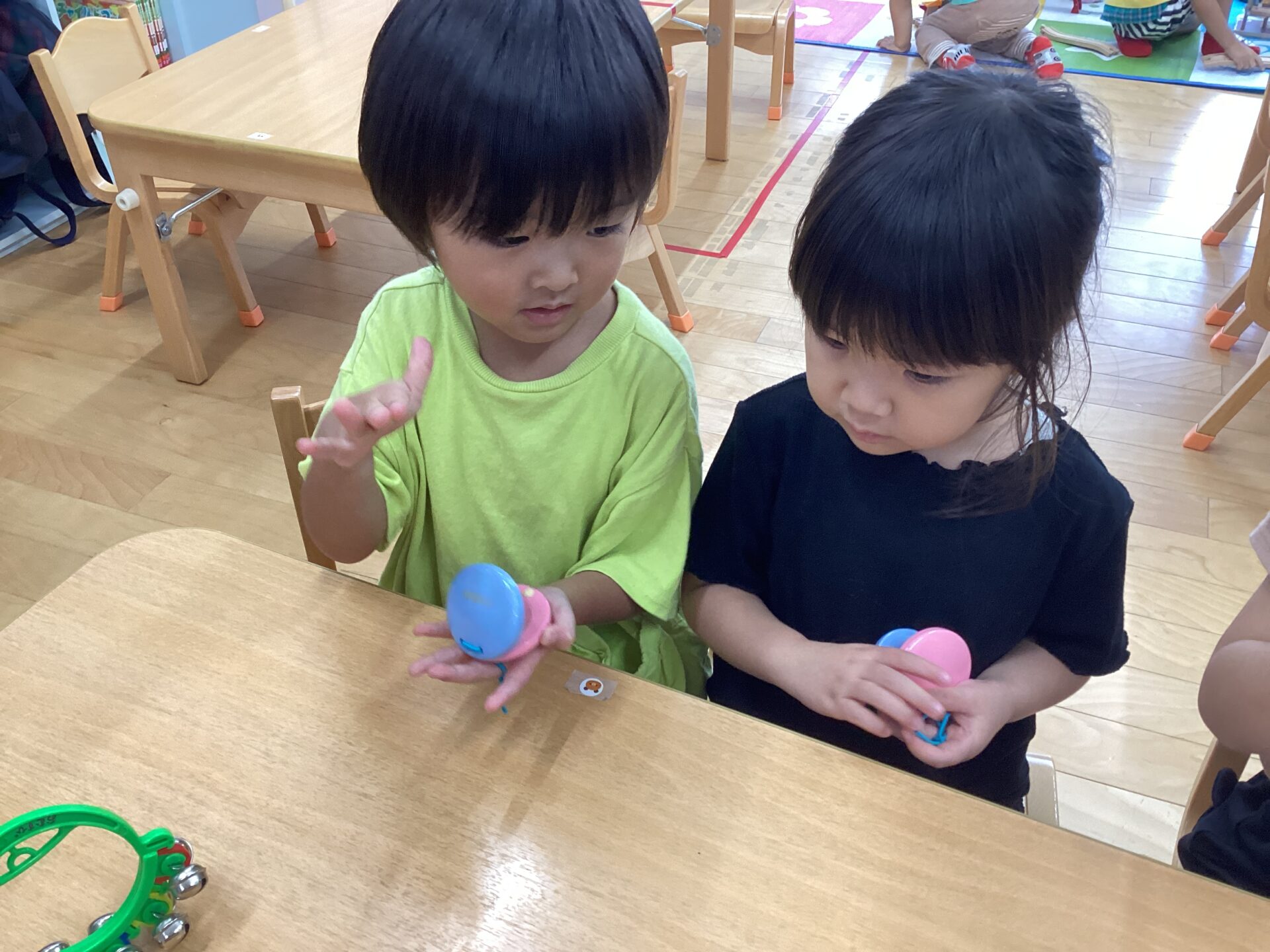 子どもたちに楽器の使い方を知らせてからさっそく楽器で遊んでみると、一生懸命に楽器を鳴らしてみようと真剣になったり、お友だちと音を聴かせあったりして楽しんでいました😊