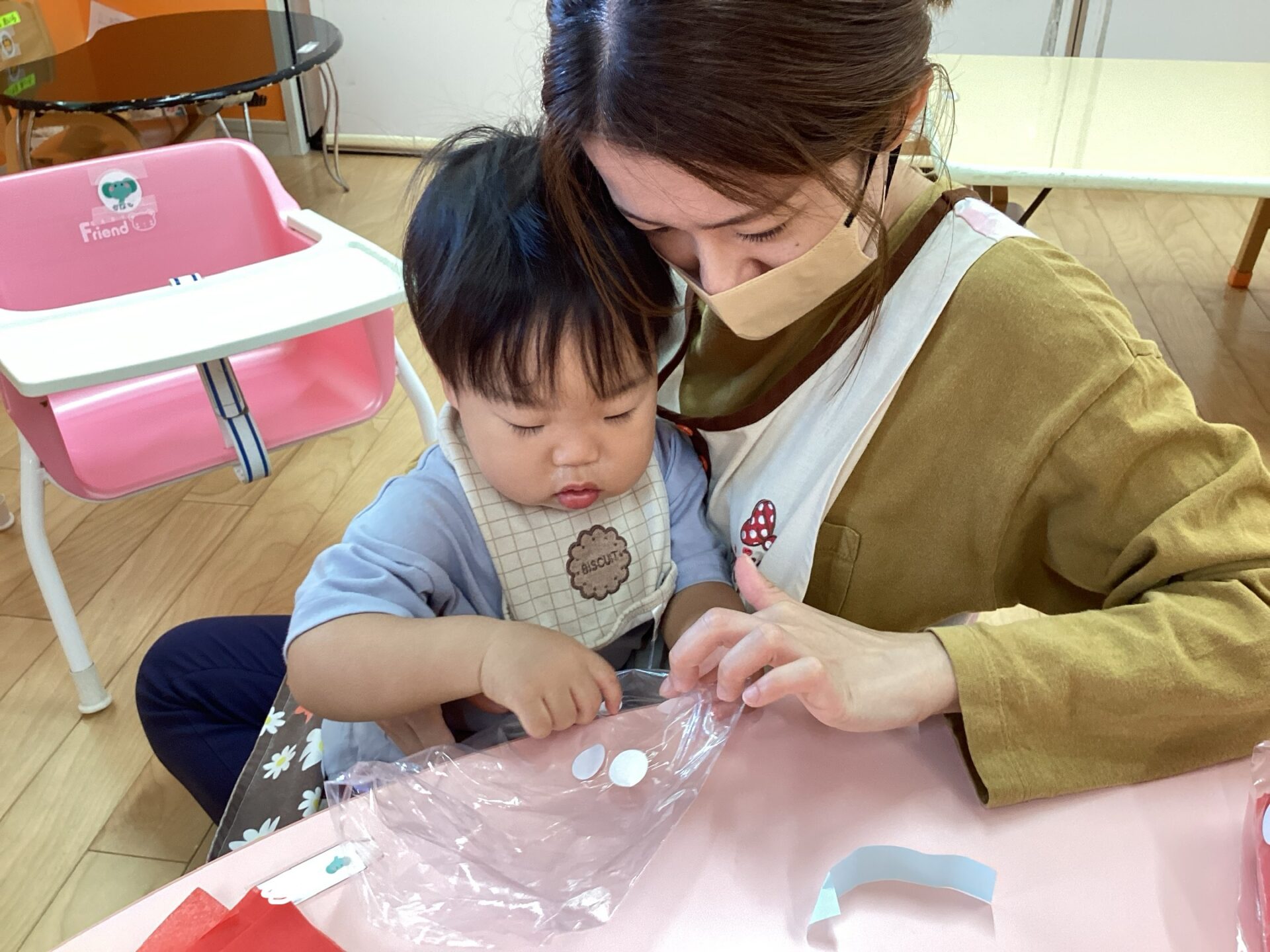 自分でシールをとるのが難しい子は、保育者に手伝ってもらいながら一枚一枚慎重に貼っていました。
