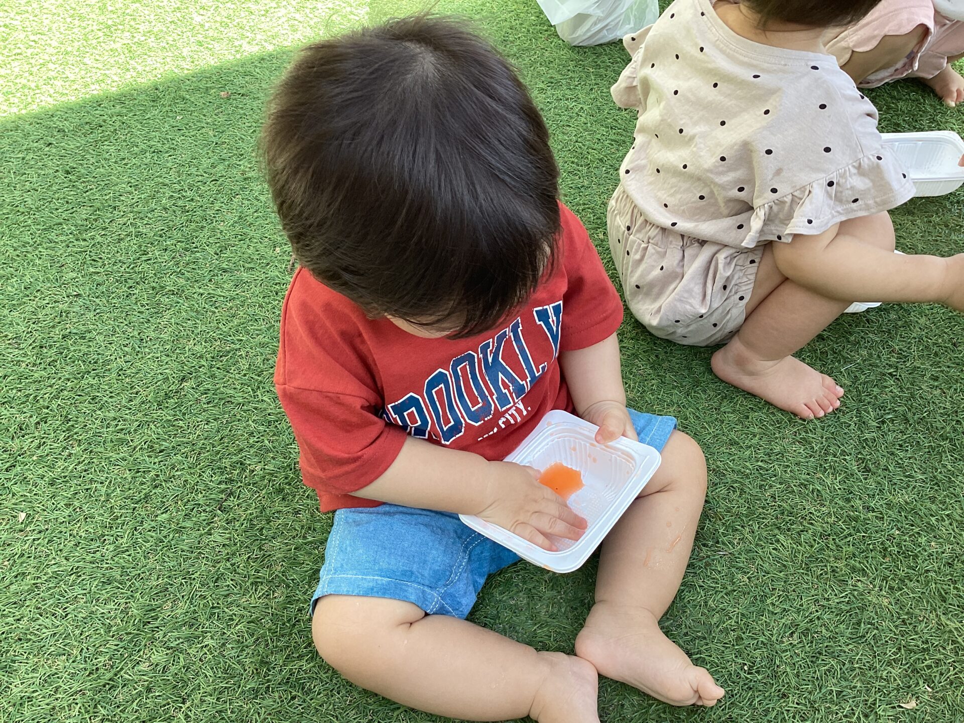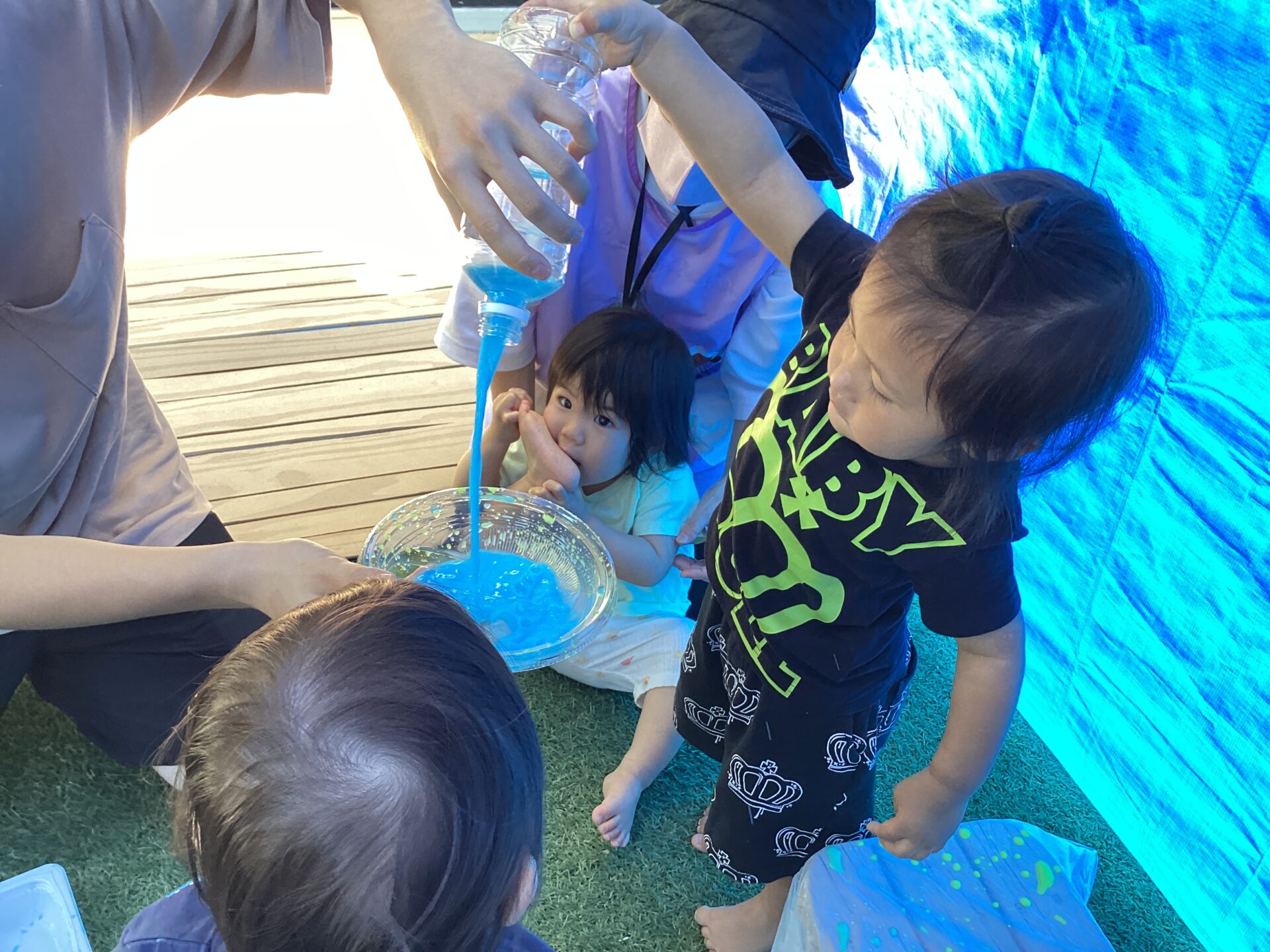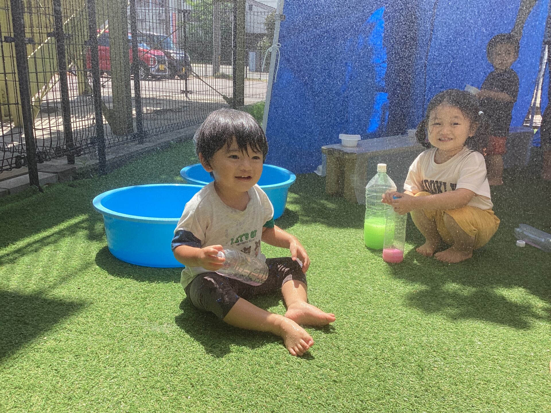 その後、うみぐみさんとにじぐみさんで芝生に溜まった色水の上でバシャバシャ足踏みをして水の冷たさや感触を楽しんでいましたよ😄子どもたちは、にじぐみさんからたくさんの刺激を受けたようです。