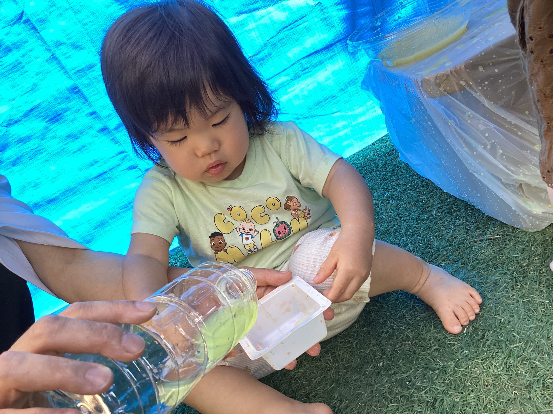 色水の入った容器をもらったAちゃんは、そのまま高いところから“じゃー!”と色水をこぼして楽しんでいました。もう一度、色水の入った容器を渡すと、今度はしゃがみ込んで低いところから“じゃー!”と夢中になって色水が下に落ちていく様子を見ていました😲