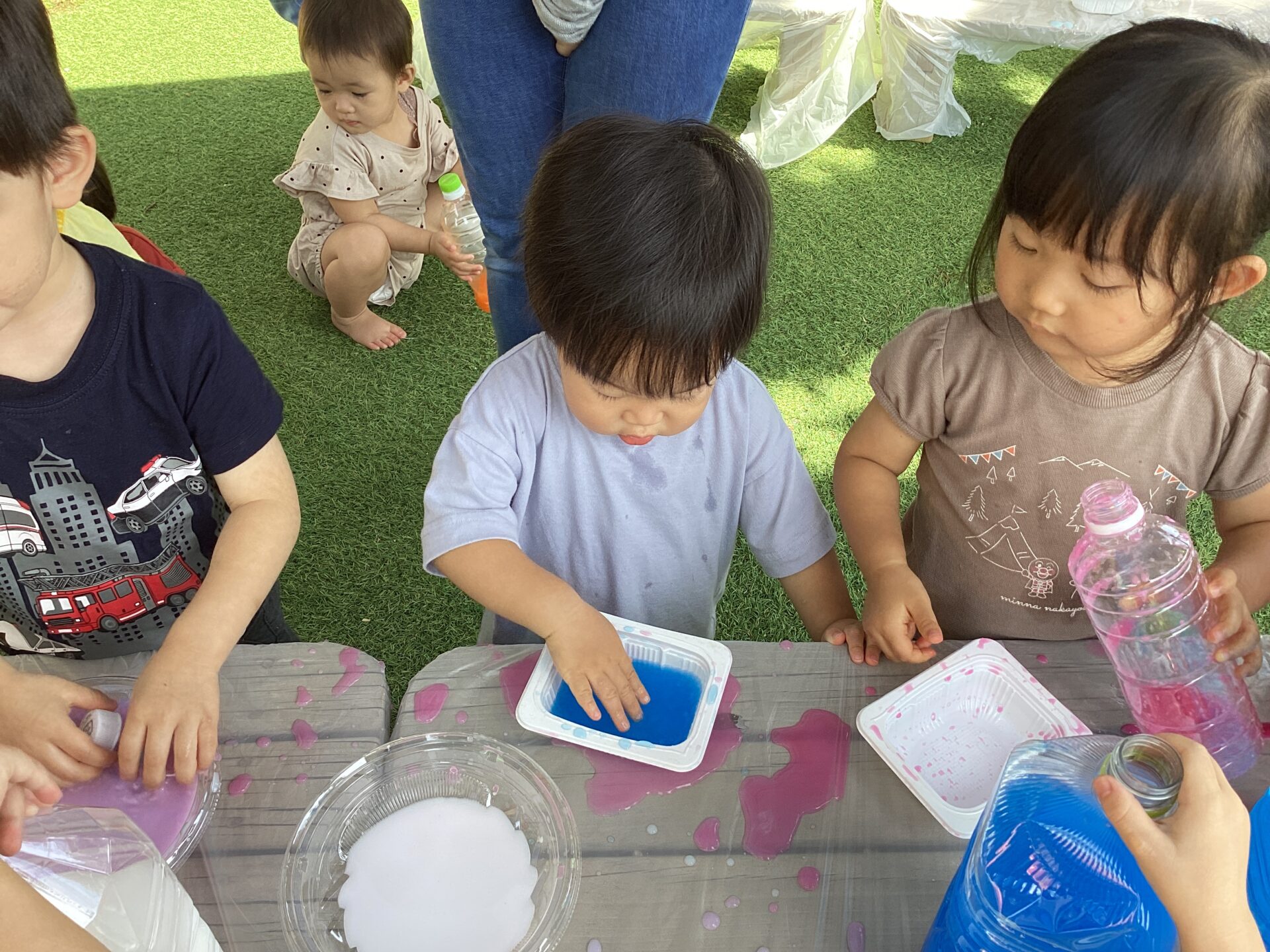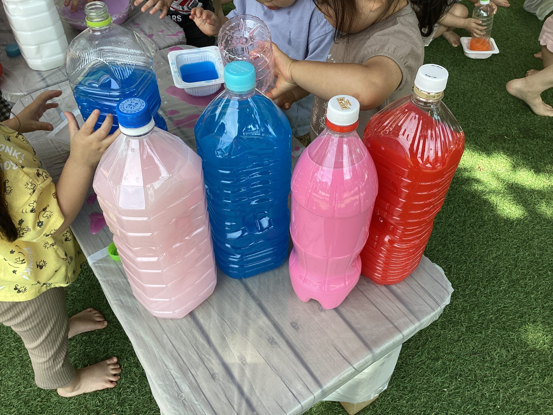 6月に入って蒸し暑い日が続いています。暑い中でも涼しさを感じる色水遊びに参加しました。