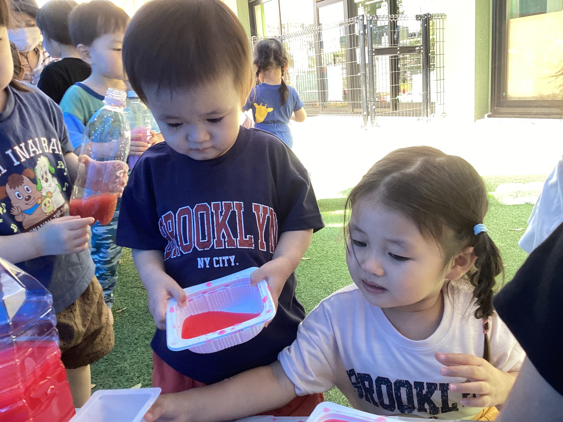 にじぐみさん(2歳児)が色水遊びをしているところにお邪魔して、一緒に楽しみましたよ♪