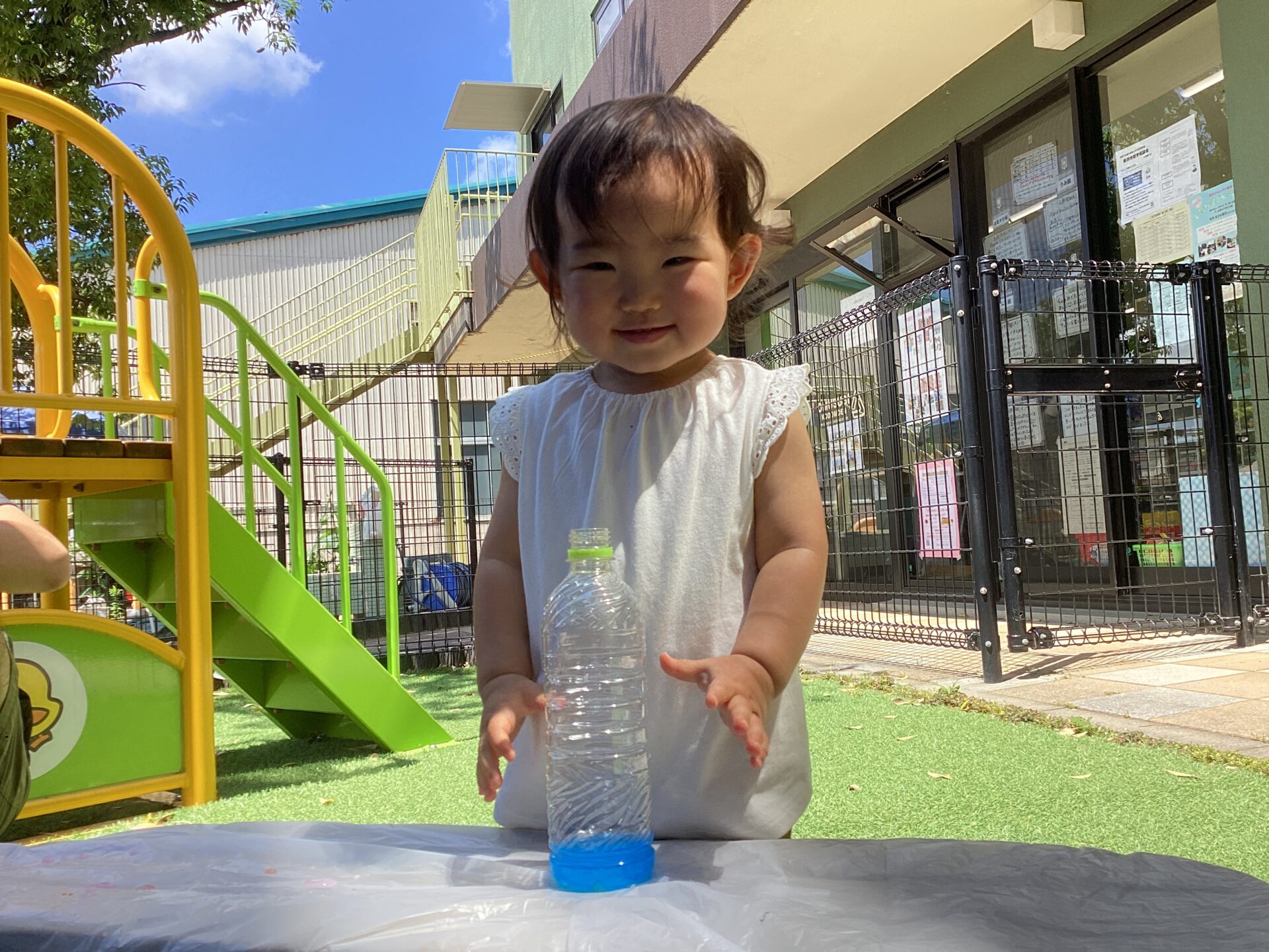 保育者がペットボトルに入った色水を「ジャーン‼」と見せると、うみ組の子どもたちは、初めて見る色水に“なんだろう~?”と動きを止めて不思議そうに見つめています😊