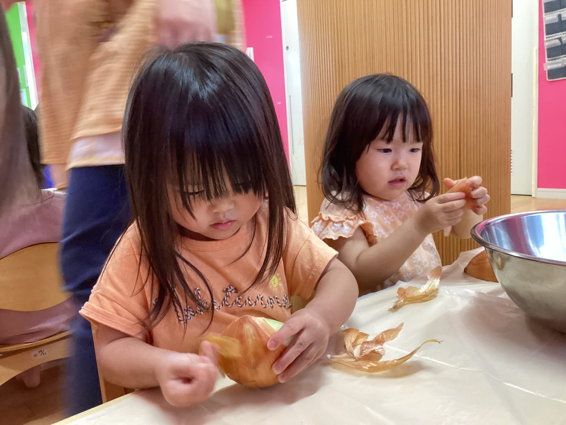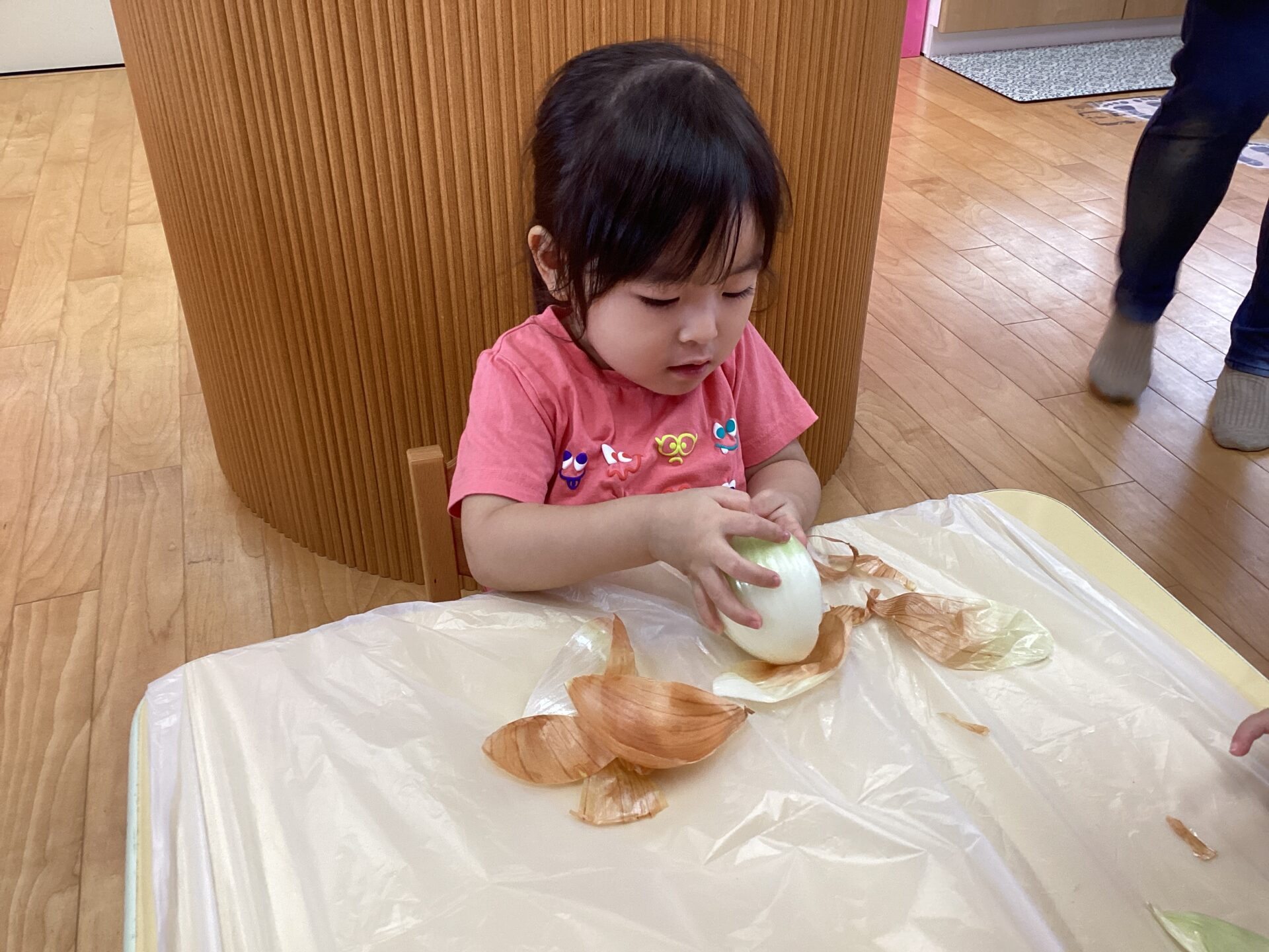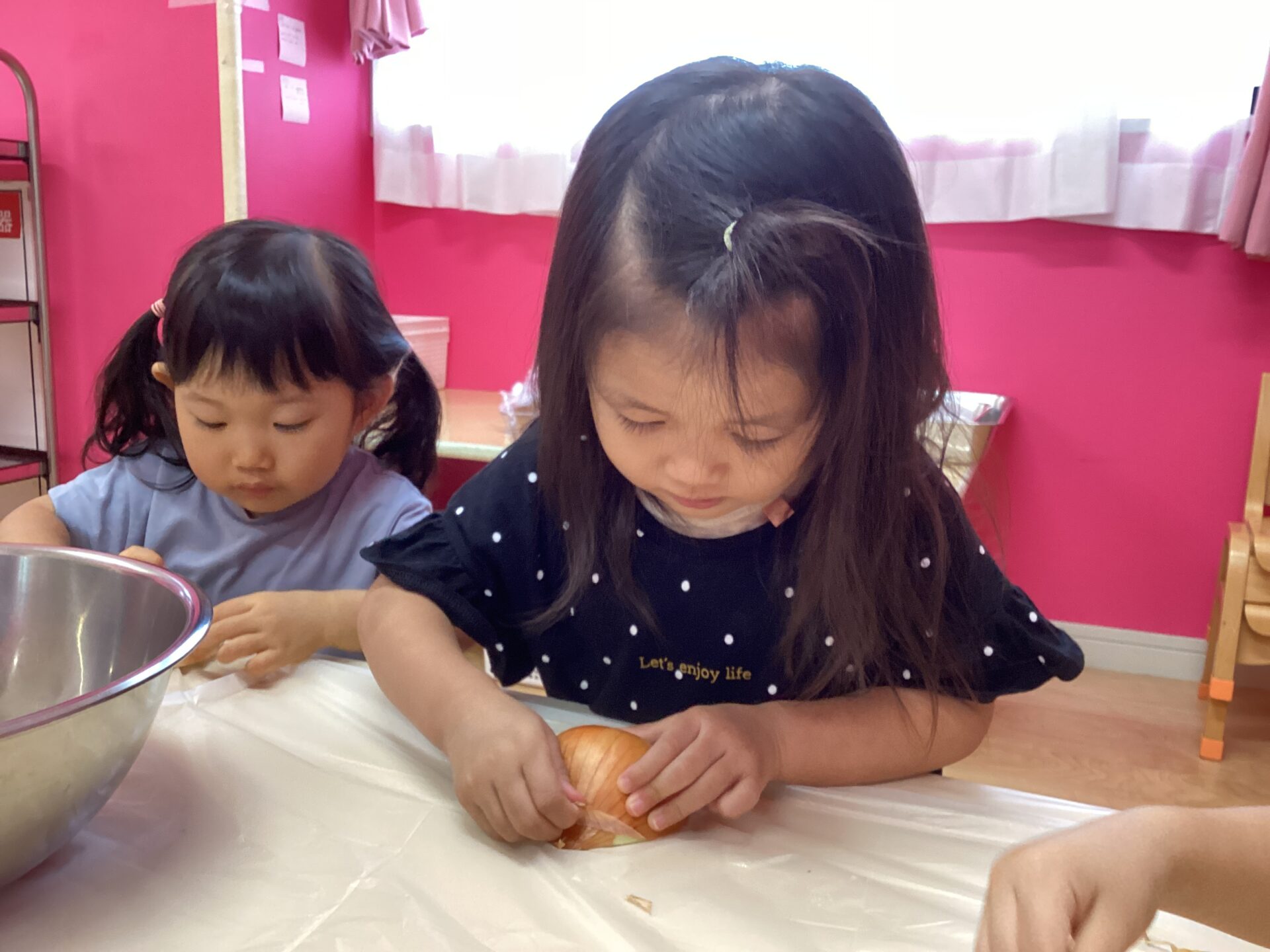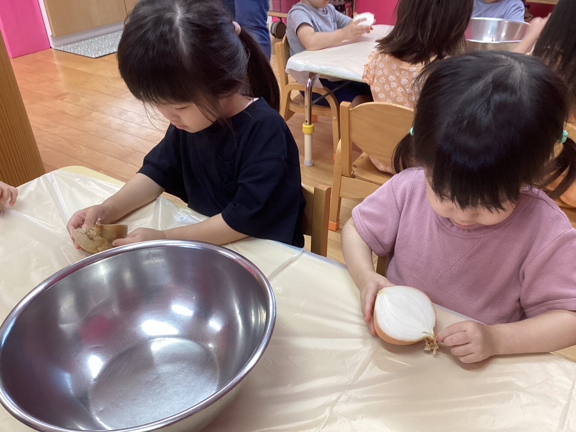 にじ組さんになって、初めて玉ねぎの皮むきに挑戦しました~!