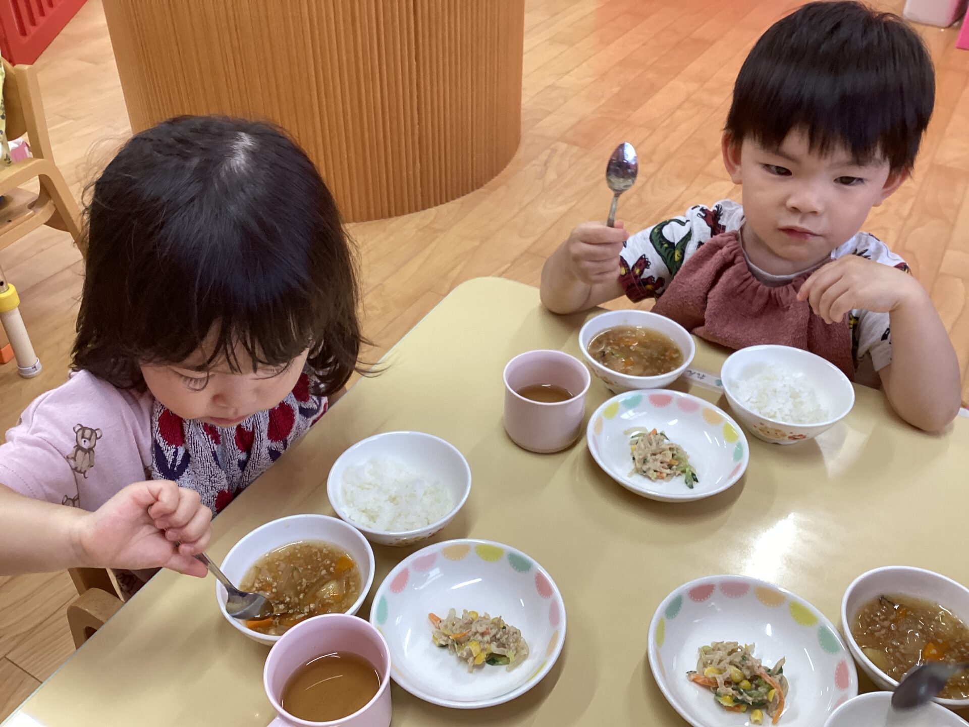 にじぐみさんが、お手伝いをした玉ねぎが給食に出ると「いただきまーす!」と、一目散に玉ねぎを探す子どもたち(#^^#)「あったー!」とにこにこでした(*^^*)
