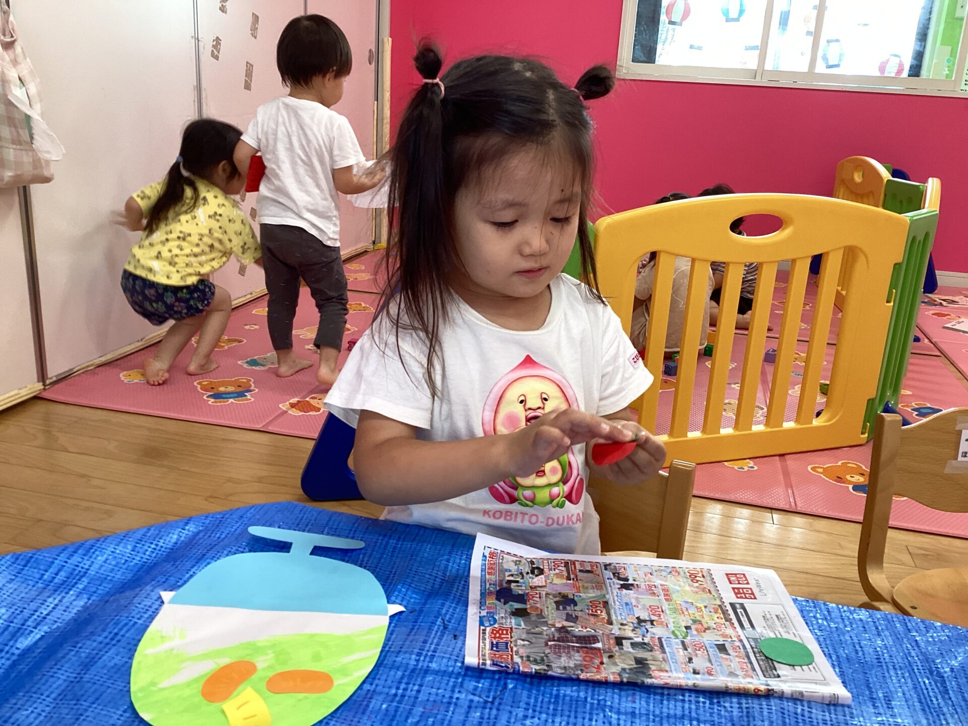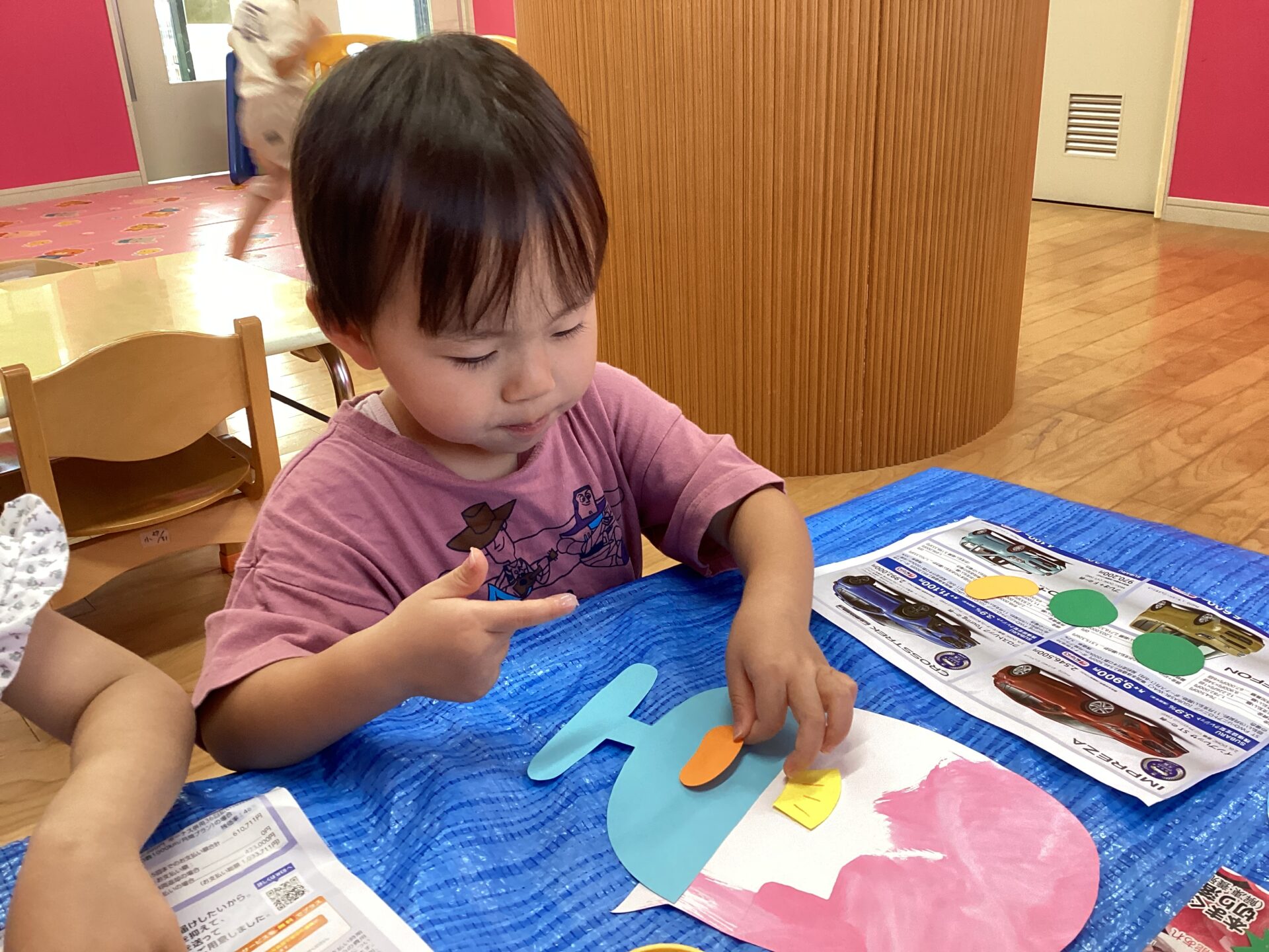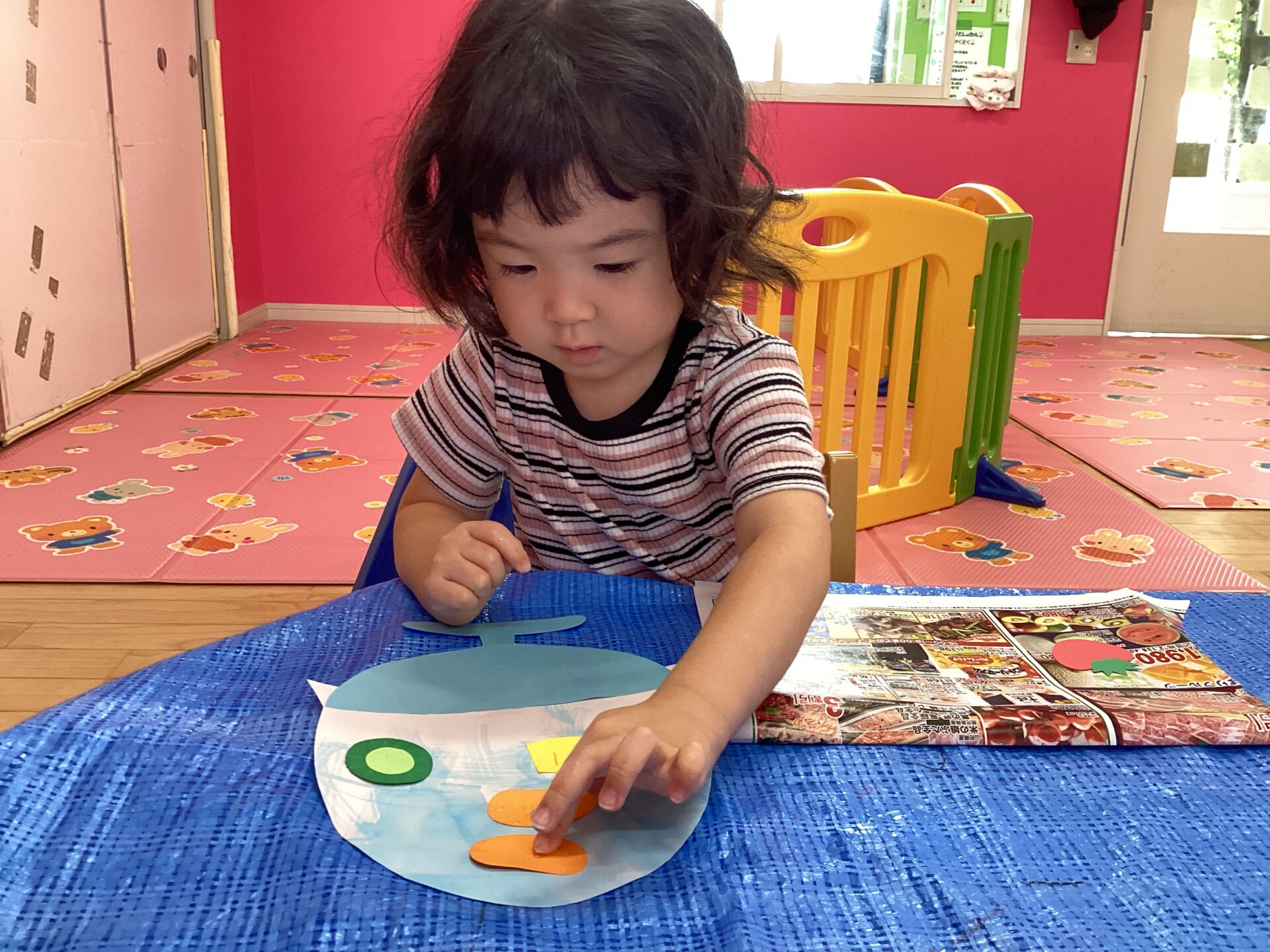 貼っているうちに顔のパーツに見えてきたのか、「これは目だよ!」「これは口〜」と