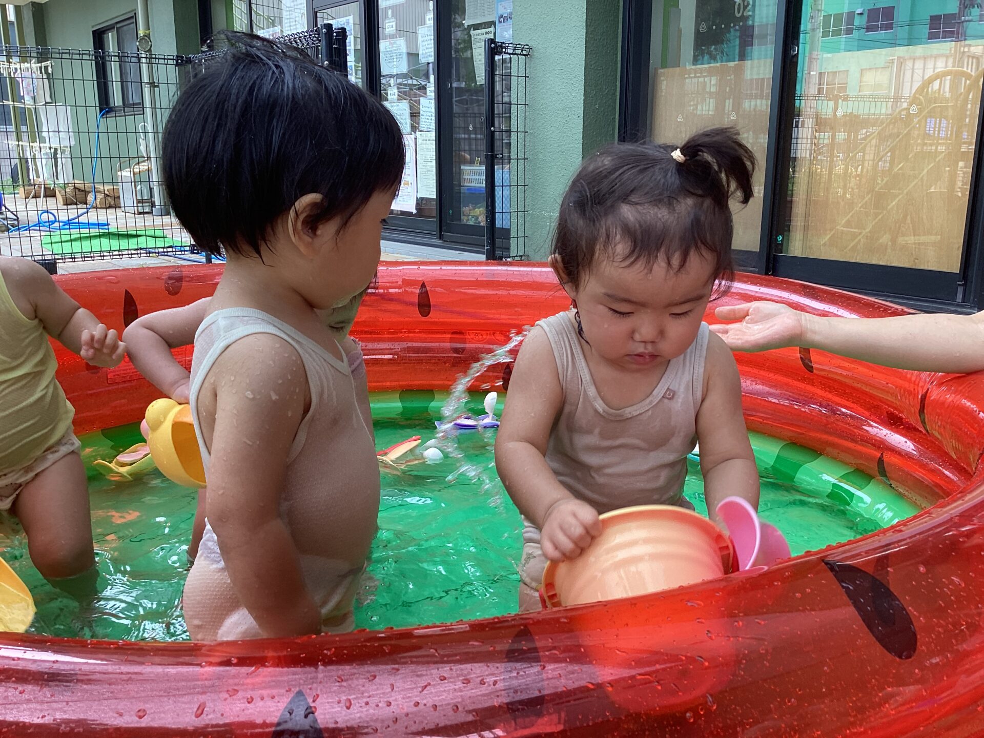 うみ組(1歳児)の子ども達にとっては、集団生活で楽しむ初めてのプール!