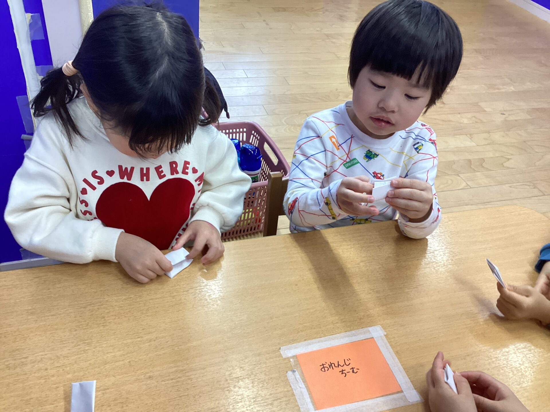 自分たちが作った御守りと全国にある姉妹園のお友達が作った御守りを合わせて、どんな作品が出来上がるのか楽しみにしている子どもたちです😊🩷