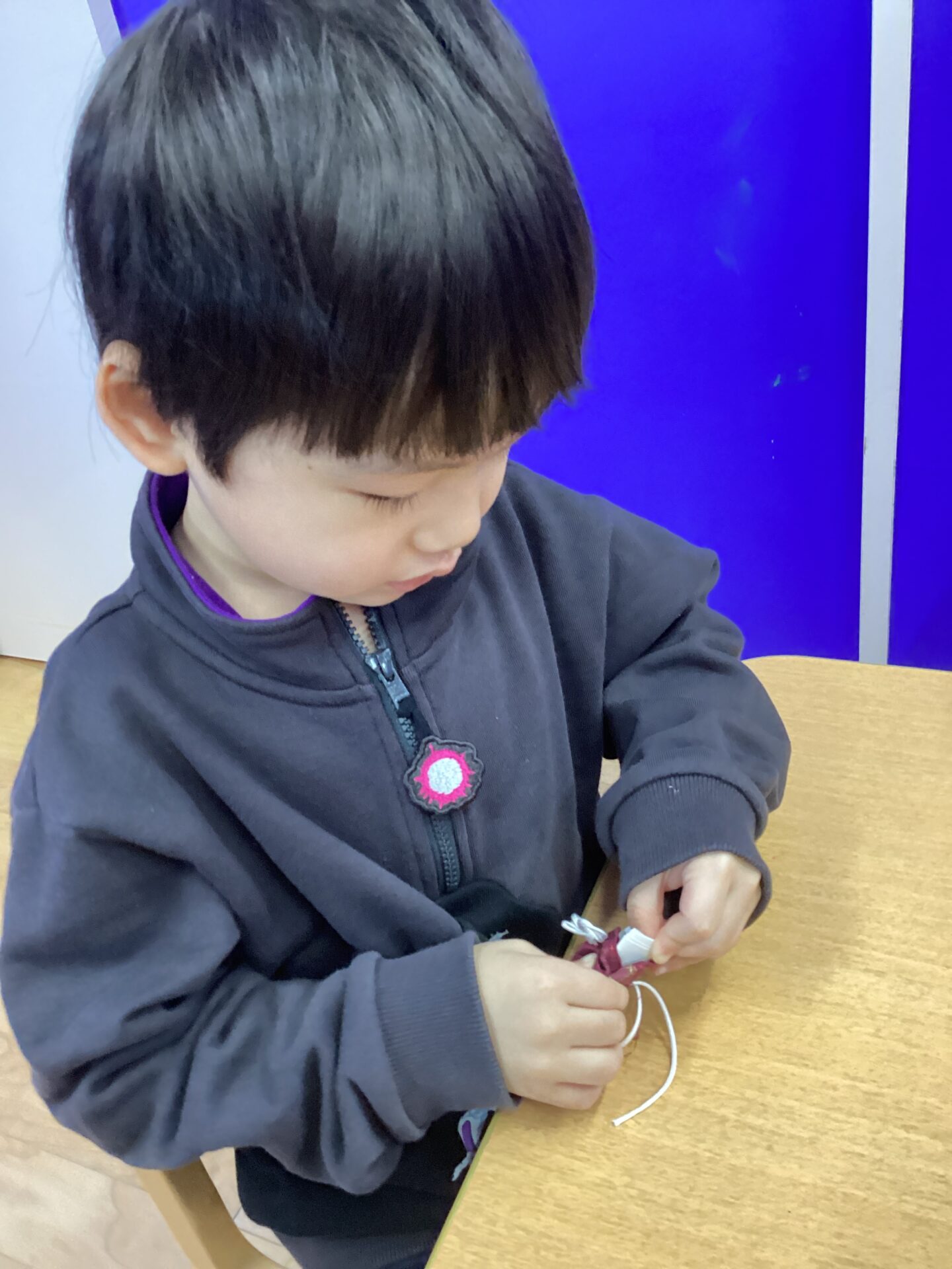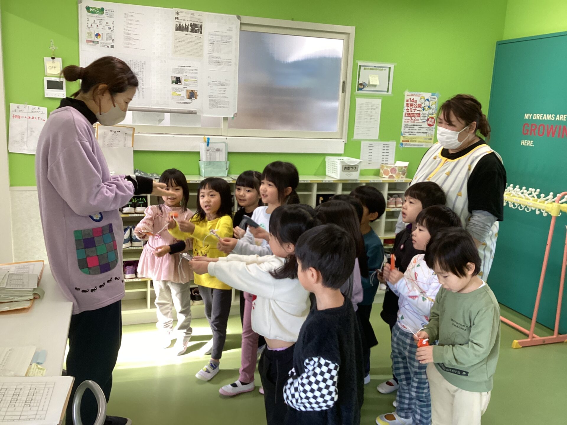 国と国のけんか(戦争)が起こってしまうと、お家が壊されてしまったり食べる物がなくなってしまうことを知った子ども達。今の幸せな暮らしや平和がずっと続きますようにと願いを込めて皆で御守りを作ることを伝えました。本物の御守りを見せると、「私(ぼく)、持っている!」と御守りを身近に感じている子も多くいて、御守りを作ることが楽しみな様子でした。