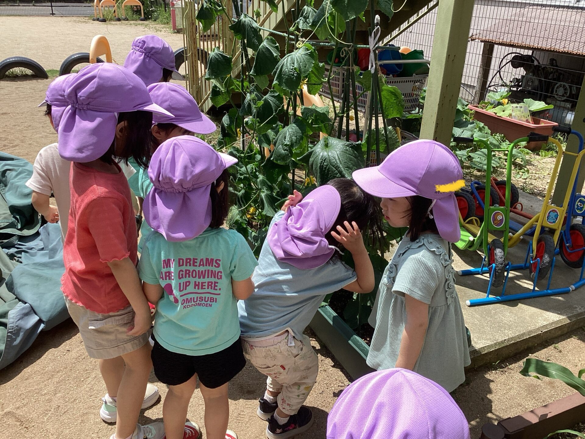ある日、花の横に小さい赤ちゃんきゅうりがなっている事に気が付き「赤ちゃんきゅうりだー😆」と目をキラキラさせながら話していてとても可愛かったですよ💛