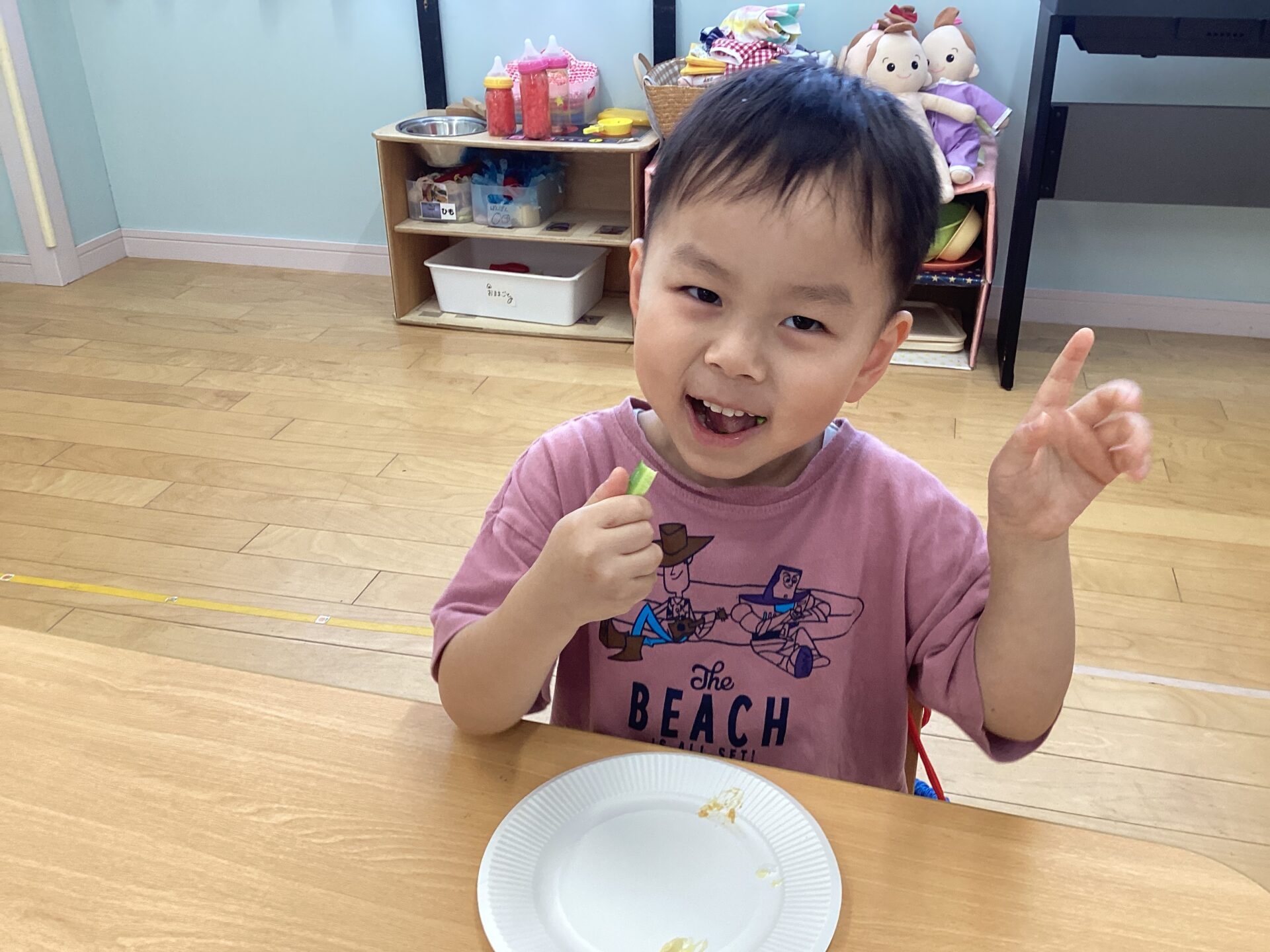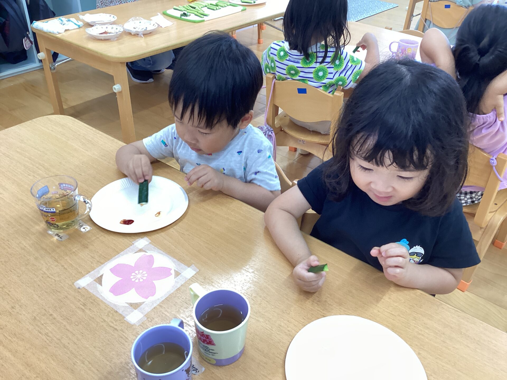 給食で、きゅうりが出ると「ゆきぐみさんのかなー」とニコニコで食べています☆