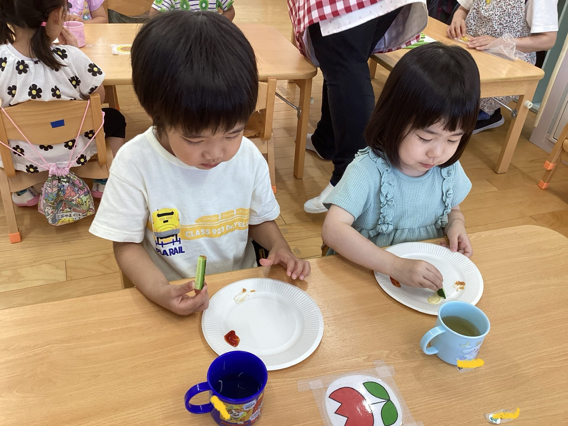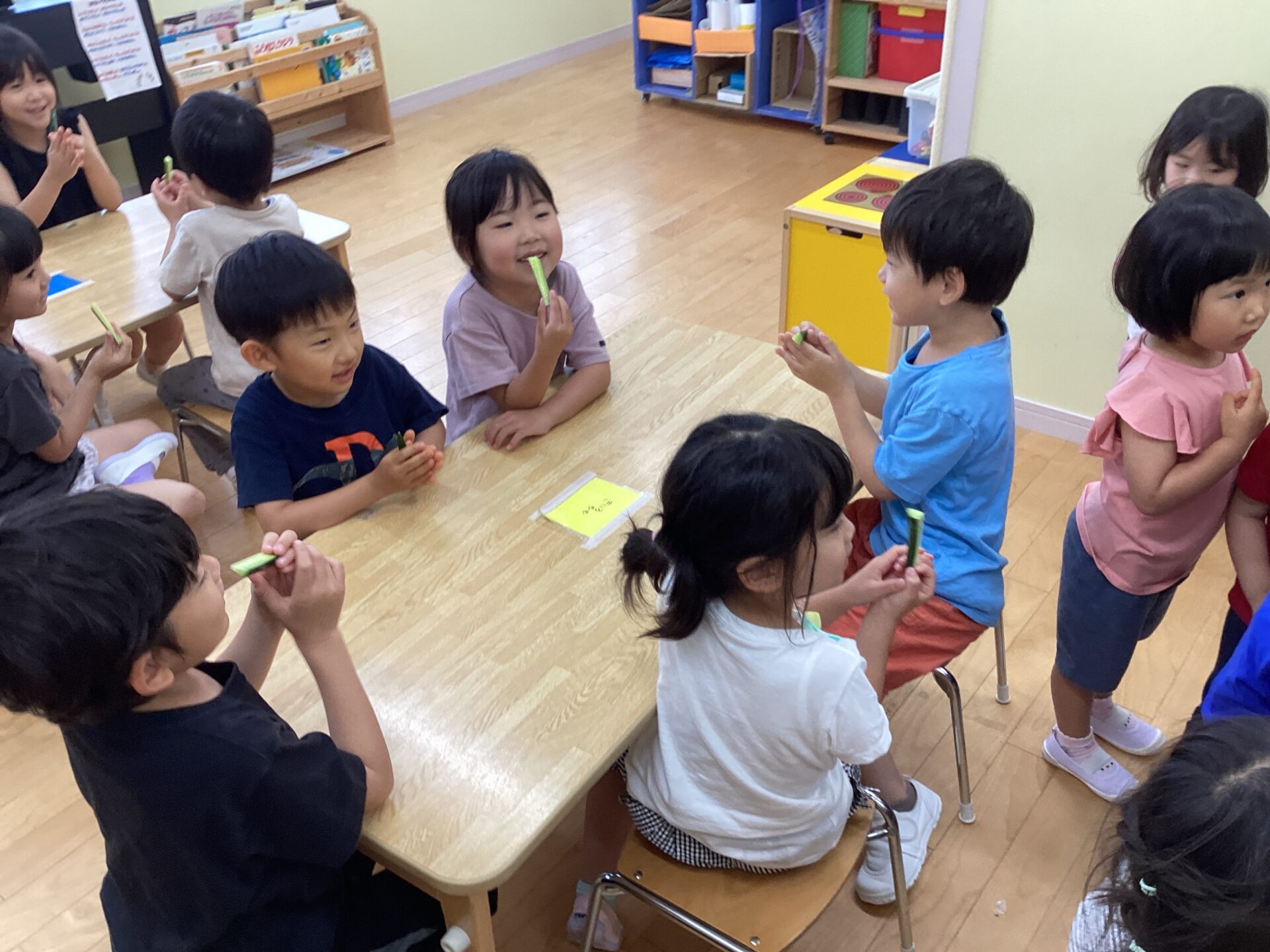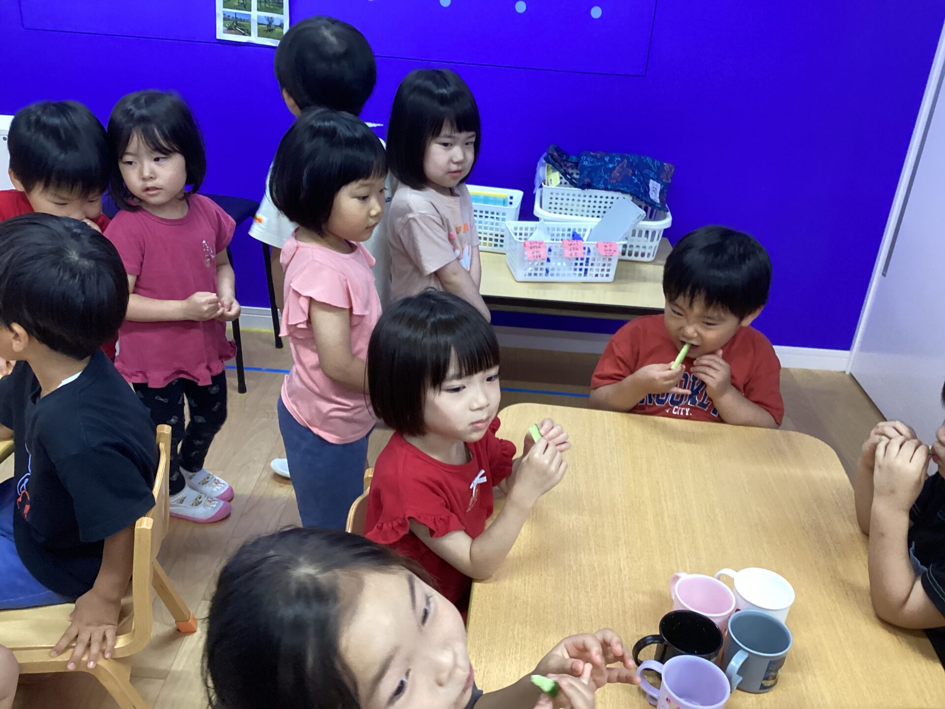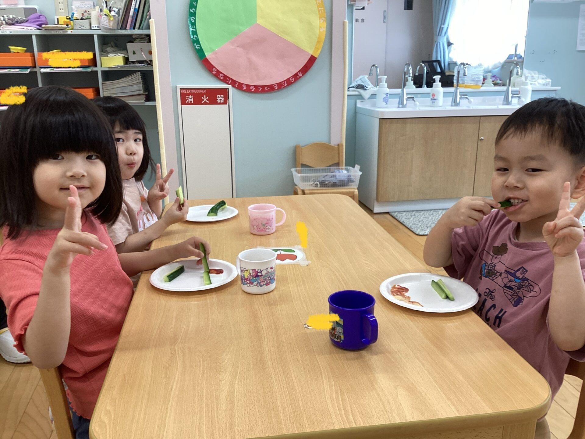 きゅうりがグングン大きく育ち、「もうすぐ収穫できそうだね♪」と子ども達と話していると、「ケチャップで食べたい!」「お味噌がいいんじゃない?」「お塩!」「マヨネーズ!」「醤油が良い!」と色々な調味料を付けて食べてみたいとの声が🥰